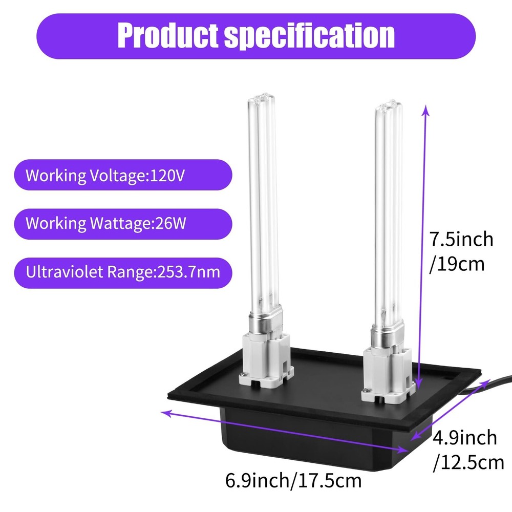 HVAC UV Light R2000 110V 26W Dual UVC Lamp Air Purifier for Whole House AC System Air Conditioning Duct Filter(HVAC-26WUV) Product Details Model: HVAC-26WUV Brand: Tesiplz MPN: HVAC-26WUV UPC: 085353516125 EAN: 0085353516125 Brand: Tesiplz Color: Black Indoor/Outdoor Usage: Indoor Power Source: Corded Electric Control Method: Touch Brand: Tesiplz Color: Black Indoor/Outdoor Usage: Indoor Power Source: Corded Electric Control Method: Touch Light Source Type: ULTRAVIOLET Voltage: 1.1E+2 Volts (DC) Shape: Tubular(T) Included Components: HVAC UV Light Number of Items: 1 Wattage: 26 watts Manufacturer: SAFETY HOME APPLIANCE CO., LIMITED UPC: 085353516125 Model Name: HVAC-26WUV Item Weight: 1.23 pounds Product Dimensions: 8.91 x 5.61 x 3.71 inches Country of Origin: China Item model number: HVAC-26WUV Batteries Included?: No Batteries Required?: No Date First Available: July 24, 2024 Advanced - Upgrade your HVAC system with the cutting-edge HVAC UV Light, specially designed for compatibility with D200 UV R18 R18D R2000 lamps. This UV light boasts a 26W power output and emits 253.7 nm wavelength for enhanced air purification in systems up to 5 tons. Easy Installation - Easily install the HVAC UV Light on your ducts or furnaces in just 15 minutes or less. Follow the simple steps to set up this device, ensuring optimal performance for your air purification needs. Essential - Breathe in cleaner air with this efficient HVAC UV Light, designed to promote air quality and create a good environment for you and your family. Efficient - Enhance your HVAC system's efficiency and air quality with this UV Light that combines ease of installation with powerful performance. Warm Tips - Avoiding direct eye contact with the UV light. The long lifespan of the bulbs means you can enjoy prolonged air purification without frequent replacements, making it a cost-effective solution for maintaining clean indoor air.