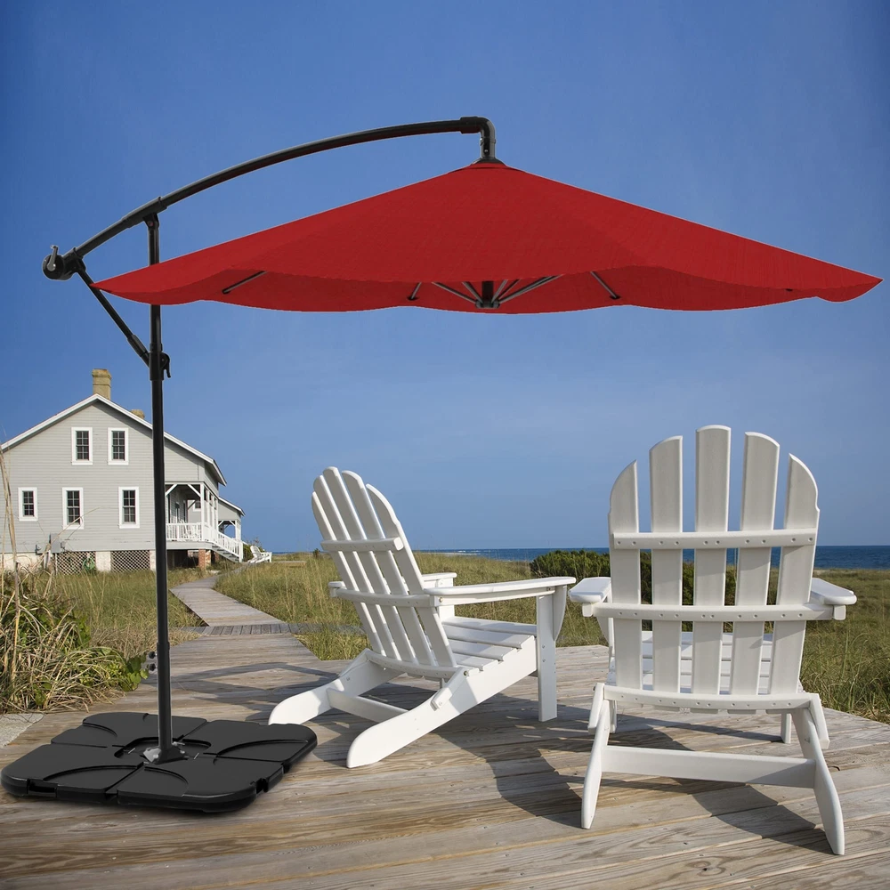 The 4-Piece Weighted Umbrella Base by is perfect for securely supporting your cantilever patio umbrella! This fillable base is meant to be used with offset or cantilever umbrellas with a cross bar base. Each plate features a spout to help with quick and convenient filling with sand, as well as easy cleaning and storage. The plates are made of sturdy High Density Polyethylene (HDPE) plastic and can hold up to 55 pounds of sand for a total of 220 pounds to ensure your umbrella will stand up to the wind and elements. With a convenient foldable handle on each plate, they are easy to move and position after they are filled. 4 PLATE DESIGN- This 4-piece fillable plate set is designed to securely support your cantilever or offset umbrellas. It is not for use with umbrellas featuring a single pole or cross bar bases with flanges. 4 Interconnecting plates lock in place with metal pins to keep your umbrella upright and secure. STURDY AND DURABLE- Each plate in this 4-piece base is made of durable HDPE plastic and can hold up to 55 pounds of sand for a total of 220 pounds. The umbrella base is strong enough to stand up to the elements in most weather conditions. EASY TO FILL SPOUT- The plates feature an easy to fill spout for quick and convenient filling with sand. The spouts also help to easily empty the plates for quick cleaning and storage during the winter or while not in use. FOLDABLE HANDLE- All the plates in the set features a folding handle that makes them easier to move and position once each unit is filled with sand. The handle then folds out of the way when not in use to prevent damage. PRODUCT DETAILS- Materials: HDPE Plastic. Single Plate Dimensions: 20” L x 20” W x 2.75” H. Assembled Dimensions: 42” L x 42” W x 2.75” H. Single Plate Capacity: 55 Pounds. Overall Capacity: 220 Pounds. 4 Pieces. 4 Plates and 4 Metal Connecting Pins. Crossbar Base Not Included.