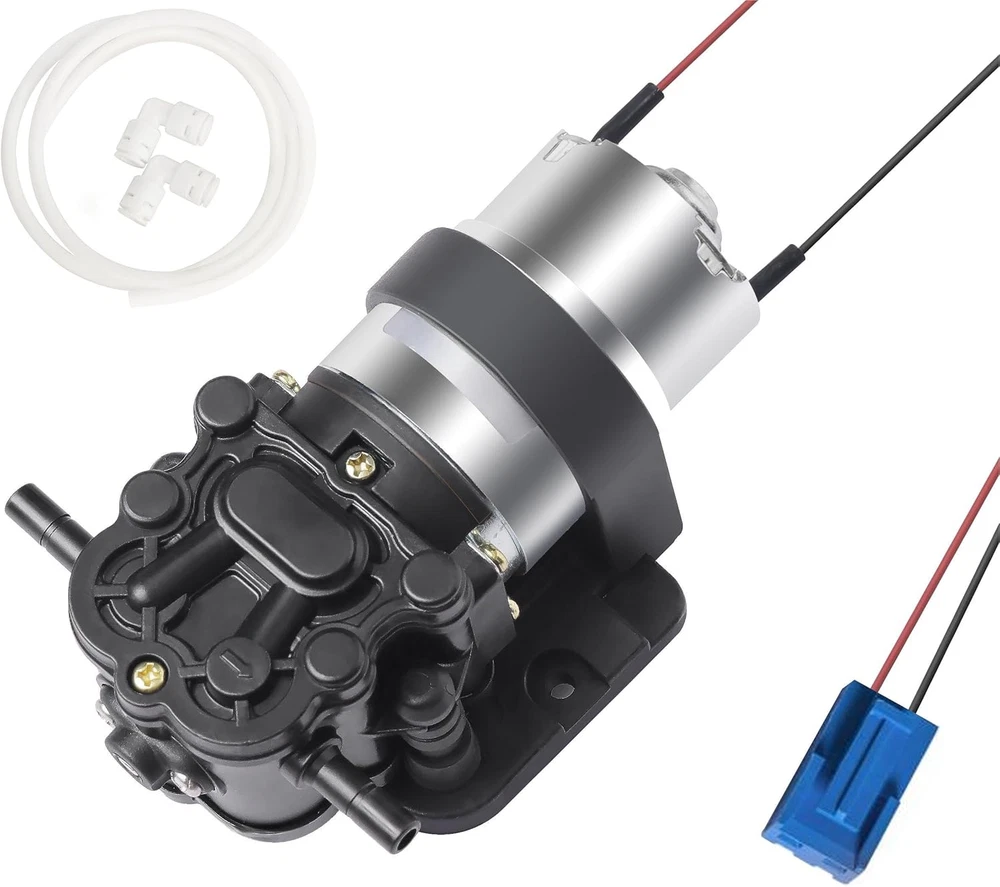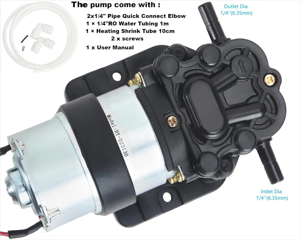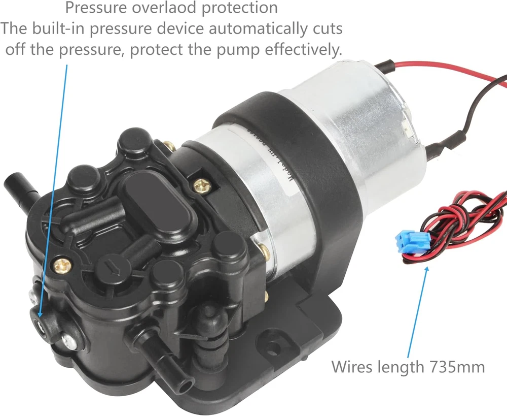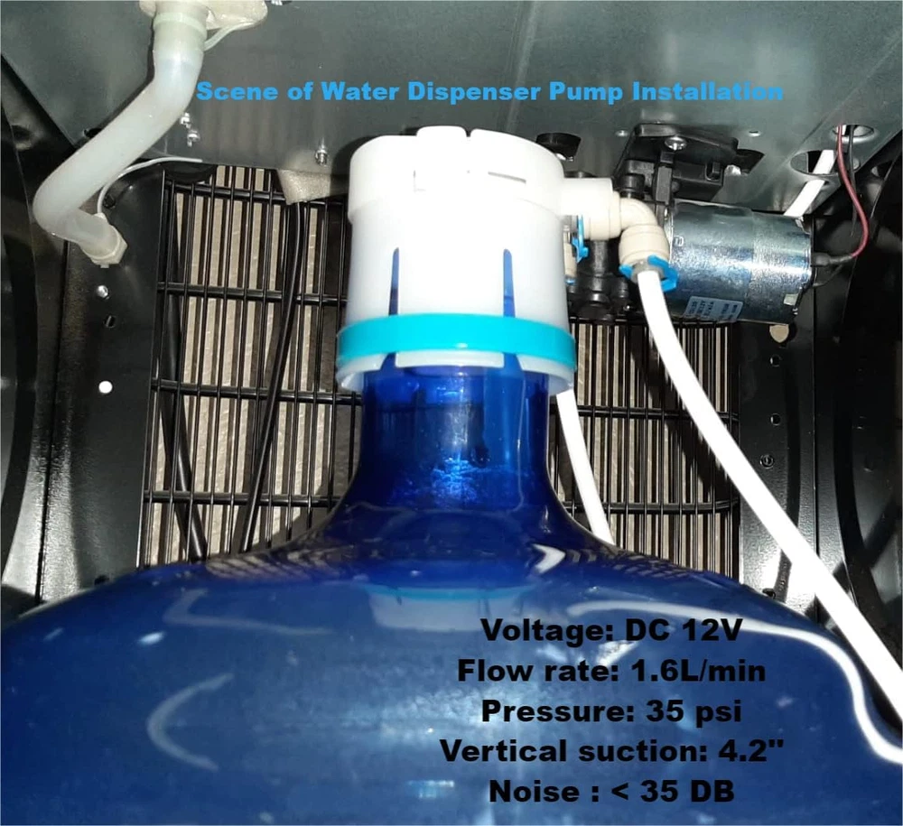 Rated Volt: DC 12V, Max flow rate: 1.6L Pressure: 35 psi. It doesn't mean 1.6L/min at 35PSI.Self priming function allows it to be mounted above water tank, Vertical Suction Lift: 3.3ft (1m). Amp Draw 0.35-0.5A Please do not use AC power source. This water dispenser pump come with pipe quick connect elbow, RO water tubing,heating shrink tube and screws. Full accessories make the installation easily.Inlet and Outlet: 1/4’’ . Size: 4.93’’x 3.1’’ x 2.38’’. Item weight: 500 grams Pump with self-priming function: Max. Vertical Suction Lift: 6.5ft(2m). Max. Flow: 1.6LPM, Head(High Lift):≥100ft (30m). Built-in pressure valve automatically shut-off when the pressure exceed. Bigger size mount support the whole pump body, more stable when install on water dispenser, reduce vibration and noise effectively. Please connect the water pump correctly. Red wire for positive pole and black wire for negative pole. Product Description DC 12V Water Dispenser Pump This water dispenser pump has self priming function, it is specially designed for bottom-loading Water Dispenser, Water Coolers, Water Purification , Hot & Cold Water Dispenser, Refrigerator, Ice Maker, Coffee Machine, Fish tank. Why do I choose it? Easy insatllation Stable performance Food Grade, Long life This water pump has built-in pressure valve automatically shut-off when the pressure exceed. Protect the pump and avoid damage to water dispenser. High-quality motor ensure durable and stable work. Low heat: The pump can work continuously for a long time and won't be hot. Safe Food Grade, Stable performance, Long life Rated Volts DC 12V Amp Draw 0.35-0.5AMP Max Flow rate 1.6 L/min Pressure 35PSI Vertical Suction 4.2ft (1.3m) Working Temperature Range 0~70°C /32~158°F Noise <35DB Inlet/Outlet 1/4" (6.5mm) Pressure Over-load Protection Built-in pressure valve automatically shut-off when the pressure exceed. Effectively protect the water dispenser and pump and avoid leakage caused by excessive pressure. Bigger Mount More Stable Lower Noise Bigger size mount support the whole pump body, more stable when install on water dispenser, reduce vibration and noise effectively. Full Range of Accessories Easy to Install The pump come with qucik connect elbow, silicone tube,screws and heat shrink tubing for your easy and quick installation on water dispenser. Package Includes: 1 x Water Dispenser Pump 2 × 1/4" Pipe Quick Connect Elbow 1 × 1/4"RO Water Tubing 1m 1 × Heat Shrink Tube 2 x screws 1x manual Easy Replacement for Your Drinking Water Equipment This pump will be a good replacement if your water dispenser's old pump is similar to it. It is quite and durable, give more smooth operation on your water dispenser. Warm Tips: Before make deicision, you may check the pump size , voltage, flow rate , loading current , suction lift and flow head. If they are simialar to your old pump. It should be a good replacement for your water dispenser. Please connect the pump correctly. Red wire for positive pole and black wire for negative pole. If the connector of leads is same, just plug in the connector of water dispenser. If not ,cut the power cord from old pump and connect it to the new one. It is better to leave the red wire and black wire about an inch from the new pump. Please try to keep the pump stable when install. Improper installation may generate vibration and noise during operation. The pump can not run continuously more than 6 hours.