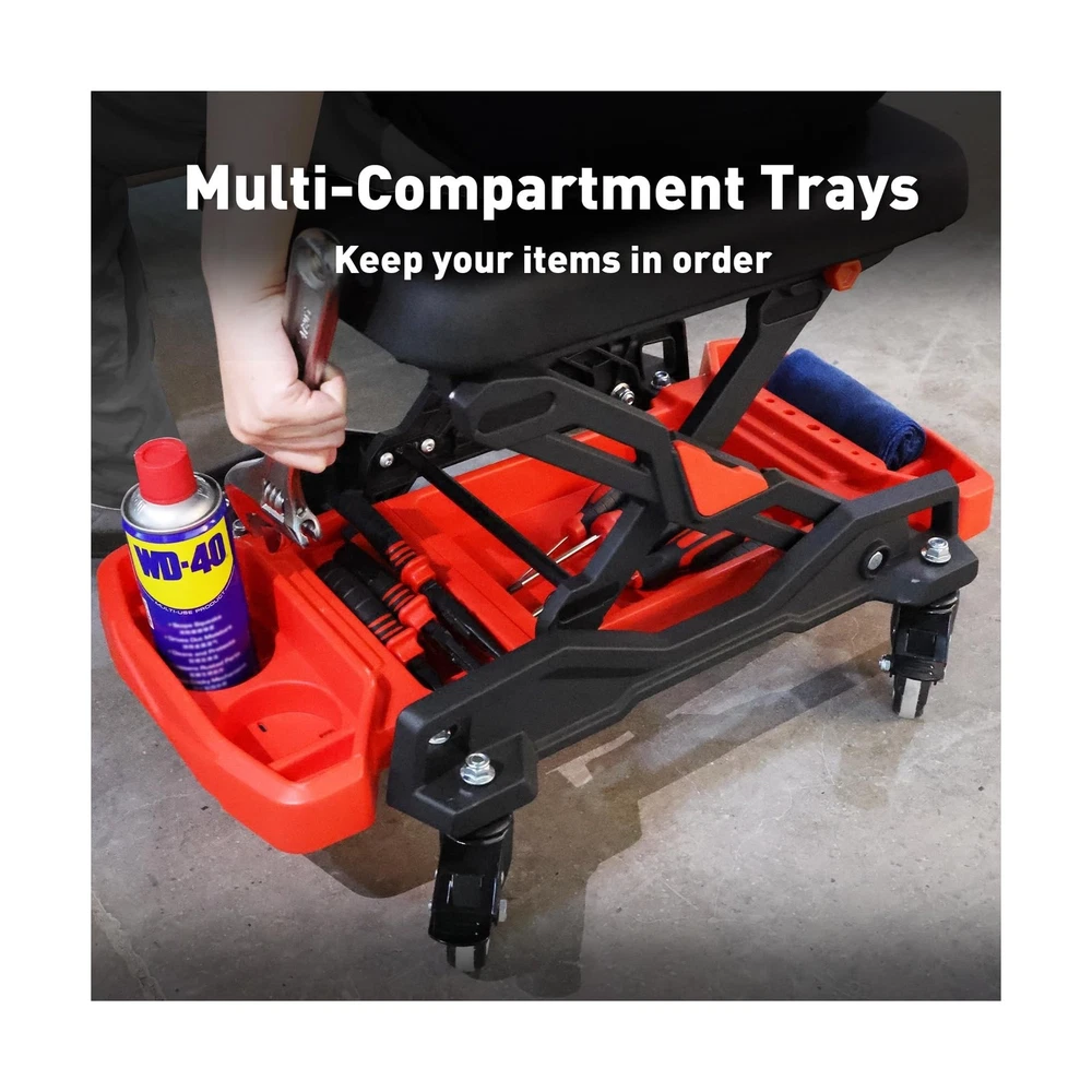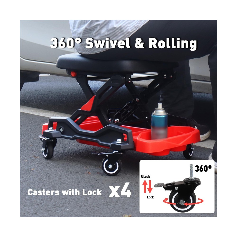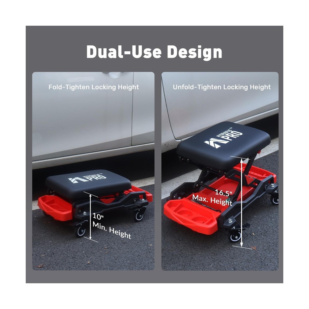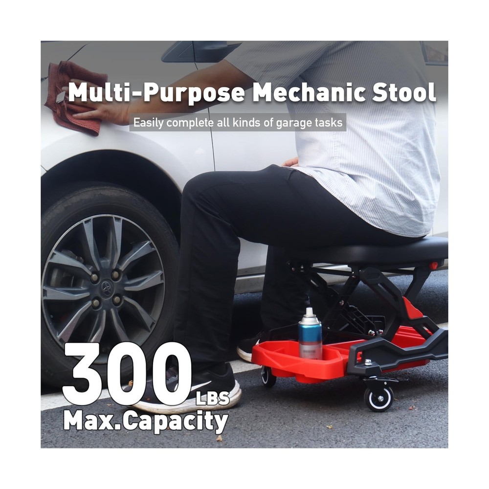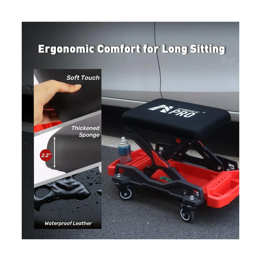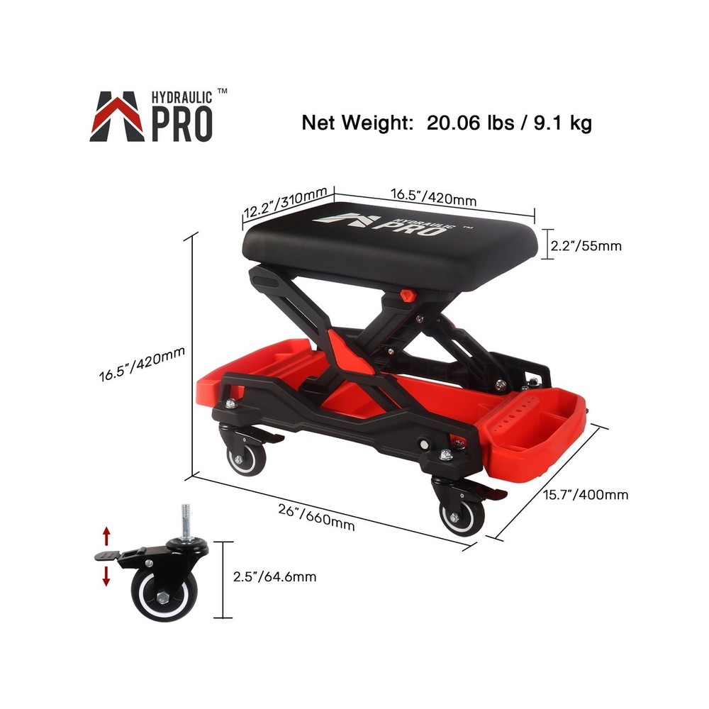 HYDRAULIC PRO Automotive Creeper Seat with Rolling Wheels, 300 LBS Capacity Mechanic Stool, Heavy Duty Garage Stool with Soft Padded Cushion and Tool Trays, Foldable Design for Easy Storage Description Features: 360 MobilityMechanic creeper with 4 swivel wheels, each caster comes with a locking brake for effortless positioning. The 2.5 inch large-diameter wheels smoothly navigate uneven surfaces in garages, workshops, gardens, and indoor spaces. Foldable DesignQuick-lock knob for effortless setup on this foldable mechanic stool. Folding to just 10 in for compact storage, while extending to an ergonomic 16.5 in working height to prevent back strain during repairs. Can Holder & Tool TraysThe garage seat with multi-compartment organizer to neatly store tools of all sizes. This mechanic stool keeps everything within arm's reach to minimize movement and maximize repair efficiency. Waterproof & Soft CushionFeatures a premium 2.2 inch (55 mm) high-density foam cushion that retains its shape for lasting support. The surface is covered with waterproof and oil-resistant leather, and dirt can be easily wiped. 300LBS Heavy-Duty CapacityEngineered with reinforced plastic base and aluminum alloy brackets for maximum durability. This shop chair delivers exceptional load-bearing performance, ideal for automotive repairs, tire changes, and car cleaning. Product Details: Product Dimensions: 26"D x 15.7"W x 16.5"H Color: Black Frame Material: Aluminum Seat Material Type: Plastic Brand: HYDRAULIC PRO Product Dimensions: 26"D x 15.7"W x 16.5"H Color: Black Brand: HYDRAULIC PRO Size: 15.7 inches (W) x 26 inches (L) x 16.5 inches (H) Style: mechanic stool Furniture Finish: Unfinished Leg Style: Square Assembly Required: No Number of Pieces: 1 Assembly Instructions Description: No assembly required Number of Items: 1 Item Weight: 23.6 pounds Manufacturer: HYDRAULIC PRO Date First Available: November 27, 2024 Delivery We Do Not Ship Outside of the Continental US. Return Policy All items qualify for returns within 30 days of receipt. Seller is responsible for return shipping on any item that is not damaged. Feedback We take our reputation seriously, we buy and sell online, so we understand the value of trust. If you are unsatisfied with your order, please contact us and we will work with you to resolve it to your satisfaction.