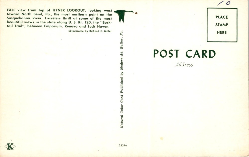 The postcard depicts a fall view from the top of Hyner Lookout, looking west towards North Bend, Pennsylvania, which is noted as the most northern point on the Susquehanna River. The area is known for its stunning views along U.S.