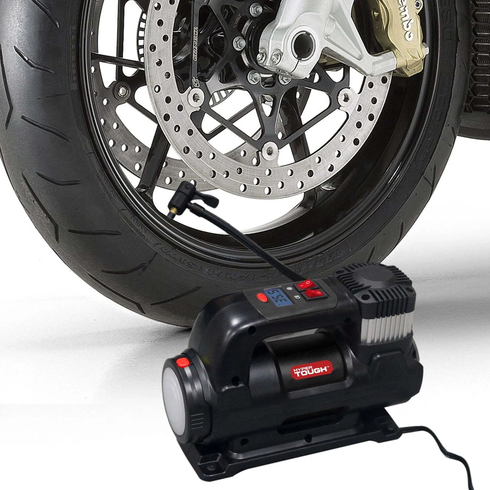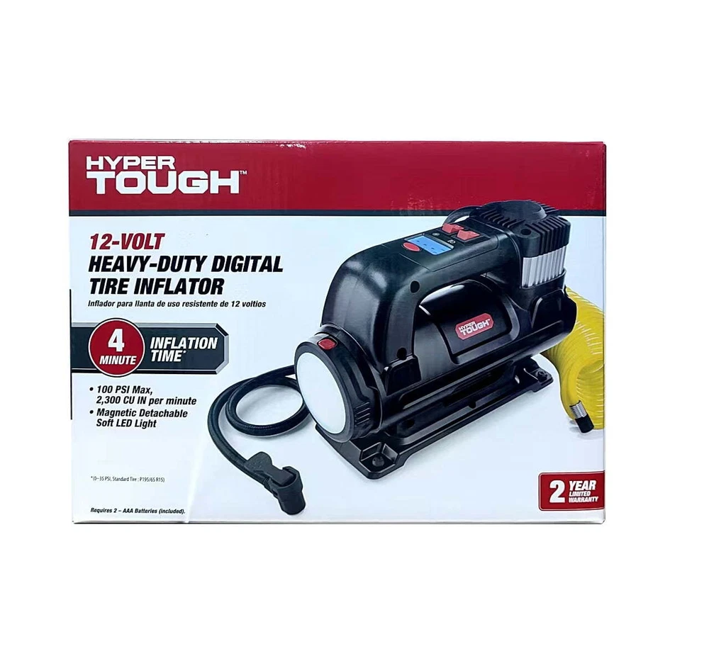 Hyper Tough DC 12V Heavy Duty Direct Drive Digital Tire Inflator. 1. Quick Inflation Time : Inflate195/65R 15" car tire from 0 to 35ps≤4'. 2. Magnetic Detachable Soft LED light: For nighttime emergencies and emergency road repair. 3.Easy to use: Just plug the car tire inflator to the 12V cigarette lighter socket and its powered by the vehicle. 4. LCD Digital Display with backlight -The inflator for car tires features a LCD digital display, ideal for when working in the dark. 5. Units available: PSI, KPA, BAR, the max working pressure is 100PSI. 6. Multiple Uses-The inflator comes with a 10ft power cord and 2 extra nozzles, which makes it perfect for cars, motorcycles, bicycles, sports balls, air mattress, water toys. 7. Portable-The car tire inflator comes with a compact design, you can put it in your automobile, easy to carry around, use it anytime anywhere. 8. Extra Coil Hose - Yellow coil air hose 490cm in length with twist disconnect. 9. Direct Drive Motor - Powerful direct drive motor (air cooled).10. Included Carring Bag - Good for Storage. On Dec 9, 2024 at 07:14:26 PST, seller added the following information: