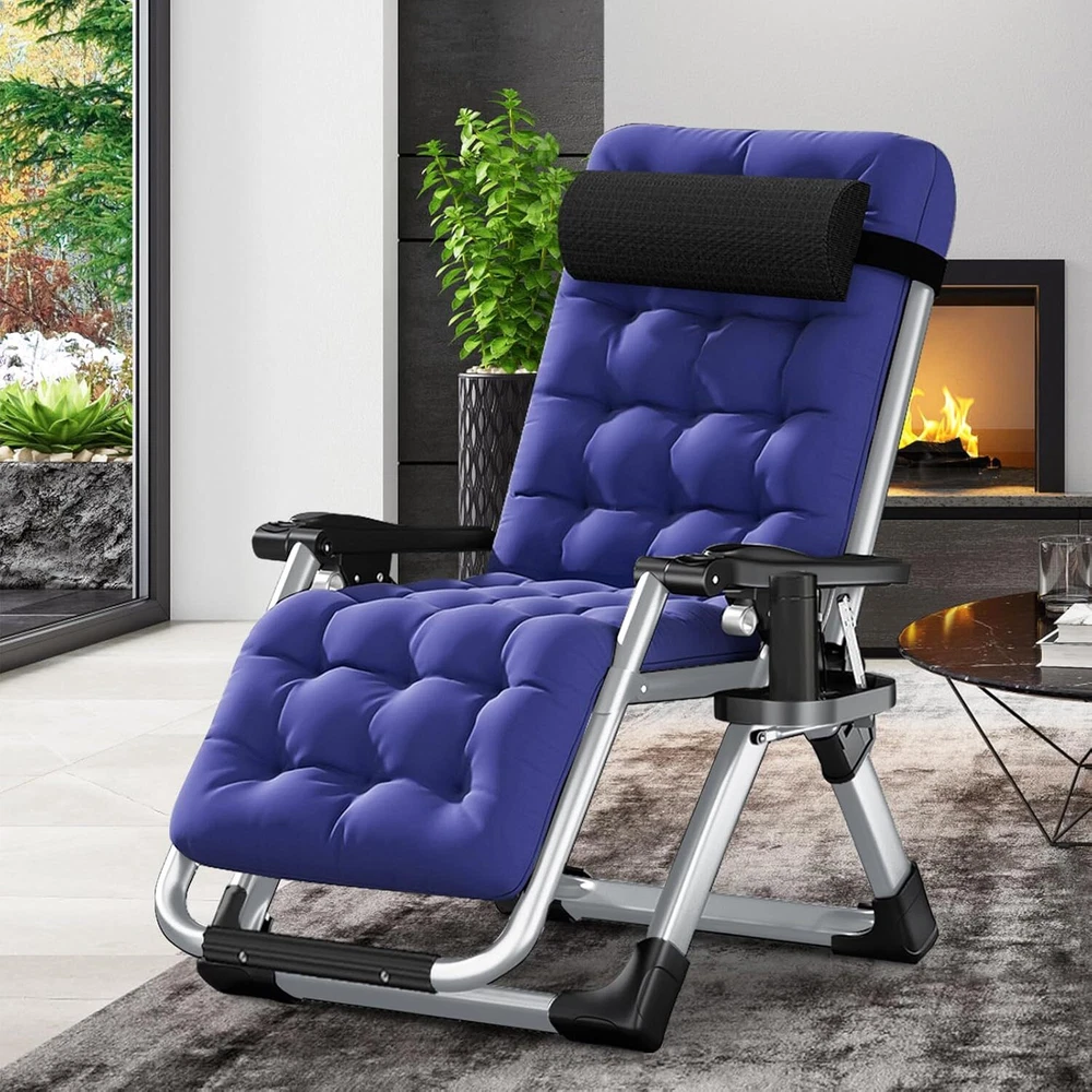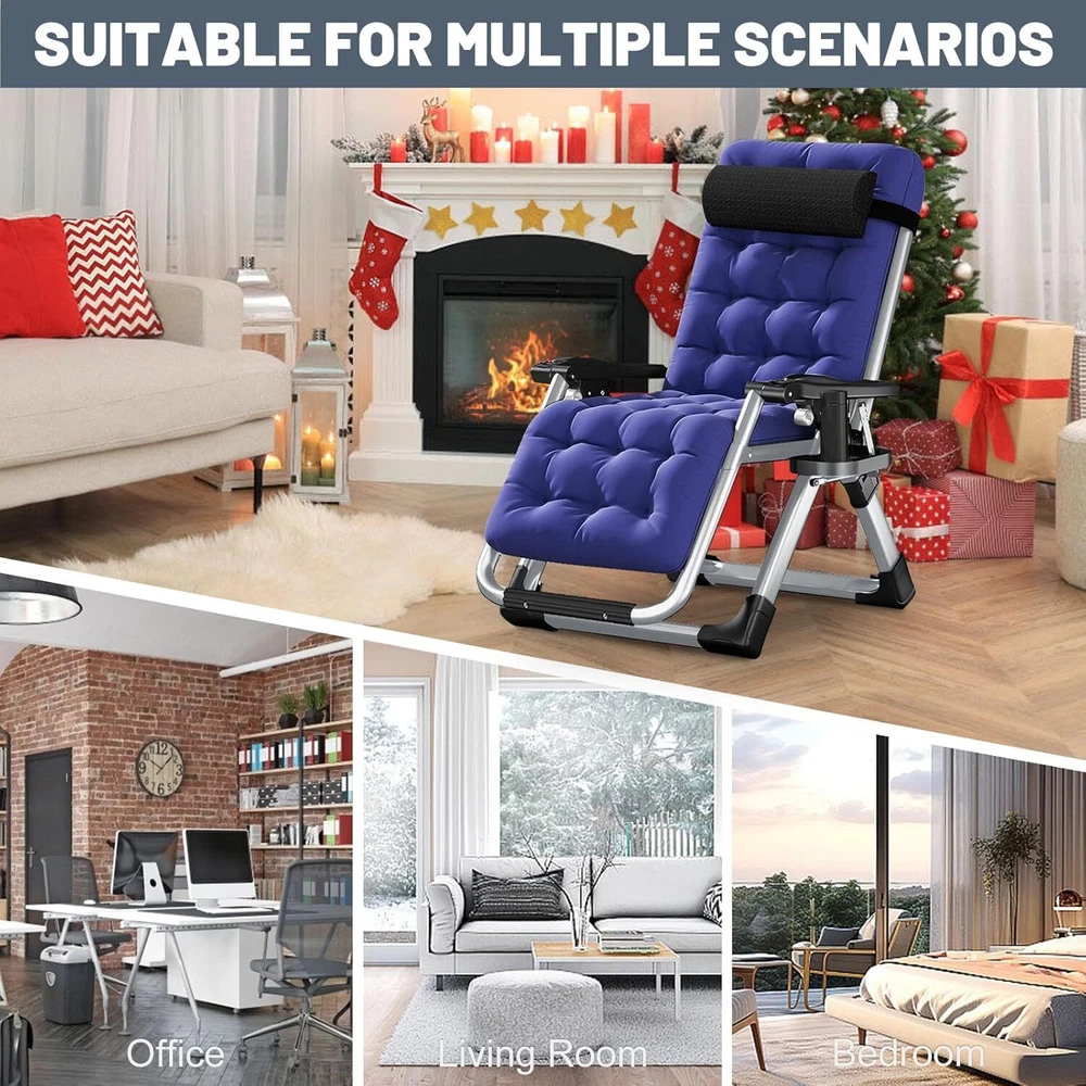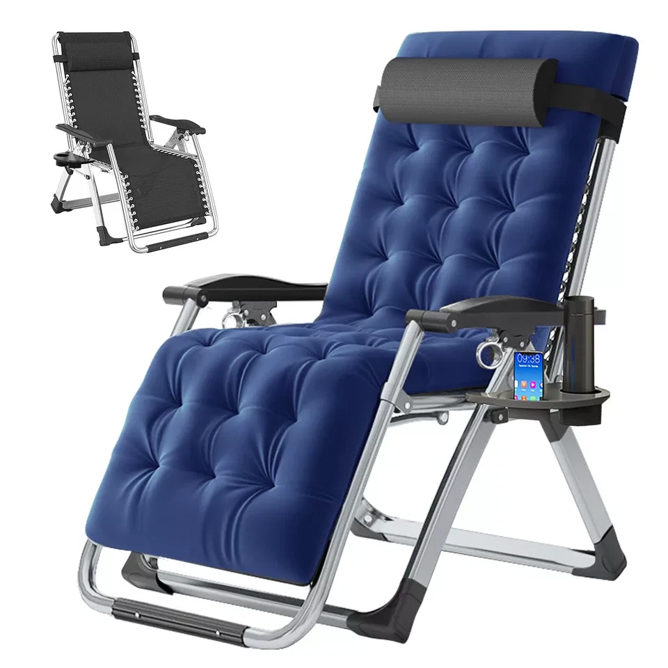 Sturdy Frame - The folding chair is built with premium quality materials, which provide increased durability and resistance. The living room chairs can take over 440 pounds of weight and it is extra sturdy and will last you a lifetime. Removable Soft Pad - Intuitive design features that this recliner chair can be used by anybody. The pad is soft and removable which is more comfortable and warm when sitting. You can remove the soft cushion from the folding lounge chair to promote better airflow during hot summer days. Adjustable Foldable Chair - The reclining chair uses a triangle locking system to lock the chair in different positions, this amazing feature helps you select the optimal angle that brings you to a comfortable, relaxing position. Easy to Use - This lounge chair is very easy to assemble. No tools needed! Just open the box and take out of the chair and unfold it, then you can use it. It'll only take you a few seconds. The foldable design makes it easy to carry. Wide Application - Perfect chairs for indoor and outdoor use. Whether relaxing by reading a book or take a break, this comfortable folding chair is the best choice. It can be used indoors, living room and office, for outdoor activities, such as camping, beach, patio, pool, lawn, garden, deck, balcony. Package include: 1 Pack 90º to 170º adjustable chair 1 Pack Headrest 1 Pack Removal Cushion ☁ Feature: 1. Multi‑angle adjustable and ergonomic design. Satisfy your comfortable experience. 2. Using thick composite high‑strength Oxford cloth, safe and breathable, dirt‑resistant. 3. Reinforced fastener, sturdy steel pipe structure, more durable ad comfortable. 4. Safety non‑slip foot pads are used at the bottom to prevent rollover when turning over. 5. Light weight and folding design for easy storage, transport and perfect of summer. ☁ Specification: ▶ Item Type: Folding Chair ▶ Material: Steel Pipe + Oxford Cloth ▶ Color: Gray ▶ Size: Approx.45X26X28inch ▶ Weight: Approx.18.7lbs ▶ Adjustment Angle: 90°-170° ▶ Bearing Weight: 440lbs ▶ Mattress Color:Blue ▶ Mattress Material:Pearl Cotton Mattress & Gray short fleece