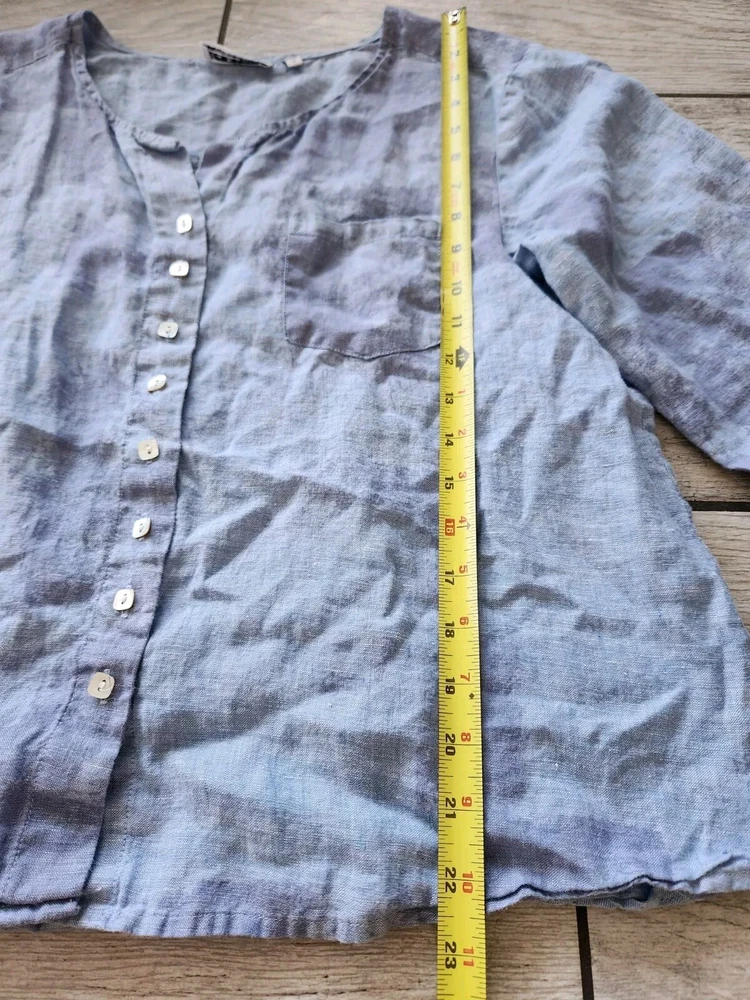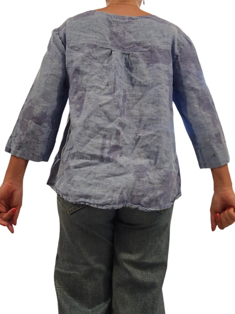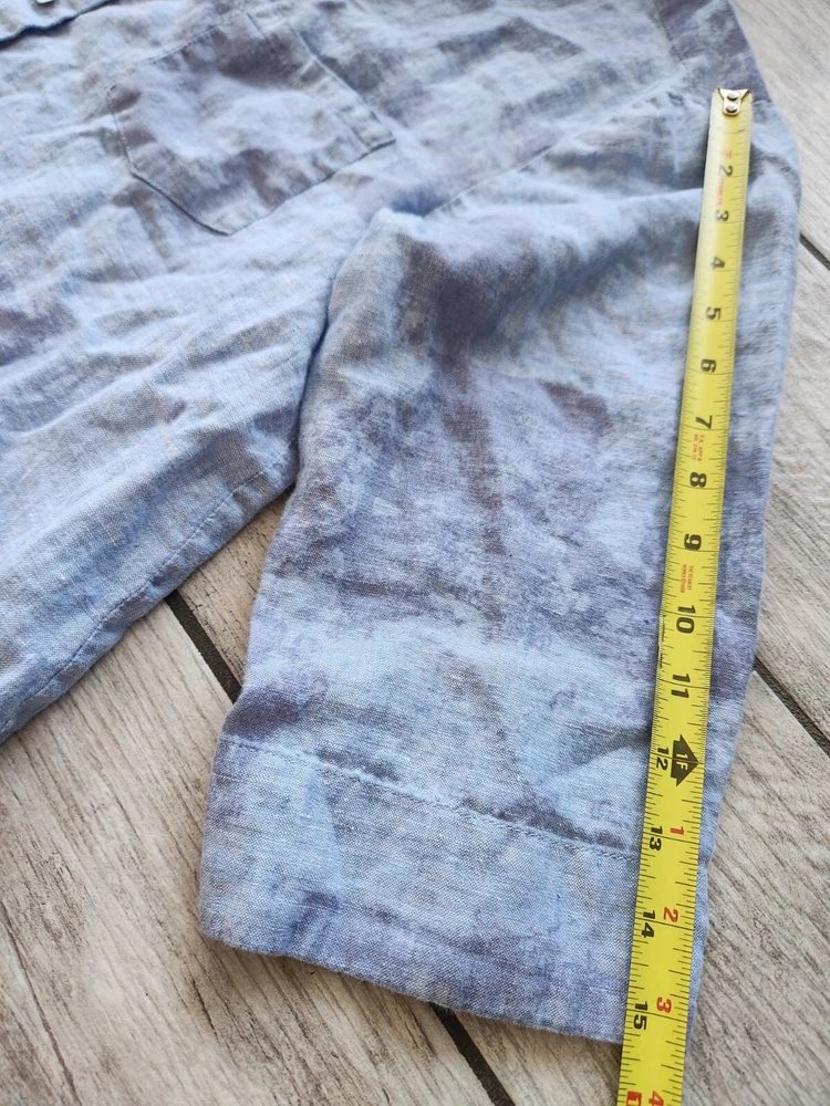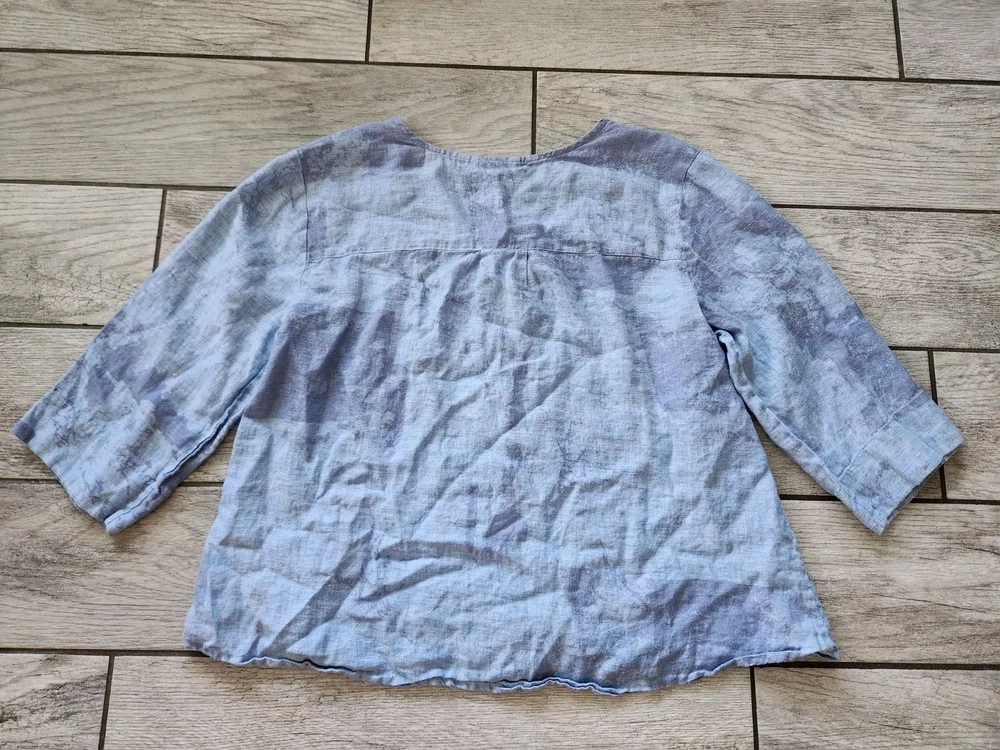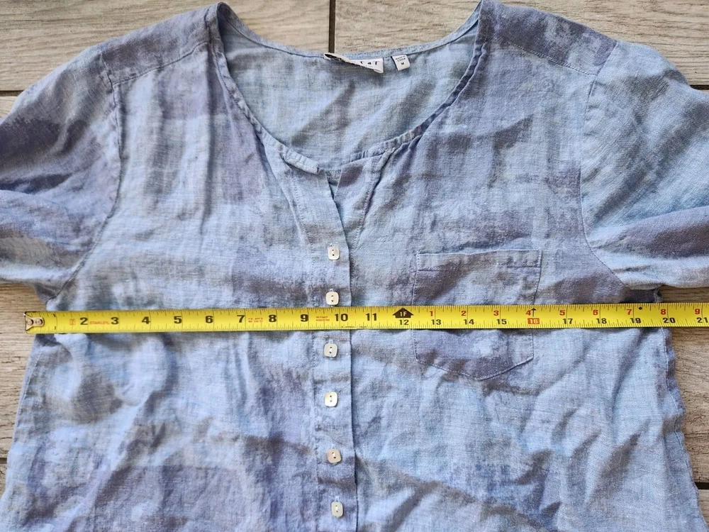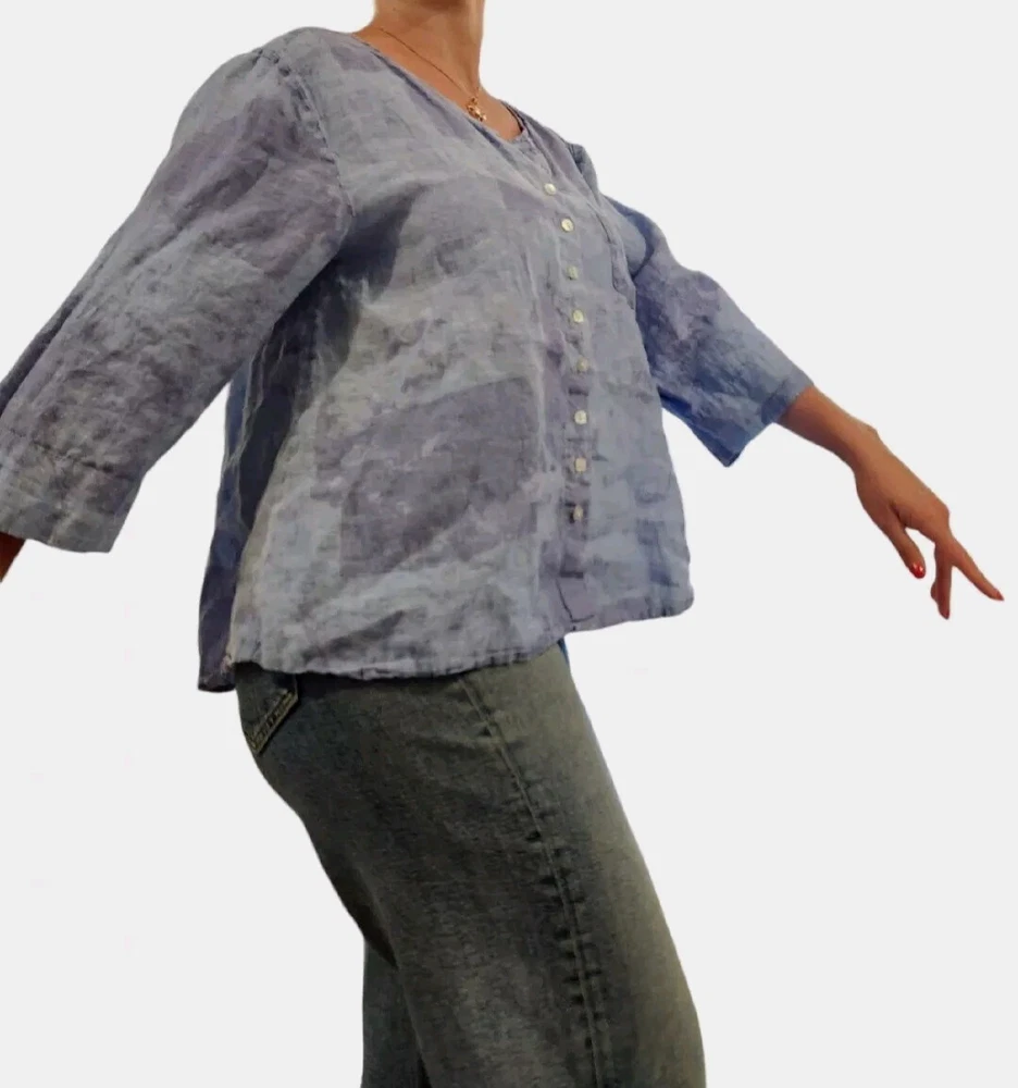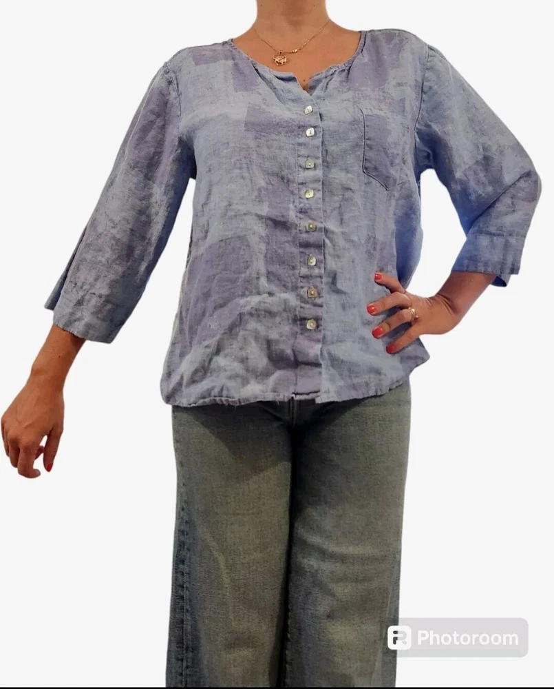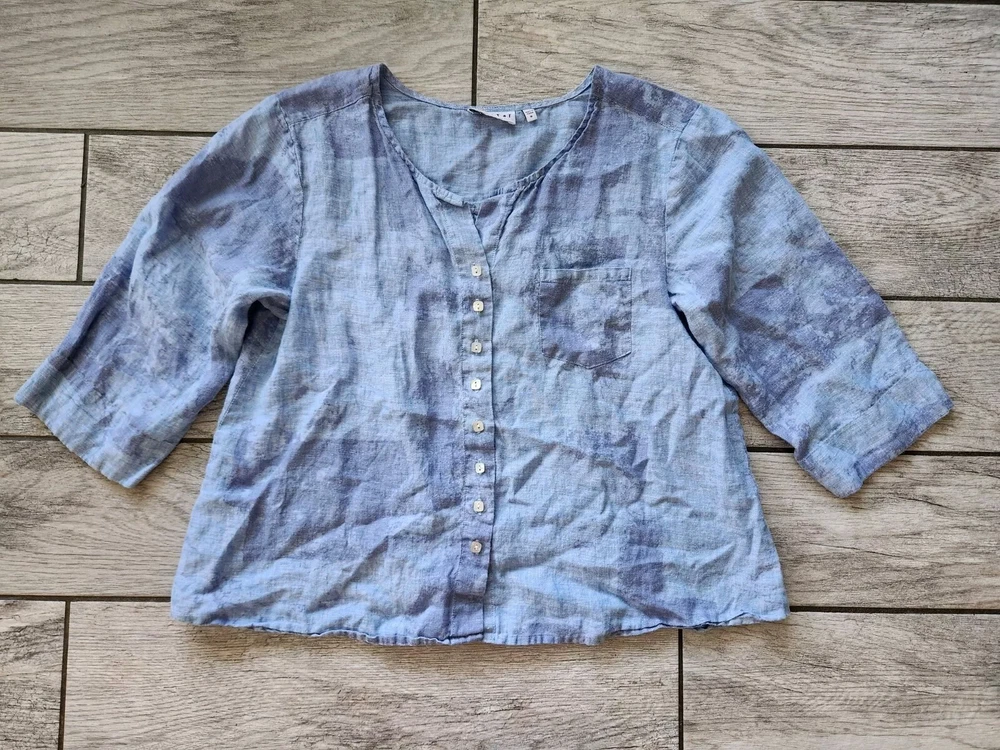 Loose fit tunic a dreamy tie-dye print Featuring voluminous 3/4 length sleeves, a flattering v-neckline, and button-up front. Pair it with vintage denim for a classic boho vibe 100% Linen Front pocket Pearl square buttons Owner: 5.1 feet 125 pounds in pictures 34C Excellent used condition. No Rips, Stains or Tears. See pictures for details, measurements and condition. 🚬 Smoke Free Home 🚦 I’m open to fair offers 🧐 Happy to answer questions 👍🏻 Thank you for checking out my closet, Pastel cottagecore bohemian boho, Lagenlook, coastal, summer, spring