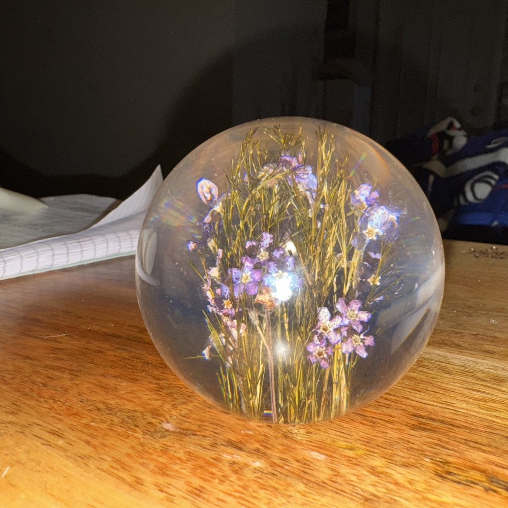 The Hafod Grange Lucite Paperweight features a beautiful design of pink flowers and heather, symbolizing the beauty of Great Britain. Made from lucite, this vintage piece adds a touch of elegance to any collection or decor. With its origins from the United Kingdom, this paperweight is a unique and charming addition to any space.