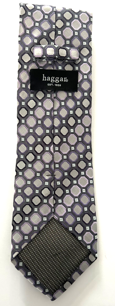 The Haggar Necktie is a stylish and versatile accessory for men, featuring a geometric pattern in black, grey, and purple colors. Made of polyester with an embroidered accent, this woven tie is handcrafted and features a pointed style. It is adjustable in size and is suitable for various themes like American, abstract, and preppy. The classic length and width make it a timeless addition to any man's wardrobe, perfect for adding a pop of color to a suit or formal outfit.