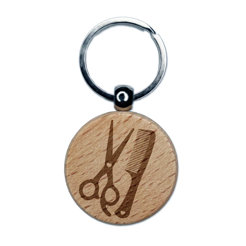 Hair Cutting Comb Scissors with Hearts Engraved Wood Round Keychain Tag Charm