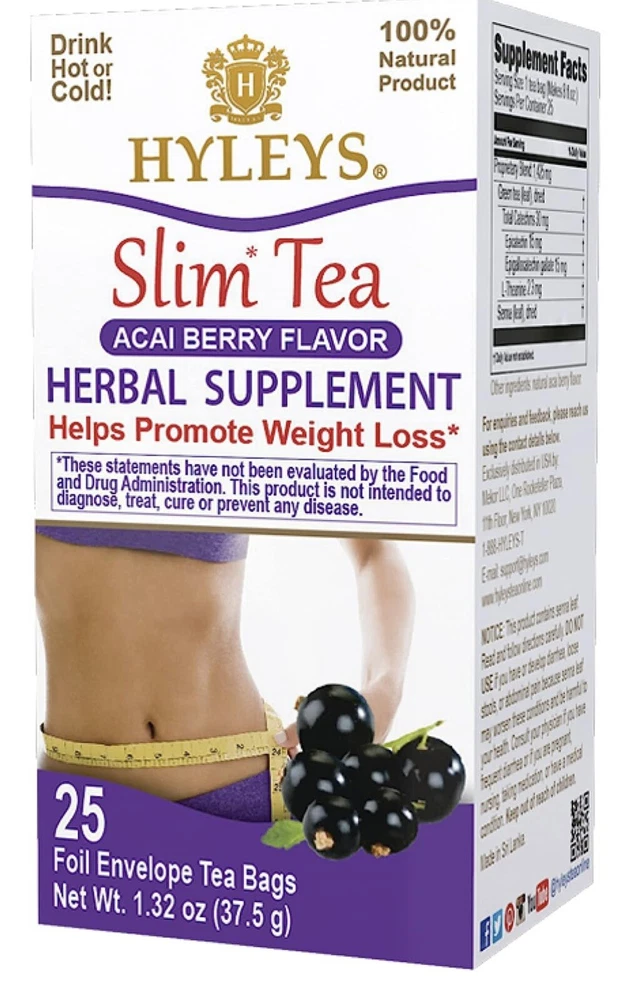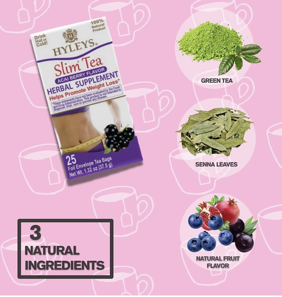 Haley’s Slim Tea Acai Berry Flavor For Weight Loss. Herbal tea bags supplement for cleanse and detox. Your body is most active when it comes to digestion and metabolism while you’re sleeping because body heat rises when sleeping. So use one tea bag in hot water and drink the tea before bed. Uses 3 main ingredients- green tea, senna leaves, and natural fruit flavors. The green tea in Hyleys Slim Tea helps progressively lose weight by maintaining normal metabolism of fat and carbohydrates and provides 30 mg of catechins and 2.3 mg of L-Theanine per serving. The senna leaves in Hyleys Slim Tea promote a healthy digestion and work as a gentle laxative for to relieve occasional constipation 25 tea bags Keto and paleo friendly. Zero net carbs.
