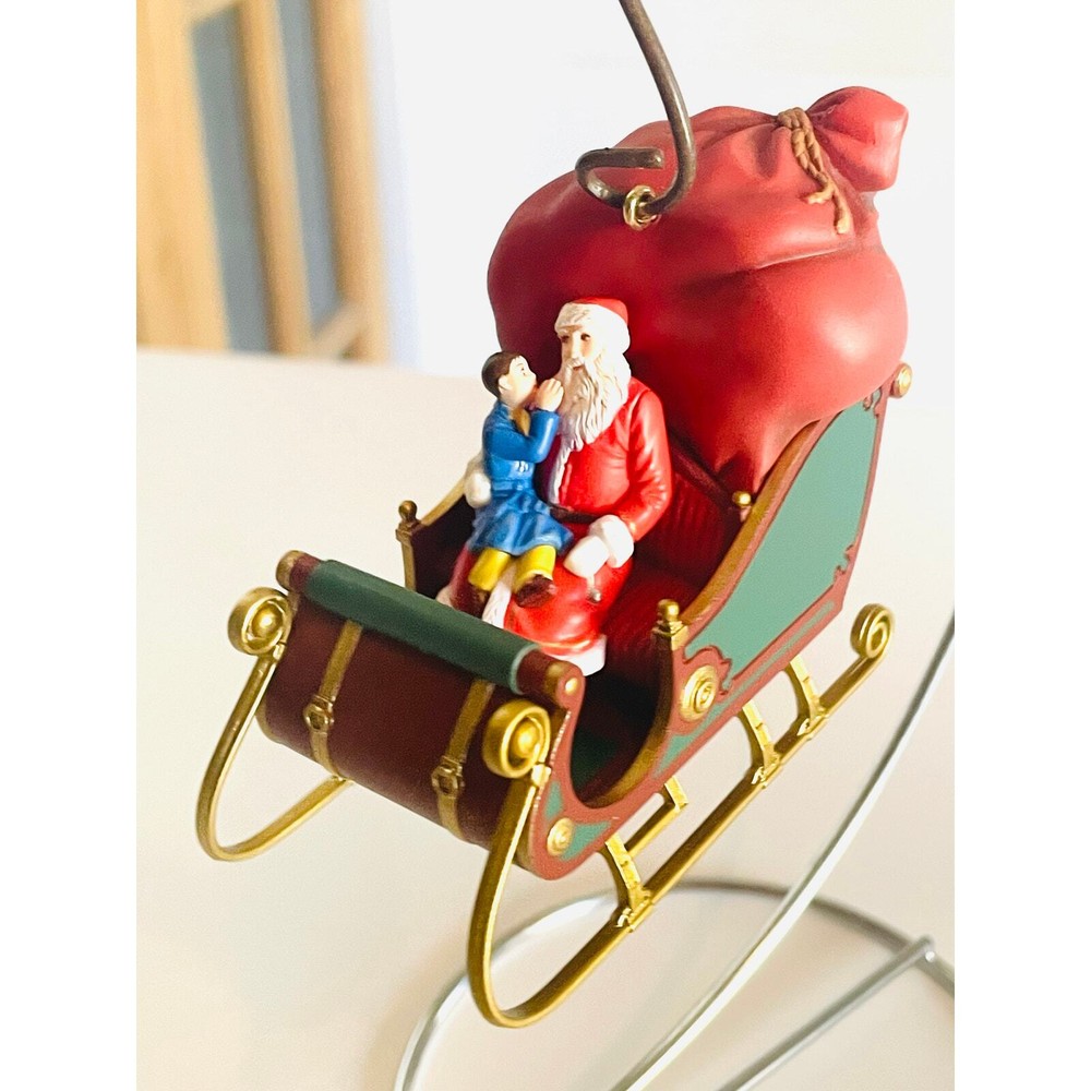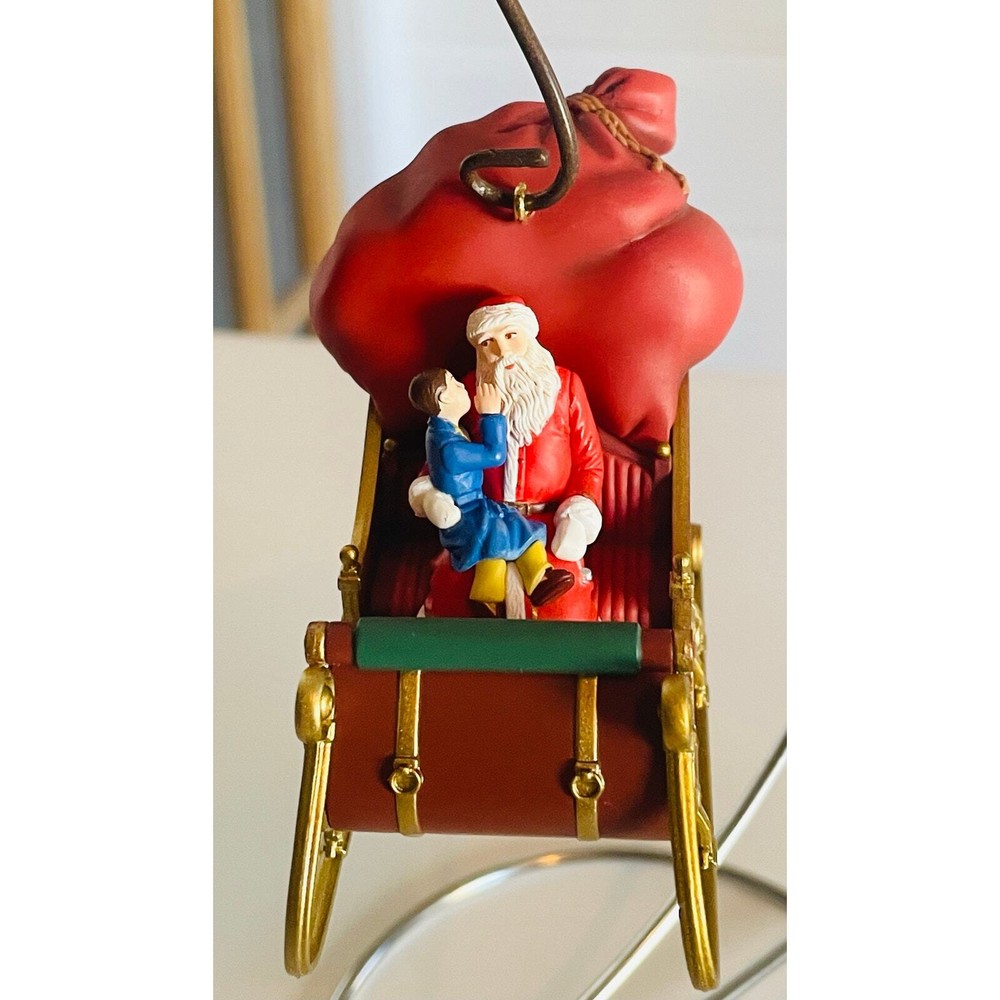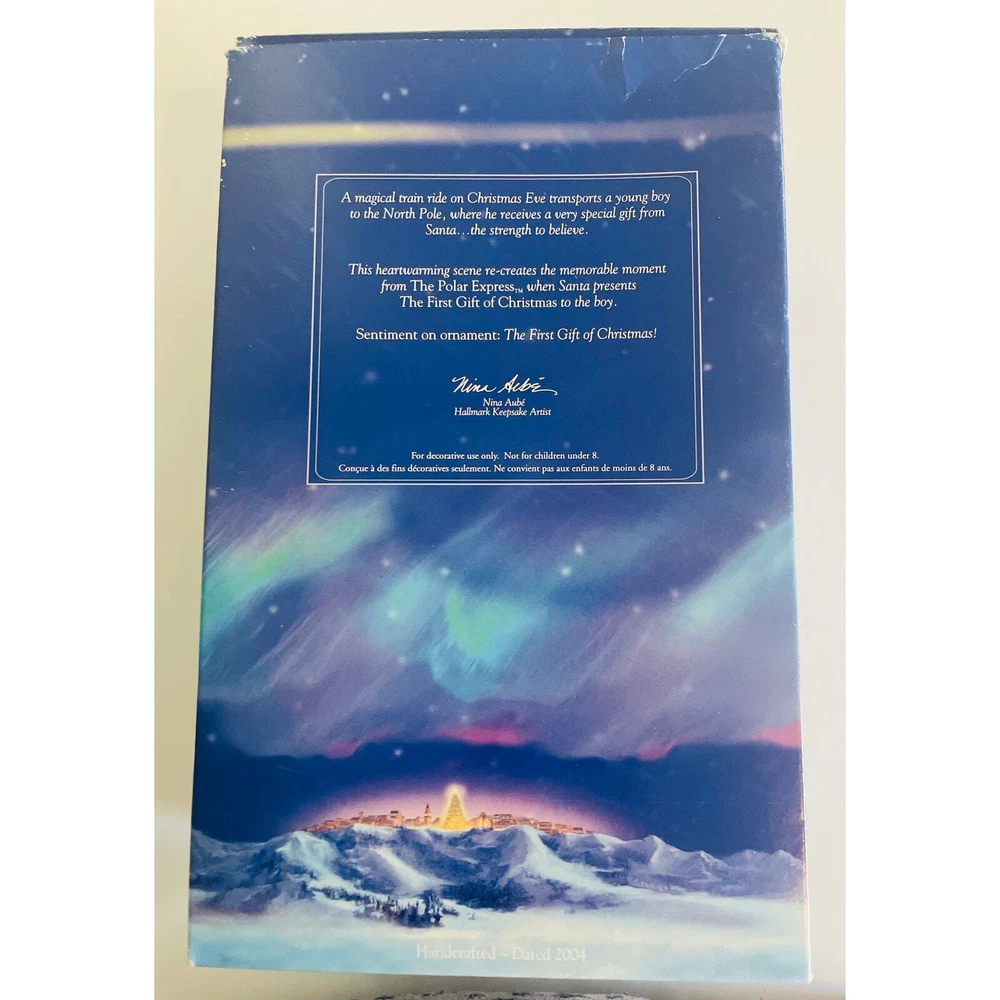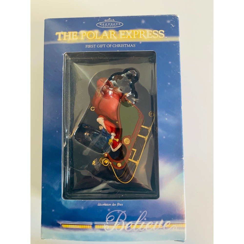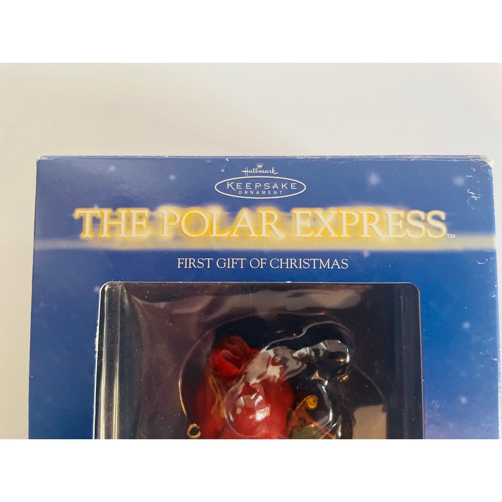 Hallmark Keepsake 2004 Polar Express First Gift of Christmas Ornament with Box, in mint condition. 3 1/2 inches wide. Relive the magic of The Polar Express with this beautifully crafted Christmas ornament features a scene from the beloved holiday movie, with Santa holding out the First Gift of Christmas to the Hero Boy. The Hero Boy is depicted in his pajamas, just as he was in the movie, with a look of wonder and excitement on his face. Details on the ornament are exquisite, from the intricate detailing on Santa's coat to the glittering snow on the ground.