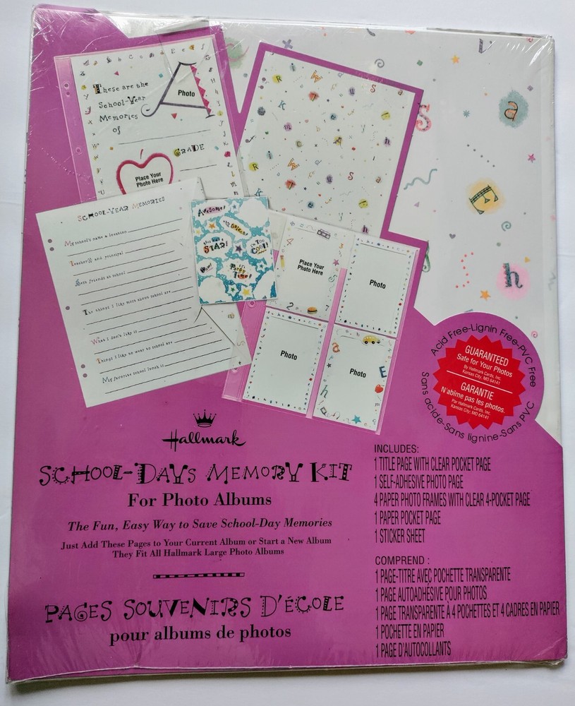 Capture and cherish the best memories of your school days with this Hallmark School Days Memory Kit. The kit is acid free-lignin, PVC free, and includes everything you need to create a beautiful scrapbook album. The album features a colorful and vibrant design with the theme "School Days Memories". It is large enough to accommodate 4-Pocket Page with photo frames 4 x 6 or 3.5 x 5 photos. Sealed to ensure that your album remains in perfect condition for years to come. This photo album is perfect for anyone looking to create a personalized and unique scrapbook to hold their cherished memories. It is suitable for both personal and gift purposes. Save school day memories to share later at reunions and with friends and family. Buy this album now and begin to preserve your best memories today! These are school-year memories of 14 Hallmark large photo album pages of photo, grade, favorites, friends, family, and more easy ways to save school memories. Includes: 1 Title page with clear pocket page, 1 self-adhesive photo page, 4 paper photo frames with clear 4-pocket page, 1 page pocket page, 1 sticker sheet. Last a lifetime.