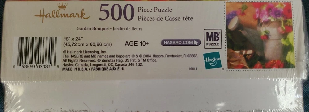 Hallmark Garden Bouquet Puzzle 500 Pieces MB/Hasbro 2004 NEW. This puzzle is suggested for age 10+, it has 500 pieces and measurements 18X24 inches.