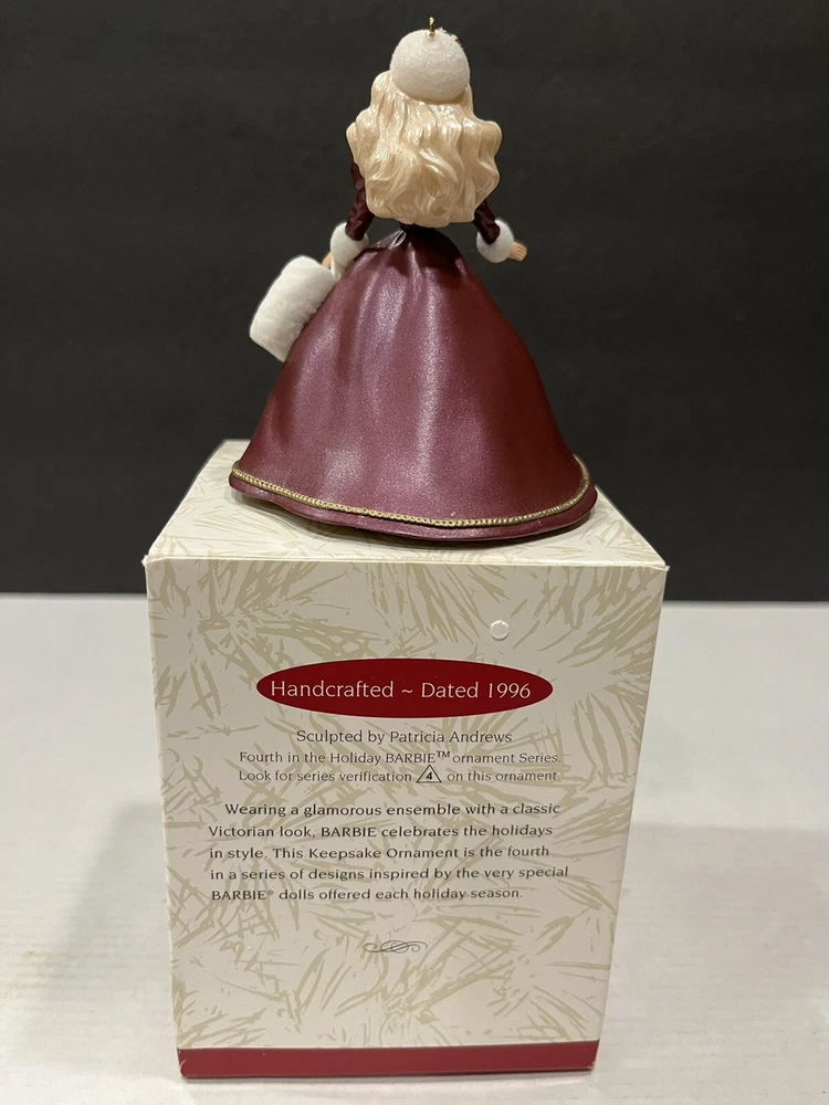 This Hallmark Holiday Barbie ornament is a must-have for collectors. It features the iconic Holiday Barbie character in a festive pose, surrounded by intricate decorations. The ornament is part of the 1996 Collector's Series Keepsake collection, making it a valuable addition to any holiday ornament collection. The ornament is made in China and comes in its original box. It is perfect for display or as a thoughtful gift for any Holiday Barbie fan. Add this beautiful ornament to your collection today! Ornament and box in like new condition