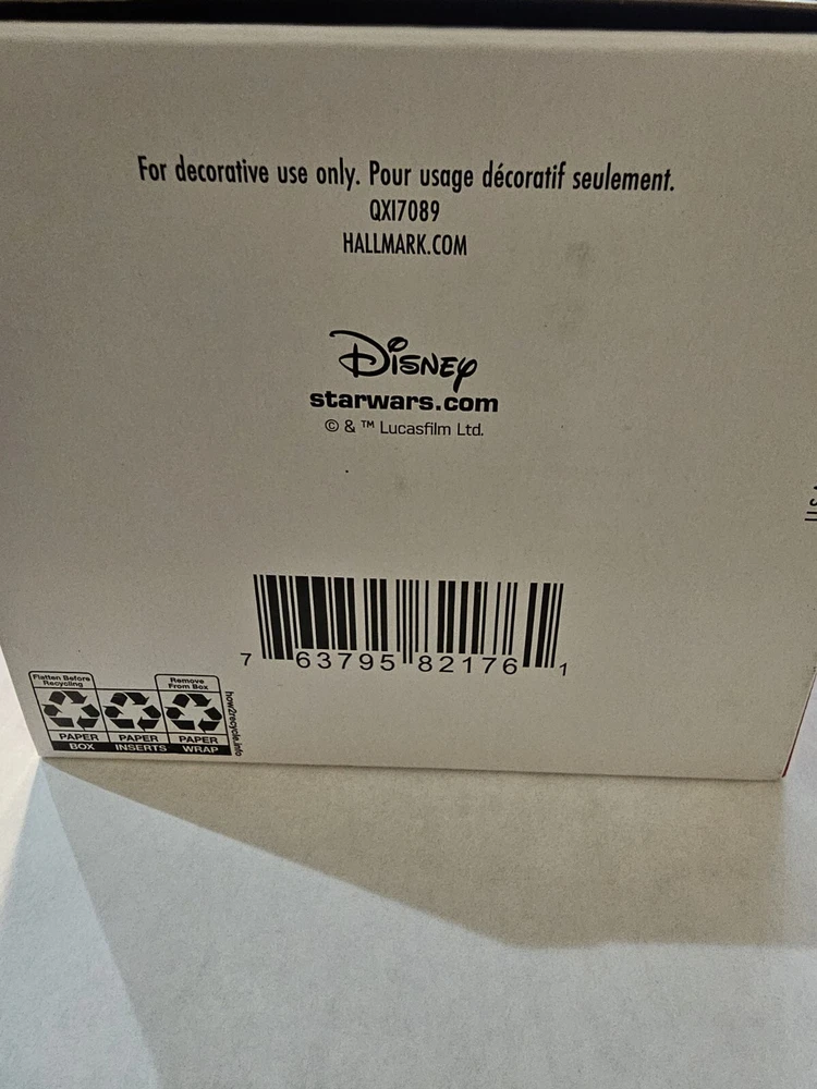Shape: Irregular Color: Multicolor Features: Artist Designed, Limited Edition, Hanging, Decorative, Standing, Animated Occasion: Christmas Handmade: No Material: Plastic, Mixed Materials Size: Medium Time Period Manufactured: 2020-Now GTIN: 0763795821761 gtin13: 0763795821761 Vintage: No Type: Ornament Style: Contemporary Original/Licensed Reproduction: Original Pattern: No Pattern Brand: Hallmark Collection: Ornaments MPN: QXI7089 Production Technique: Pottery Recipient: Friend UPC: 0763795821761 Theme: Holiday Antique: No Year Manufactured: 2023 Franchise: Star Wars