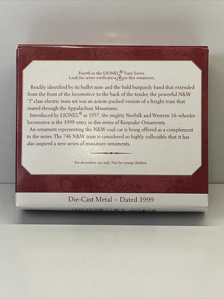 Brand: Hallmark Seller Notes: “Light box wear with ornament in like new unused condition.” Subject: Trains Occasion: Christmas Theme: Christmas Year Manufactured: 1999 Type: Ornament Collection: Lionel Train