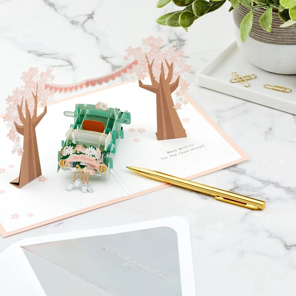 Wish the happy couple well as they embark upon the adventure of married life with this sweet card featuring an impressive paper craft design and a cheerful message. The perfect accompaniment for a wedding gift, the newlyweds are sure to cherish it as a beautiful keepsake of the best day ever. The Hallmark brand is widely recognized as the very best for greeting cards, gift wrap, and more. For more than 100 years, Hallmark has been helping its customers make everyday moments more beautiful and celebrations more joyful. Share in the newlyweds' joy with a celebratory card as they start the next chapter of their life together. Cover features a floral design, foil accents, and "Congratulations" lettering. Inside features an elaborate surprise 3D pop-up of a classic car waiting for the happy couple beneath flowering trees, and the message: "Best wishes for the road ahead." With an impressive paper craft design and sweet sentiment, this is the perfect accompaniment to a wedding gift. Wedding pop up card measures 5" x 7.2" and comes with a coordinating envelope. Printed on high quality paper stock, Hallmark's greeting cards are made with paper from well-managed forests. Paper Wonder greeting cards are mini masterpieces featuring three-dimensional scenes made of layers of intricate laser-cut paper that create a moment of wonder and lasting celebration.