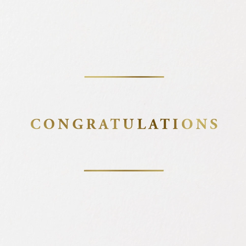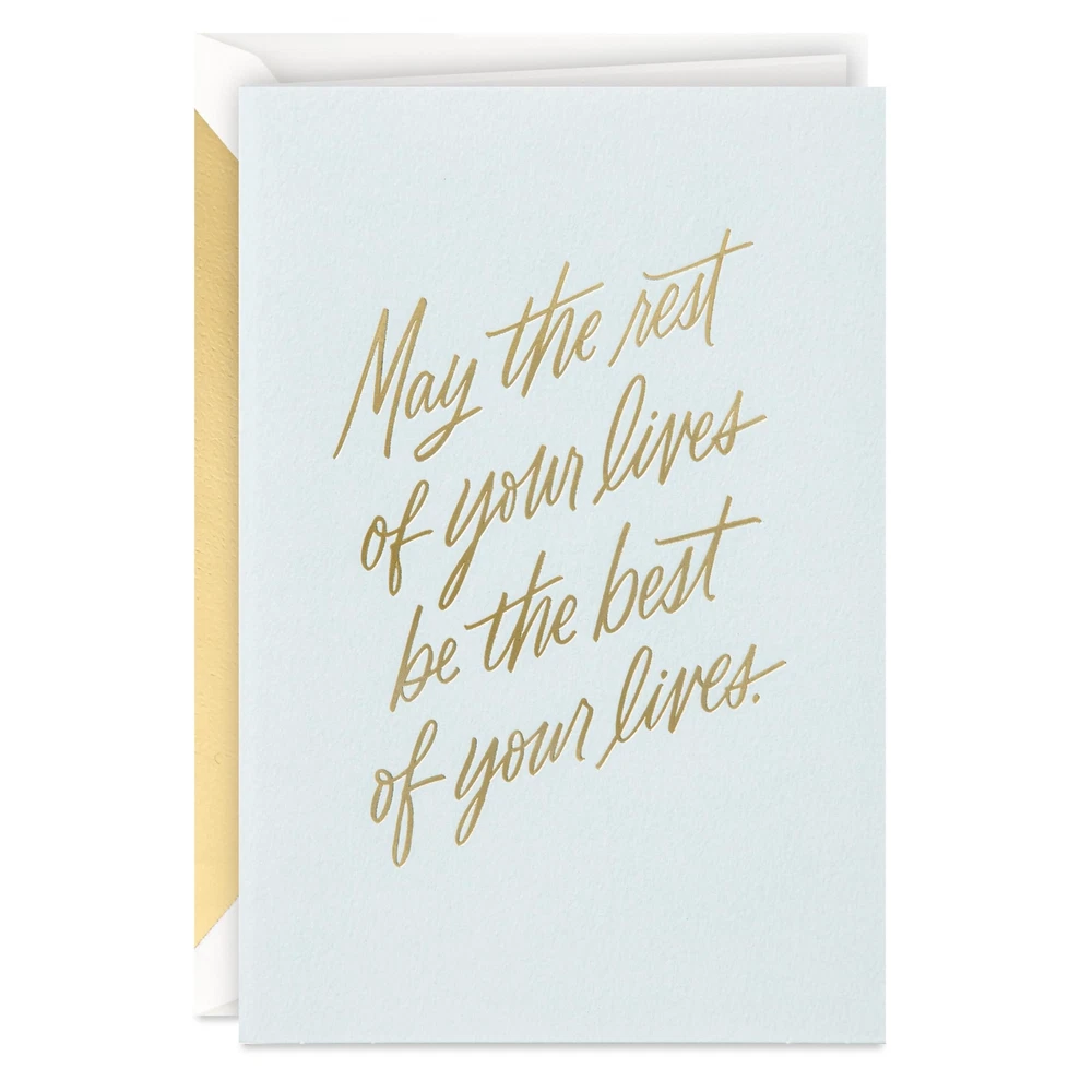 Send your best wishes to newlyweds, a bride to be, or fiancés with this premium wedding card featuring foil accents and a simple sentiment. A great pairing for a gift card or present, or a beautiful standalone offering at an engagement party, wedding shower, or the big day. The Hallmark brand is widely recognized as the very best for greeting cards, gift wrap, and more. For more than 100 years, Hallmark has been helping its customers make everyday moments more beautiful and celebrations more joyful. Wish the happy couple well with a beautiful card and a sweet sentiment. Cover features gold foil lettering on a light blue background that reads: "May the rest of your lives be the best of your lives." Inside reads: "Congratulations." Perfect for including with a wedding, shower, or engagement gift, or enclosing cash or gift cards. Congratulations card measures 4" x 6" and comes with a coordinating envelope. Printed on high quality paper stock, Hallmark's greeting cards are made with paper from well-managed forests. Hallmark Signature greeting cards assortment offers stylish shoppers a curated and considered line of upscale and unique cards and gifts that reflect their personal style and make an immediate and lasting impression.