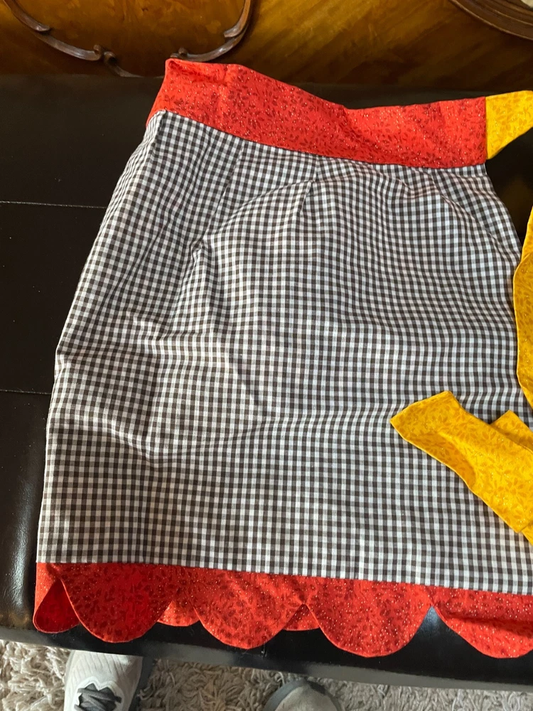 Brand new. Two pockets in the style of candy corn and button spiders along the bottom. Front waist measurement is 18.5” without ties, 78.5” tie end to tie end. Length measures 18” waist to scallop end.
