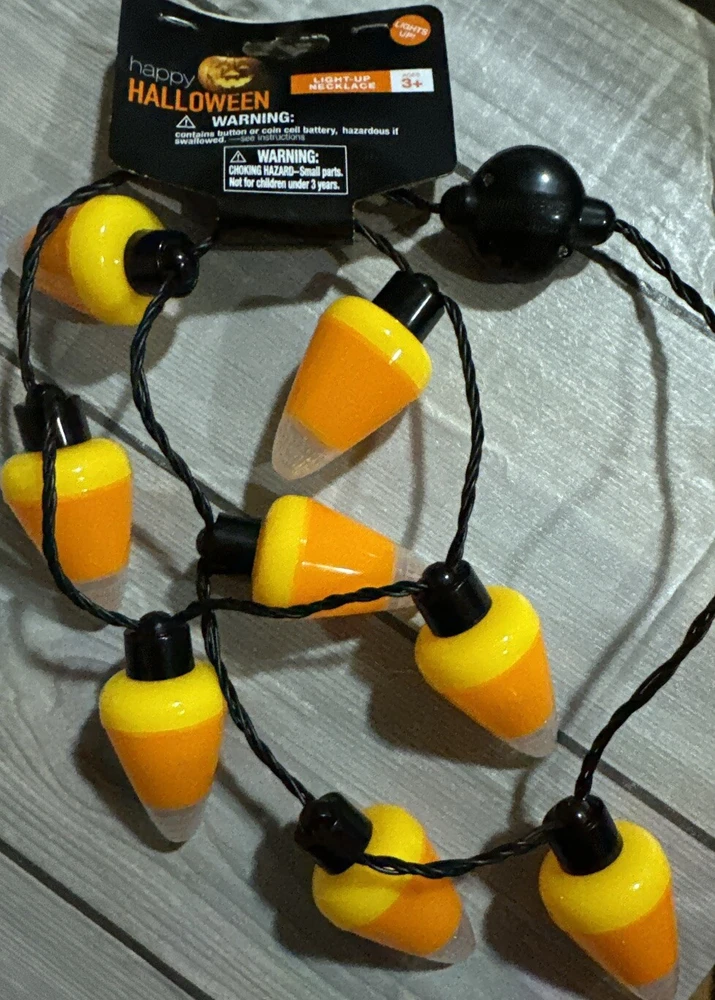 Get into the spooky spirit with this Halloween Flashing Necklaces LED Lights Candy Corn Jumbo Halloween Necklace. Perfect for any Halloween occasion, this multicolor necklace is made of plastic and features LED lights that create a spooky ambiance. Whether you are dressing up for a Halloween party or just want to add some spooky vibes to your outfit, this necklace is a must-have. GT002>017