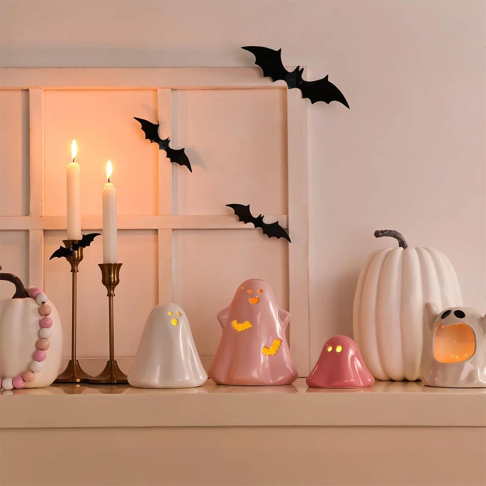 PACKAGE INCLUDES: You will get 3 sets of ceramic Halloween ghost decor with lights (Batteries included). These cute and spooky pink ghosts decorations are ranging from 3.5 to 5 inches tall and can emit yellow lights from inside. Make a fun addition to your Halloween decorations. FANTASTIC DESIGN: These Halloween ghosts statues are hollow and equipped with LED lights inside. The hollow eyes and mouths give them a cute yet spooky ghost look. They will enhance the festive atmosphere of your Halloween decor. HIGH-QUALITY: All ghosts are made of porcelain clay and kiln fired for durability in a glossy pink glaze, sturdy and smooth. Sit firmly on any falt surface without tipping over. Perfect as cute, pastel, preppy Halloween decor. MULTI APPLICATIONS: These lovely little light up ghosts figures are nice and adorable Halloween decor. Suitable for living room, bedroom, kitchen tiered tray decor, table, bar tabletop, mantel, windowsill, bookshelf, desk, TV cabinet, office, classroom and Halloween party supplies. Perfect for the spooky mood. TREASURED GIFTS: With their exquisite craftsmanship and cute design, these ceramic Halloween ghost decor figurines are a nice gift choice. They are sure to pleasantly surprise both children and adults. Suitable for other Halloween party or event decorations. Product description Pink White Cute Ceramic Halloween Ghost Decor Add a whimsical touch to your Halloween decorations with our adorable set of 3 pink and white ceramic ghosts! These charming pieces are designed in a pastel, preppy style that seamlessly blends spooky fun with elegant decor. Perfect for adorning your fireplace mantel, table, desk or office, these cute ghost figurines bring a playful spirit to any indoor setting.