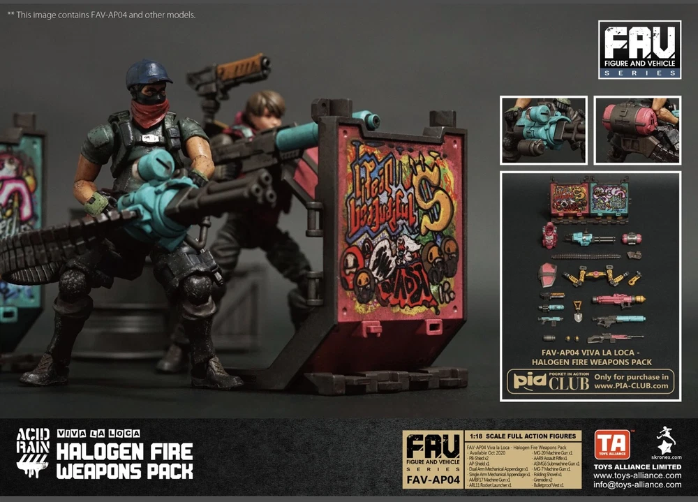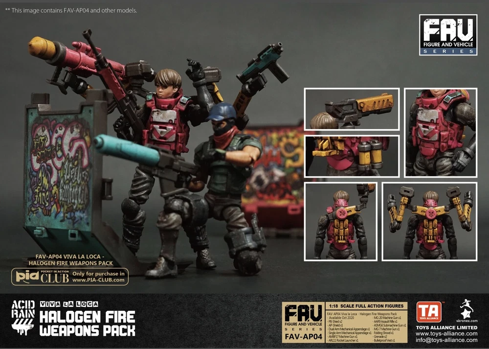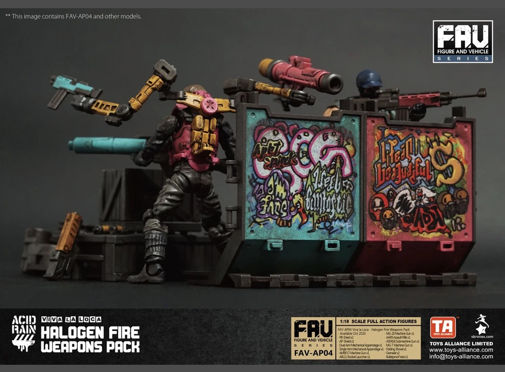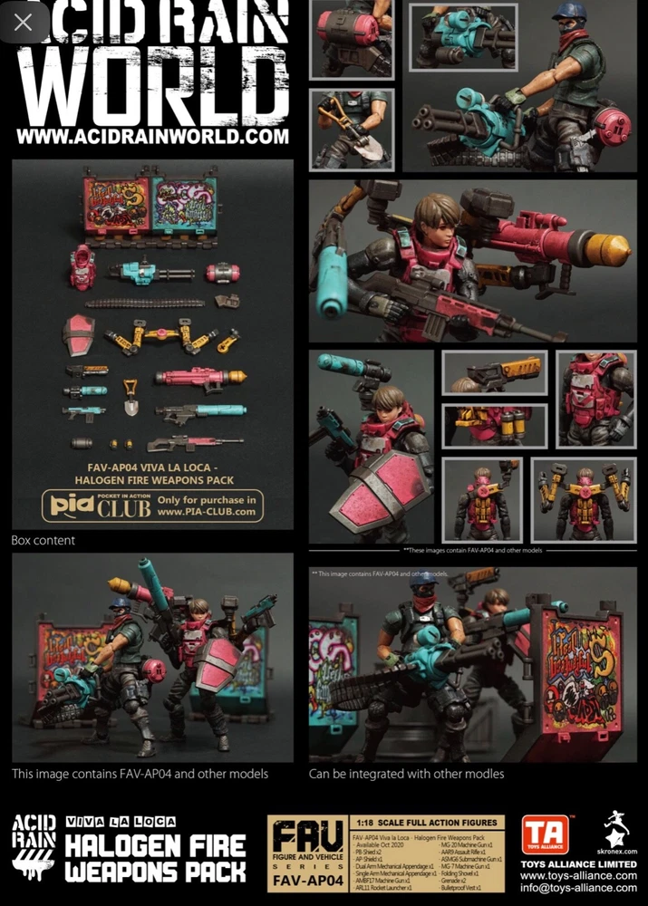 Toys Alliance makes some of the nicest Acid Rain figures. This is a boxed set containing the Acid Rain FAV-AP04 Viva la Loca Halogen Fire Weapons Pack. New, mint, unused, unopened, case fresh... USA in hand for immediate delivery. This set is amazing. You will want this set to help display your "Luggans" (if you were lucky enough to get one ;0). This set is also absolutely a staple for customizing because of its contents. The barriers are amazing looking and would make awesome walls for a transport. We are a USA seller and only have a few items to list. We are not a toy store and we do not have cases. The sealed boxed pictures (pics 3 and 5) shown are your actual item. The loose item photos are stock pictures, and there are NO figures or vehicles with this set. ***We also posted a few highly customized examples of this Weapons Pack when creatively mashed with other toylines (pictures 4 and 6 for reference only and are not included. You are only buying one MIB unopened case fresh Acid Rain FAV-AP04 Viva la Loca Halogen Fire Weapons Pack. *NO FIGURES AND NOTHING ELSE) . This is ONE unused and unopened item being shipped from the USA. The second photograph shows the actual box contents, your box will be factory sealed and unopened. We guarantee the authenticity of this item and it is an original TA Acid Rain set. ***BEWARE!*** If you are ordering from overseas, shipping can take up to two months... they don’t tell you this but it is true. As buyers we no longer purchase from overseas sellers since we’ve had our orders cancelled after sellers have had our money for actual months! The orders we did receive took six weeks and they were mangled and required import fees. You don't want to try and initiate a return with an overseas seller, it's just plain scary. Honestly, it was a nightmare. THIS ITEM SHIPS FROM CALIFORNIA and you are looking at the actual pictures of the actual item. Thanks again for your time and PLEASE stay healthy. Be well ;0) ——————————ONLINE PRODUCT DESCRIPTION———————— Product Description Long Live the Crazies! In every age and place there are always wild ones who dare to be different! We are happy to introduce Acid Rain World's Viva la Loca series! Who says Acid Rain World is all gloom and doom? The Halogen Fire weapons pack is here to spice things up for all you wild commanders with vibrant customizations for your arsenal! Figures sold separately Product Features 1/18 Scale Made of plastic Part of the Figure And Vehicle Series Highly detailed Compatible with existing 1/18 scale Acid Rain action figures Box Contents PB Shield AP Shield Dual Arm Mechanical Appendage AMBF17 Machine Gun ARL11 Rocket Launcher MG-20 Machine Gun AAR9 Assault Rifle ASMG6 Submachine Gun MG-7 Machine Gun Folding Shovel Grenade Bulletproof vest Please know that we do not cancel purchases or auctions. Ebay charges the seller non-refundable fees when an item is purchased. Moreover, “watchers” and marketing is lost when a transaction is cancelled. The seller must then relist the item at their own expense and loses more time and more personal money. Please do not ask us to cancel a transaction... you would be asking us to pay personal money for your indecision. If you purchase an item or win an auction please take into consideration that we will not allow or agree to any cancellations. It is not fair to the seller or other potential buyers. Thank you kindly and please stay healthy.