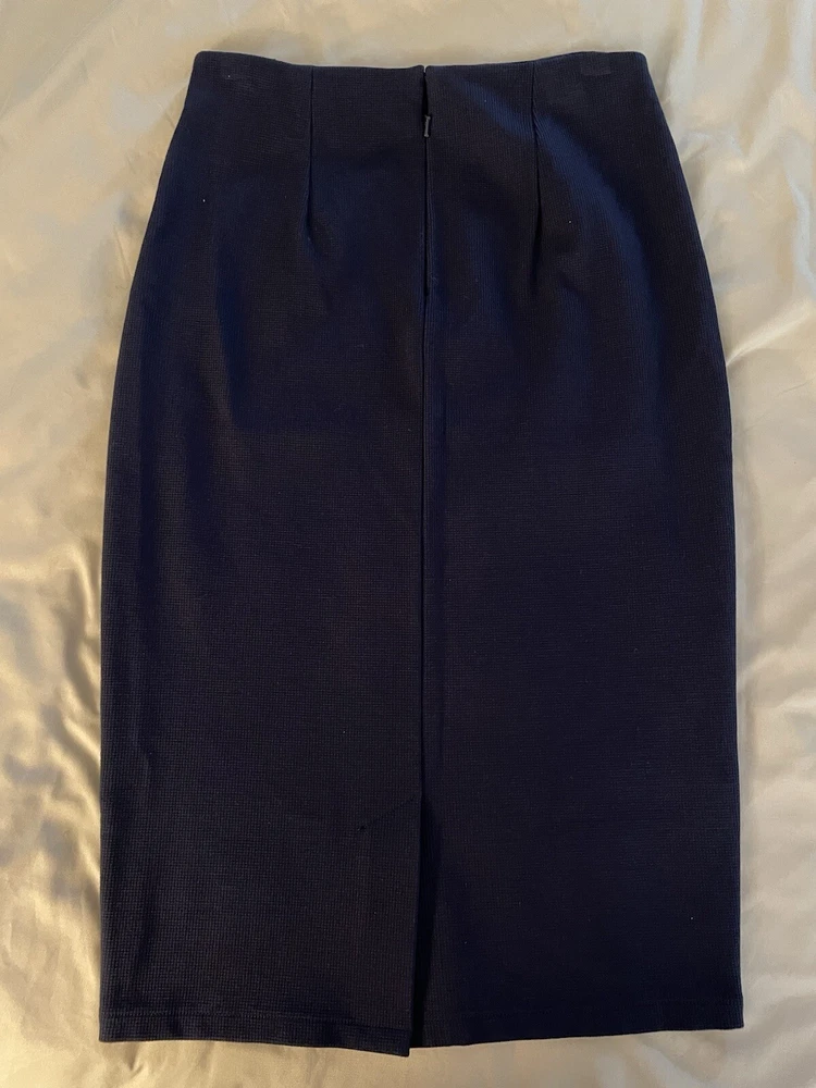 This Halogen skirt is a size XS in a solid blue color with a front side button design and back split. It is made of a Rayon Nylon Spandex fabric blend, tailored in a straight & pencil style. The skirt is below the knee in length and perfect for a fashionable and professional look.