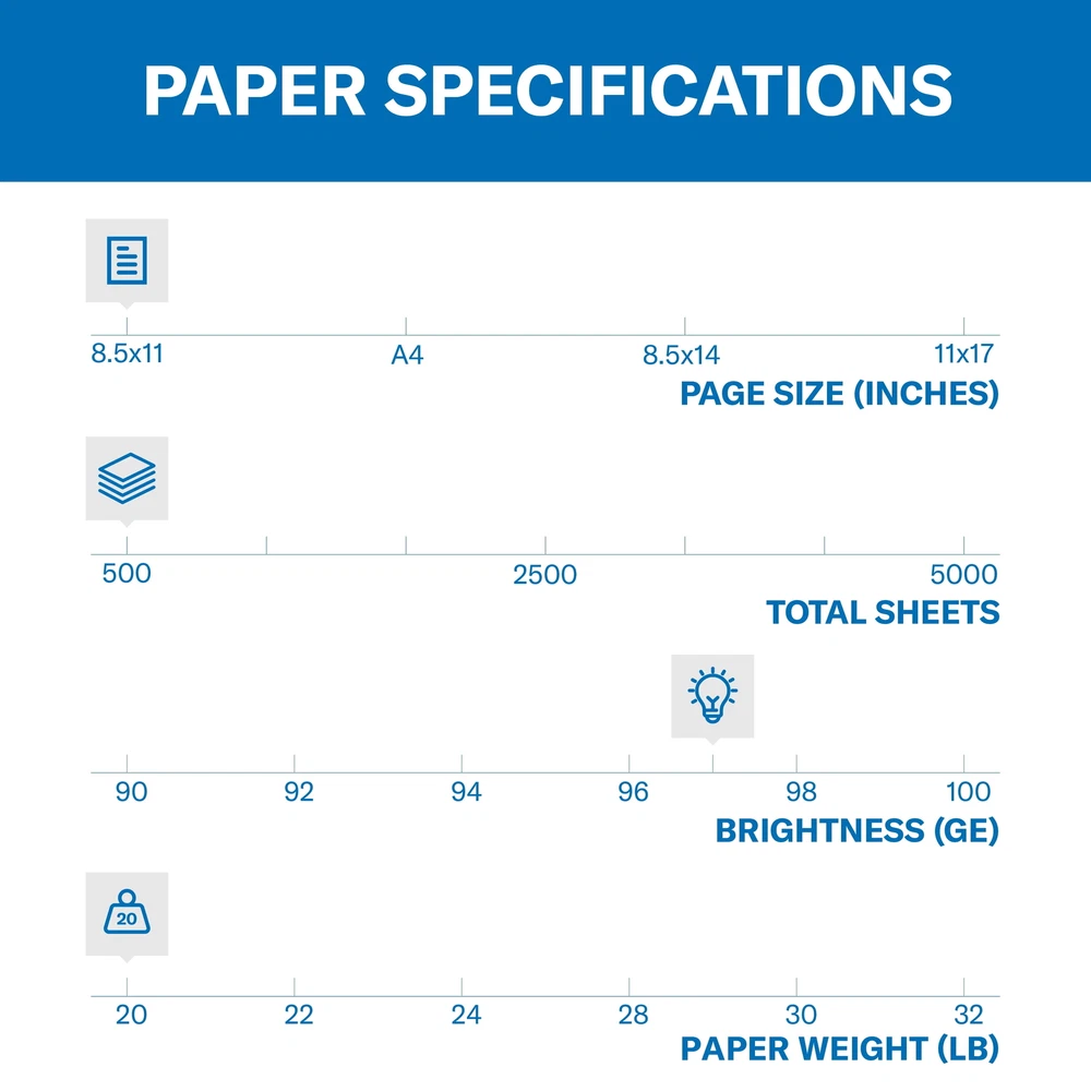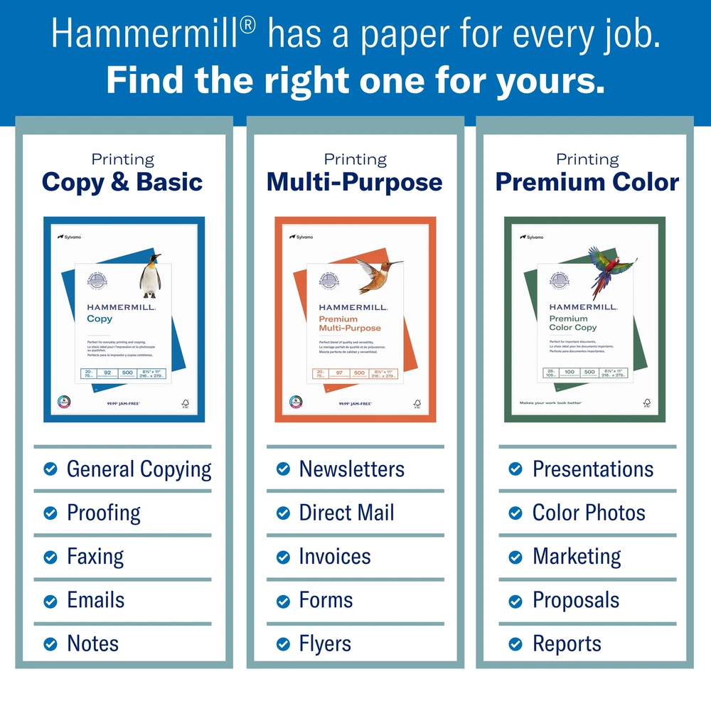 The Paper 99.99% Jam-Free® Guarantee: You will not experience more than one jam in 10,000 sheets using copy paper on your high-speed digital printer or we will replace your paper purchase. We test more than 13.5 million sheets of paper every year to make sure that each sheet is consistent. Then we test our papers on all kinds of printer and copier equipment to that our paper will work well for you, every time, on every machine. “It’s More Than Just Paper” to us and to millions of sustainable forestry workers across America, including American family tree farmers. papers are made with renewable resources from certified sustainably managed forests. We want our business to last for generations and that means taking good care of our environment. 8.5" x 11", 500 sheets, 20 lb, white, new. Premium 24lb Multi-Purpose Copy Paper provides a versatile sheet designed to run effectively through all office and home printing equipment This Multi-Purpose copier paper features Color Lok Technology for colors that are 30% brighter, blacks that are 60% bolder and ink that dries 3x faster. Plus, this acid-free white copy paper will not yellow over time The high 97 brightness and heavy weight basis weight combine in this copying paper to produce high quality documents you will be proud to distribute. It’s perfect for printing new proposals, newsletters, forms, direct mail, invoices and more 500 sheets, 8.5" x 11", 20 lb, white