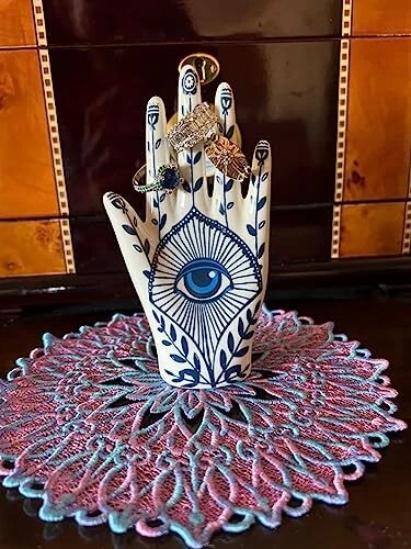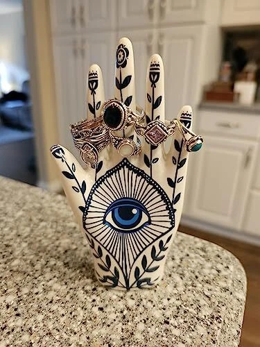 30 Days Return Policy Fast Delivery Trusted seller Hamsa Ring Holder Aesthetic Room Decor, Hamsa Hand with Blue Evil Eye Boho Decor Ring Stand Ring Organizer, Preppy Room Decor for Bathroom Bedroom, Hamsa Gifts for Women Home Decor Product Description ??【Hamsa Ring Holder】Decorative hand ring holder design with Hamsa and boho patten looks elegance and beautiful. Hamsa will bring good vibes and luck into your home that is the perfect home decor housewarming gifts for women. ??【Room Decor】An elegant boho decor to your room. A classy way to keep your rings and other fine jewelry organized and in easy reach. Helps keep your rings safe and in place. Great for women bathroom decor, bedroom decor, office decor, living room decor or kitchen decor. ??【Unique Gift for Women】A great unique hamsa gift for women, girls, daughters, sisters, mom, wife, nana, colleague, friends, co-workers, boss, girlfriends, boyfriends, her, men, boys, aunt, bestie, grandma... The perfect wedding gift or gift for a birthday, engagement, Valentine's, anniversary, birthday, Christmas, or Mother’s Day. ??【Hand Jewelry Display Holder】Perfect place to store your wedding rings/bands anyw in the house, by the kitchen sink, on the nightstand, in the bathroom, etc. This beautiful jewelry display Jewelry holder are modern, simple and beautiful. It is the perfect understated piece for your home or office.With this stylish piece, the options are endless! ??【Material&Size】Measures in inches: 5.5" tall x 2.4" Wide. Made of high-quality ceramic, Hand painted with brilliant under-glazes, gloss glazed, and kiln fired to produce a lasting keepsake. Shipping Returns Payment Shipping Shipping is FREE to all addresses other than APO/PO boxes in the lower 48 states. All our stock ships from US-based warehouses. Shipped via USPS or UPS (depending on location and package weight) Unless stated otherwise, all orders will ship within 24-72 hours of your payment being processed. Check our feedback to see the great reviews of FAST shipping we offer. Returns As our valued customer, we will do our best to make sure the product you receive arrives to you on time and as expected. If you are not satisfied with your purchase, please contact us within 30 days of receiving your order to process a return. Payment We currently accept payment via eBay managed payments only. Once payment is cleared, we will dispatch your shipment within 1-3 business days. Please refer to the "Shipping" tab for more information regarding shipping speed to your destination.
