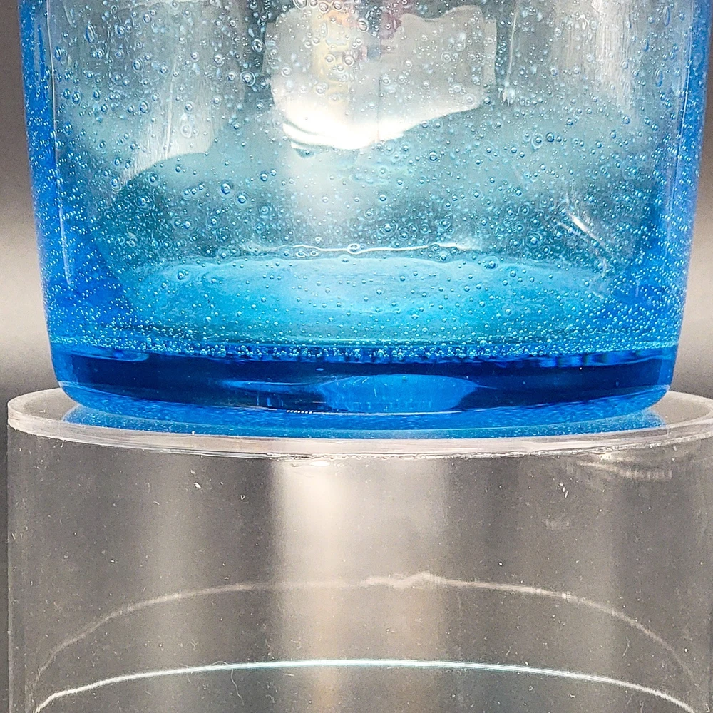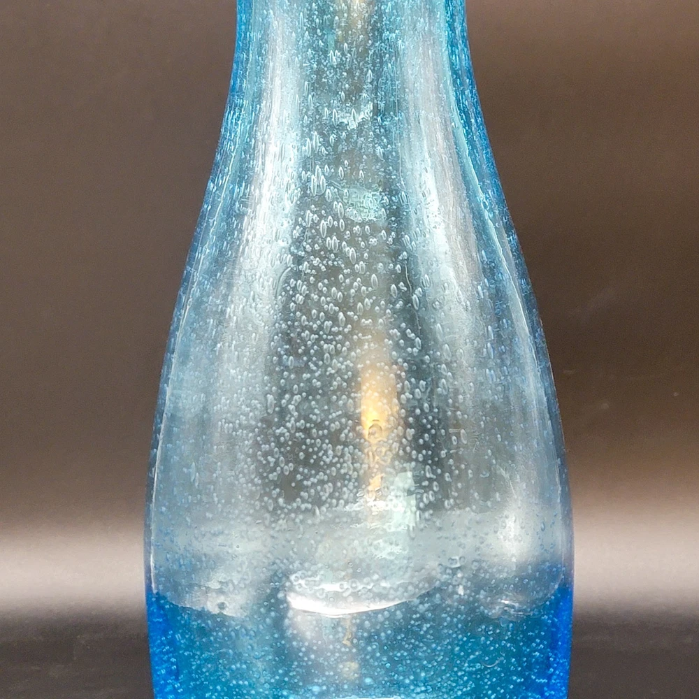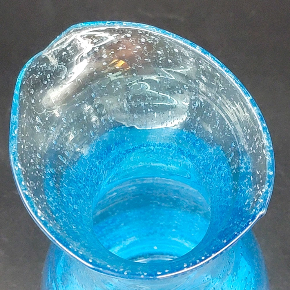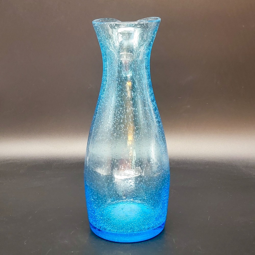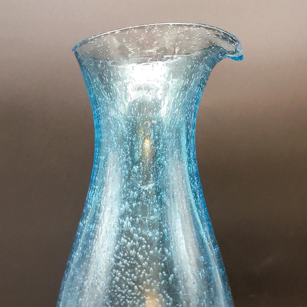 This Hand Blown Blue Seeded Glass Carafe Decanter is an exquisite piece of art glass. It stands at 12 inches tall. Handblown with a polished pontil. Perfect for serving both water and wine with a touch of elegance. Its unique design and production style make it a standout piece for any dinnerware collection. In very good used condition. No chips or cracks found. See photos for details.