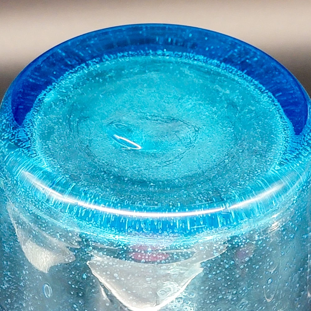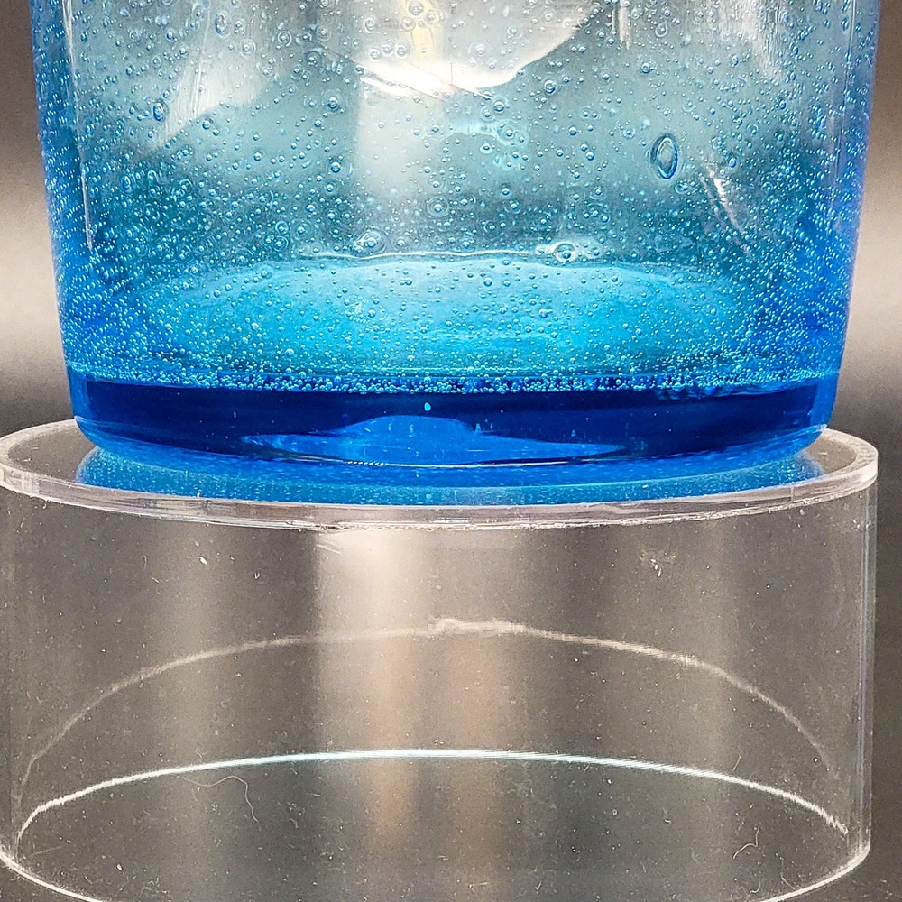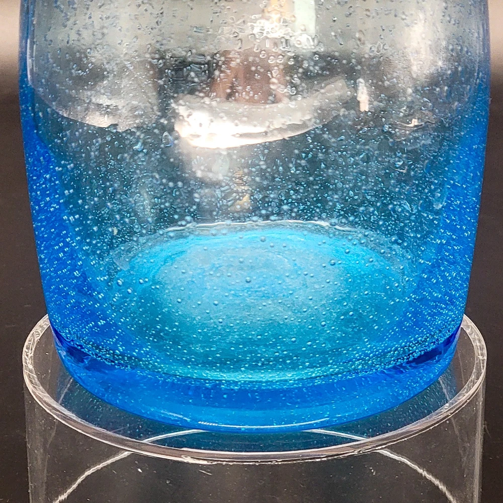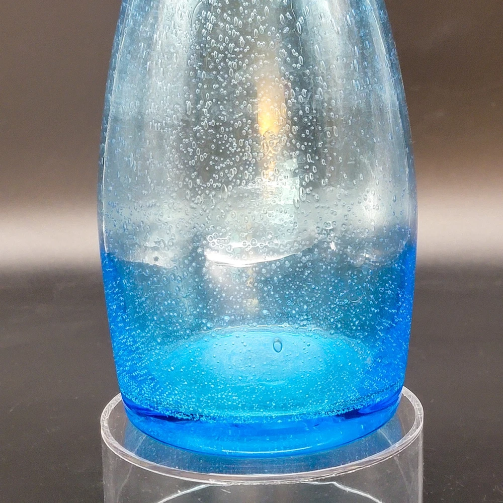 This Hand Blown Blue Seeded Glass Carafe Decanter is an exquisite piece of art glass. It stands at 12 inches tall. Handblown with a polished pontil. Perfect for serving both water and wine with a touch of elegance. Its unique design and production style make it a standout piece for any dinnerware collection. In very good used condition. No chips or cracks found. See photos for details.