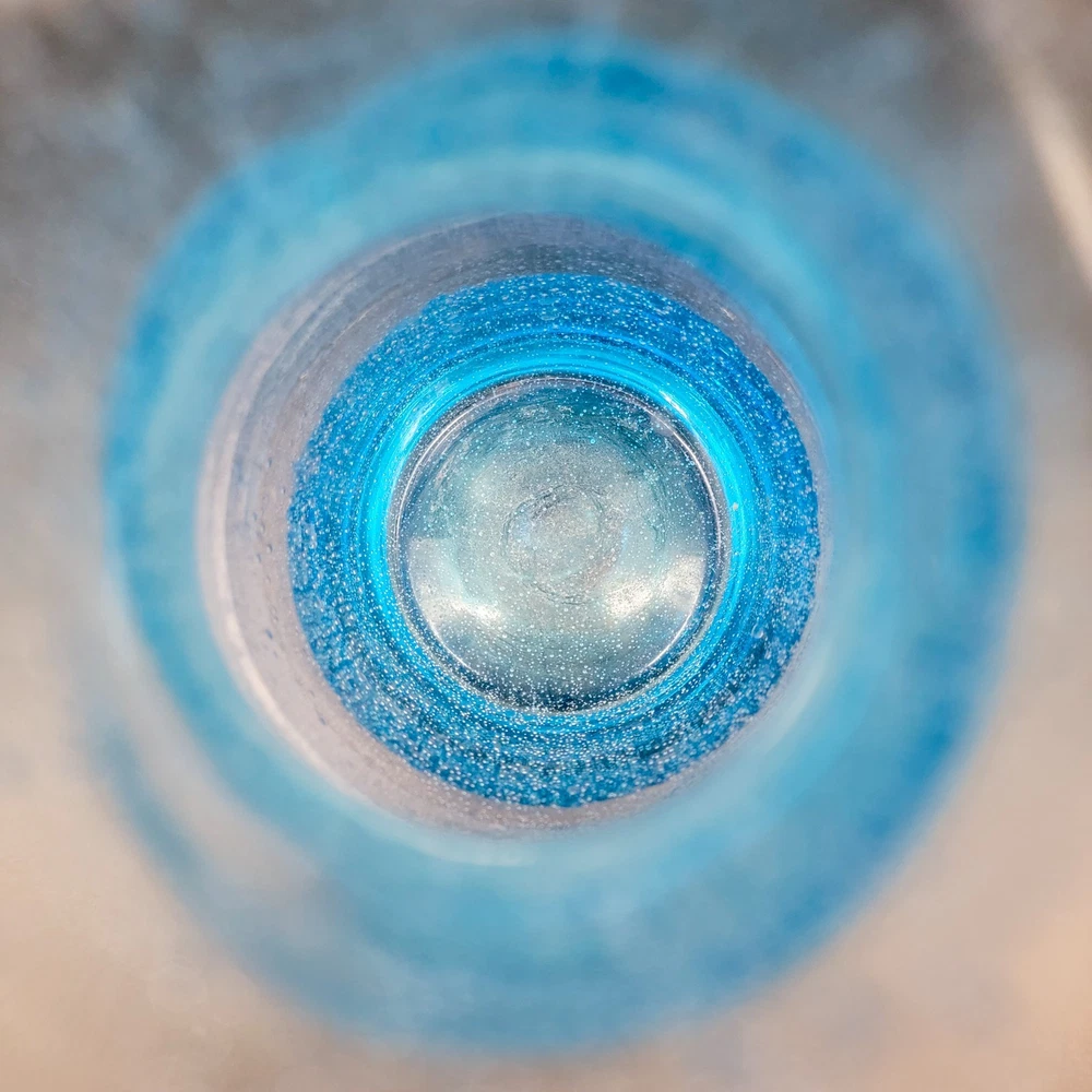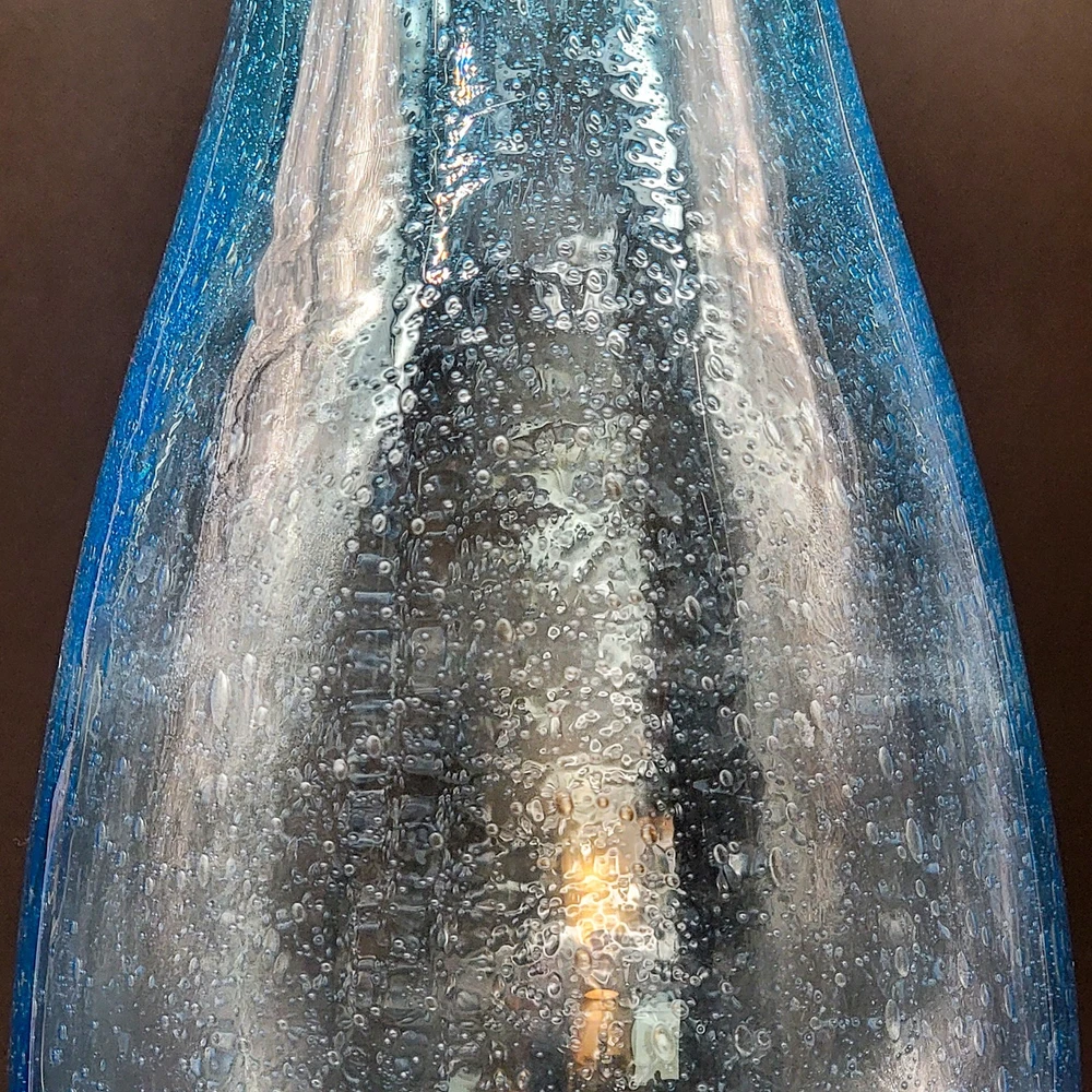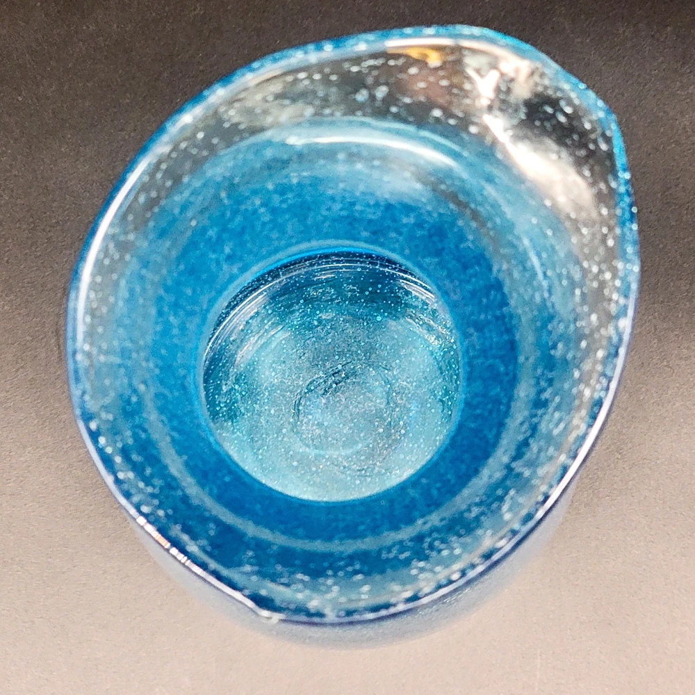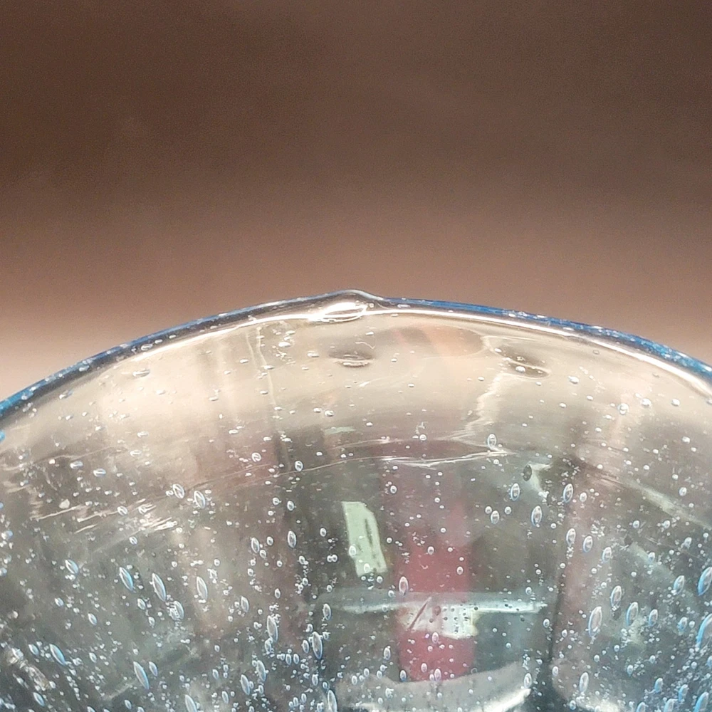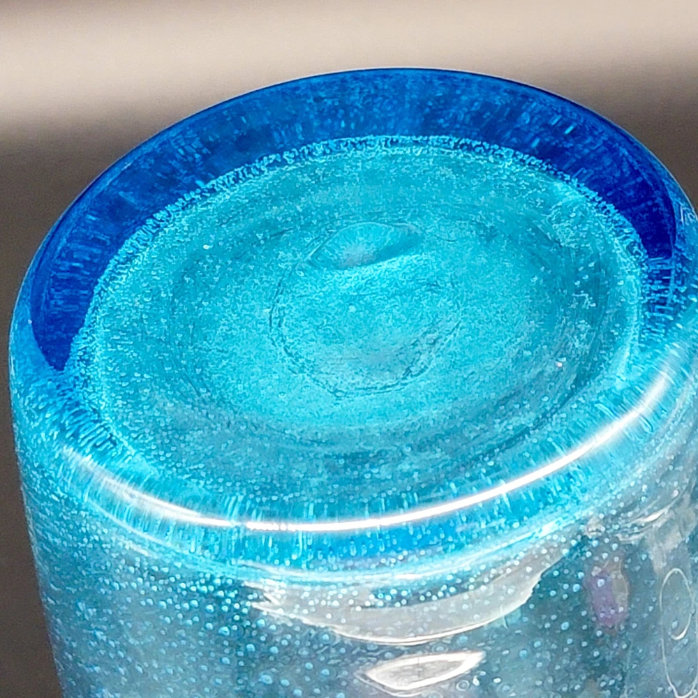 This Hand Blown Blue Seeded Glass Carafe Decanter is an exquisite piece of art glass. It stands at 12 inches tall. Handblown with a polished pontil. Perfect for serving both water and wine with a touch of elegance. Its unique design and production style make it a standout piece for any dinnerware collection. In very good used condition. No chips or cracks found. See photos for details.