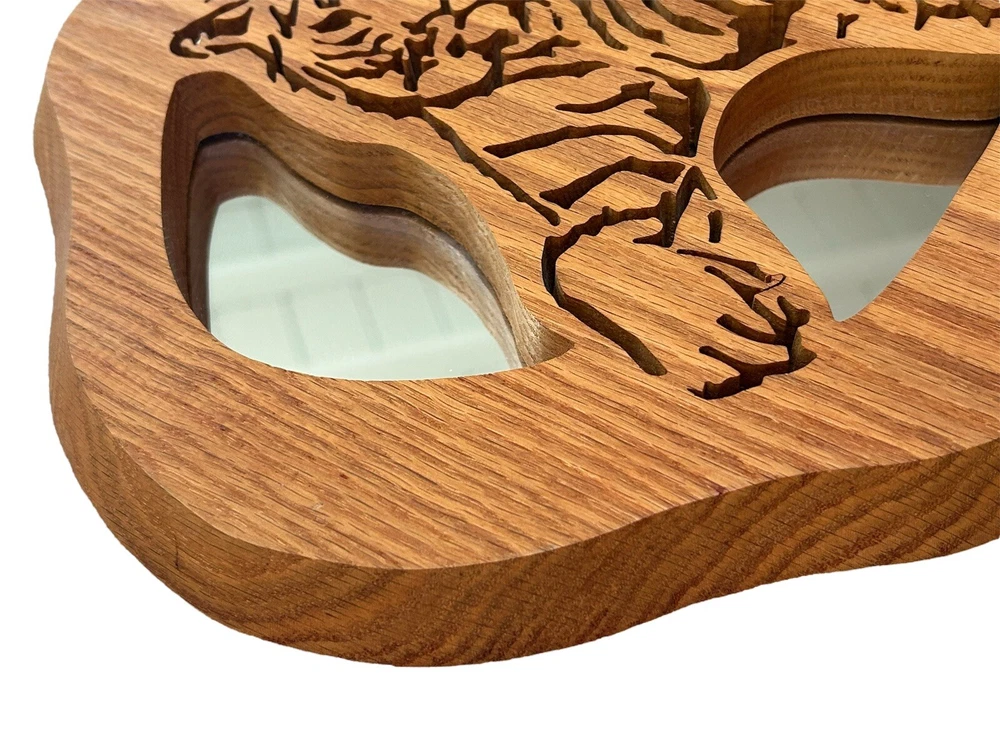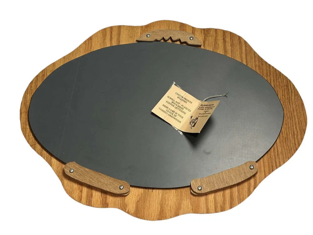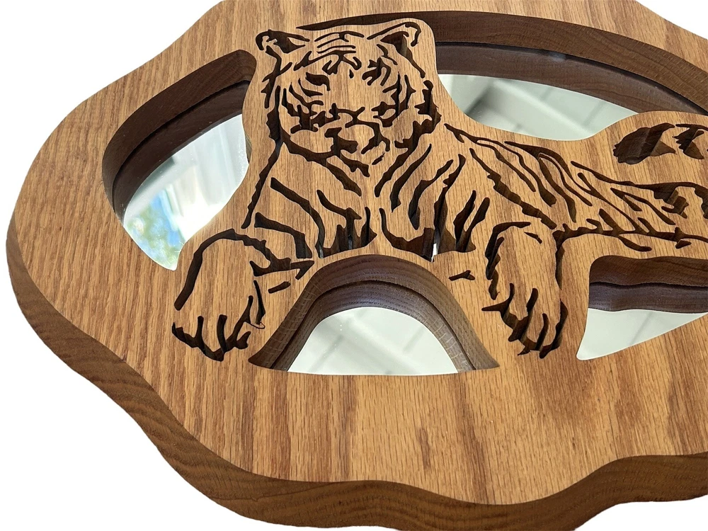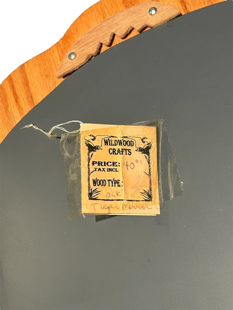 Beautiful and unique, this vintage, hand crafted wooden tiger mirror is not only one of a kind, but excellent quality. Comes with its original tag. Made from oak wood by Wildwood Crafts in Idaho. Measures 15” by 12” and is a little under an inch thick. Excellent condition.