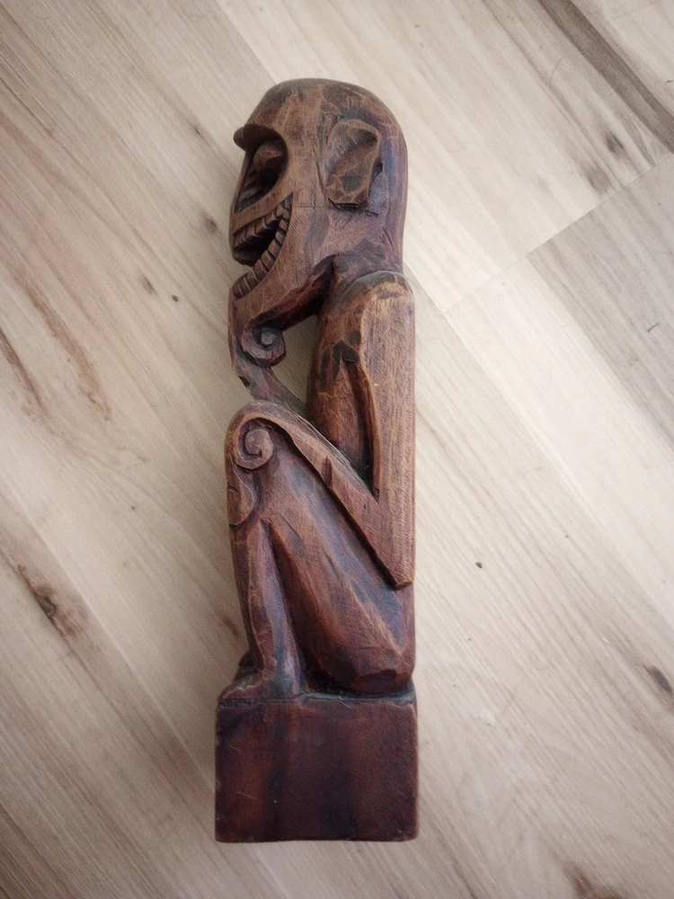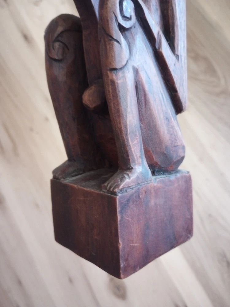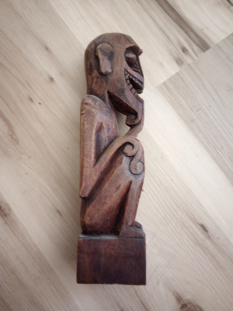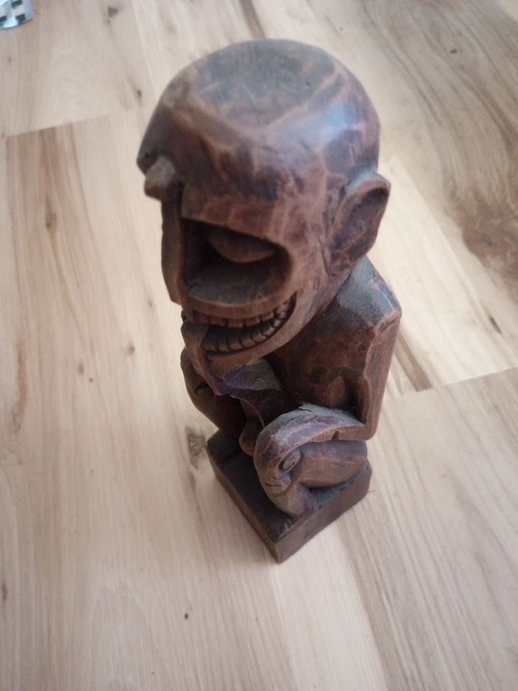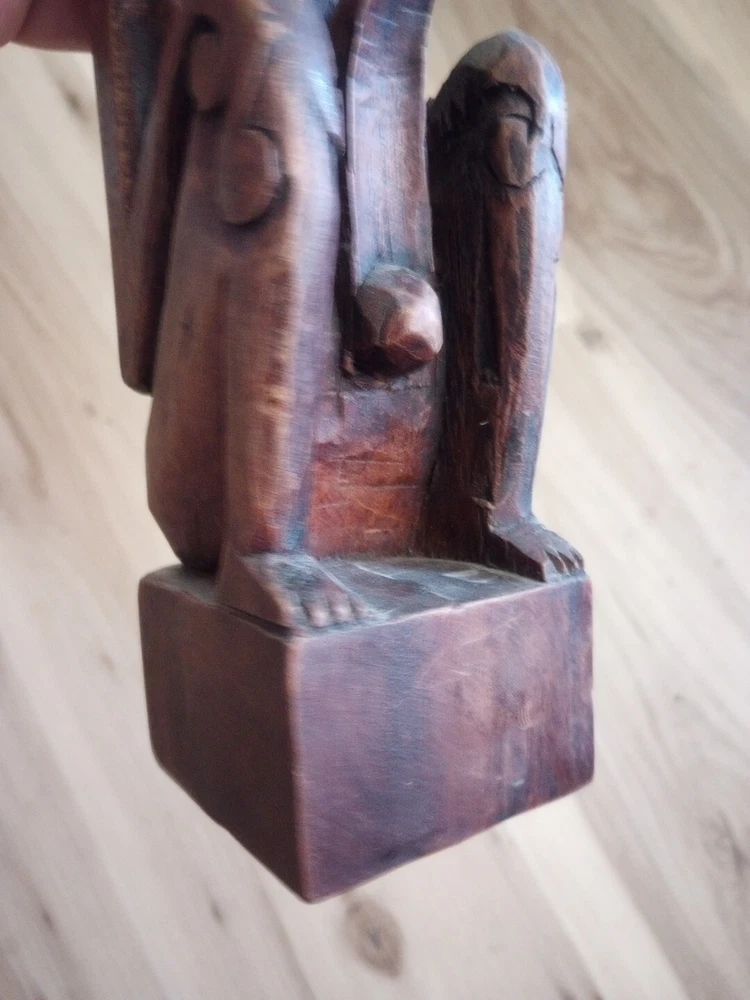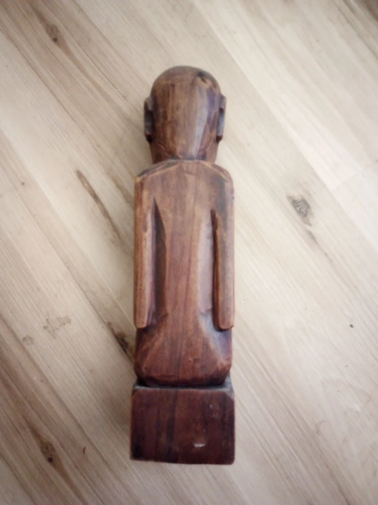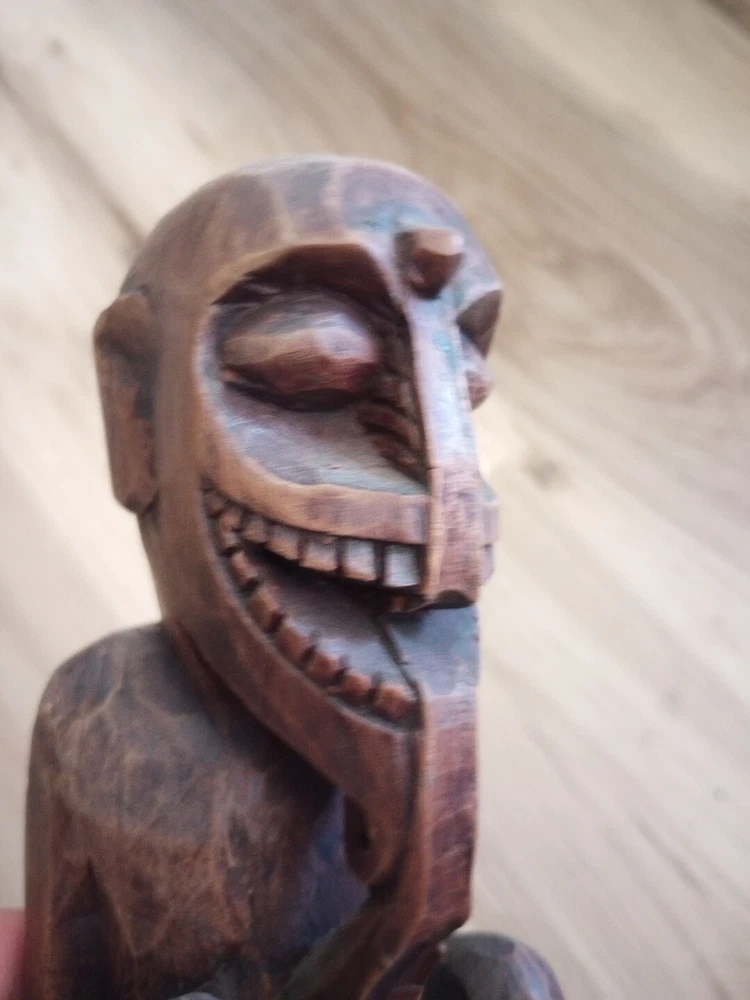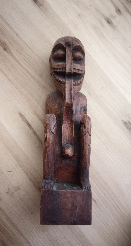 This hand carved wooden statue is a unique piece with unknown origins. It could possibly be a fertility statue, but its true purpose remains a mystery. The craftsmanship is excellent and the details are intricate, making it a remarkable addition to any collection. The statue's country or region of manufacture is unknown, adding to its enigmatic charm. It is a vintage item and has been previously owned, but its history only adds to its allure.