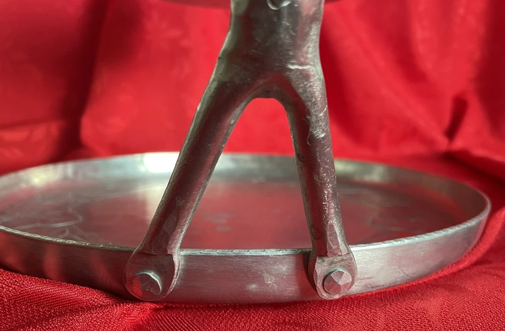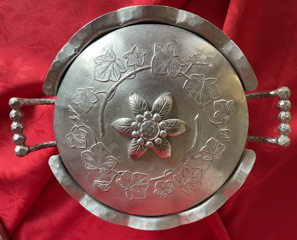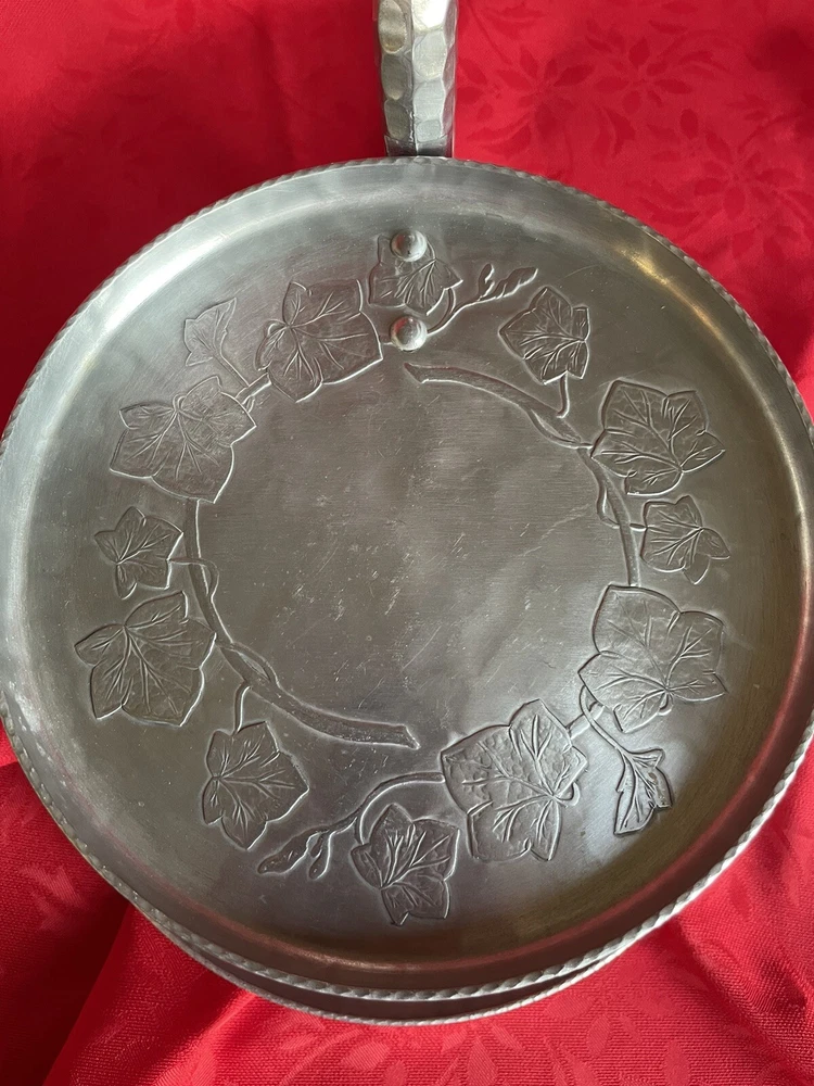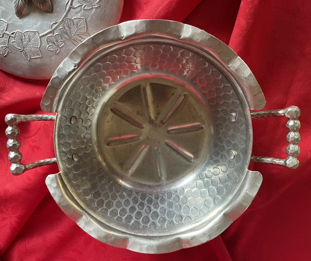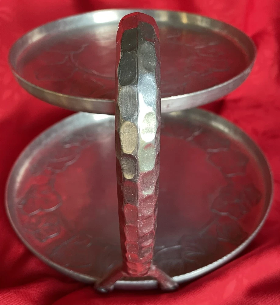 This set of hand forged aluminum serving pieces from Everlast is a stunning addition to any collection. The two pieces consist of a two tier tray perfect for displaying hors d'oeuvres and a covered dish/bowl ideal for serving dips or sauces. The craftsmanship of this set is evident in the intricate details and the use of high-quality materials. The brand Everlast is known for their exceptional design and this set is no exception. The country of origin for these pieces is the United States and they are handmade, adding to their uniqueness and value. The material is sturdy aluminum, ensuring durability and lasting beauty. The set falls under the category of metalware, specifically aluminum, and is a highly sought-after collectible. Make these beautiful pieces a part of your collection or add them to your entertaining arsenal today. The design consists of trailing leaves and a raised flower on the center of the lid. Measurements are; Bowl-12”x10” including handle and 5” tall including lid. 2 tier display tray- 9.5” tall, 8” diameter top plate and 11” diameter bottom plate. Please view all photos for wear, details and condition. Reasonable offers considered. Thanks for shopping!