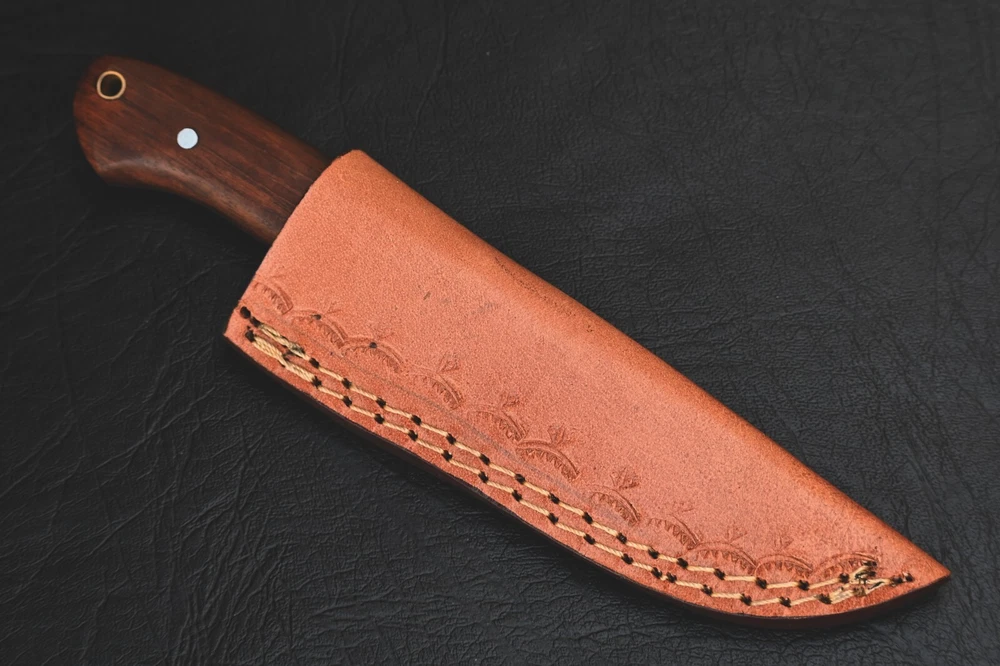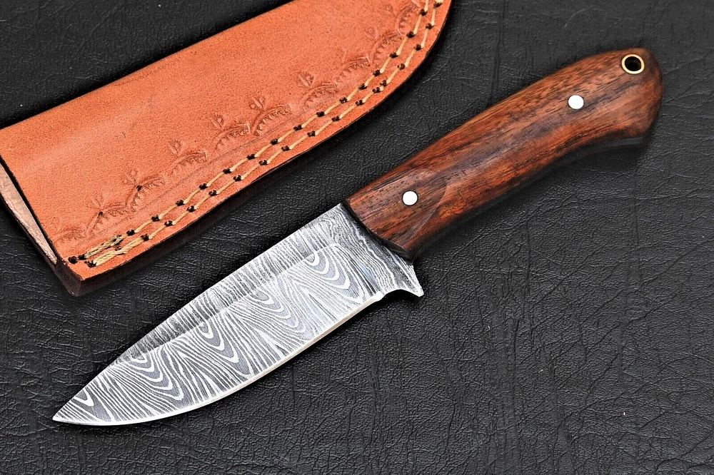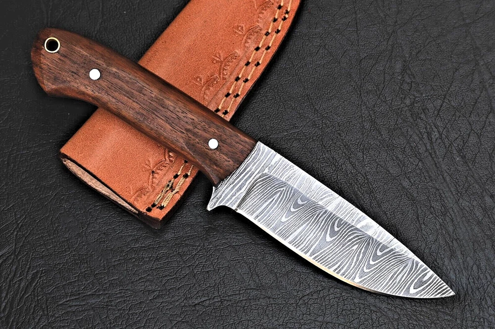 FORGED DAMASCUS STEEL SKINNER KNIFE CUSTOM MADE HAND HUNTING CAMPING SURVIVAL HIKING KNIFE Wood Handle This superb design knife is hand forged. Blade of this knife has a nice file work and is made of 512 layers of 4340 stainless steel and 1075 high carbon steel and hardness 55-58 HRC . This robust knife is lab tested under intense conditions, the balance and shape of this knife ensures perfect grip. Overall Length: 8" Inches Blade Length: 4" Inches Handle Length: 4" Inches Damascus Design: Rain Drop Pattern Layers: 512 Hardness: 55-58 HRC Package Includes: with Leather Sheath Warning: Keep fingers clear of blades. Store away from children.