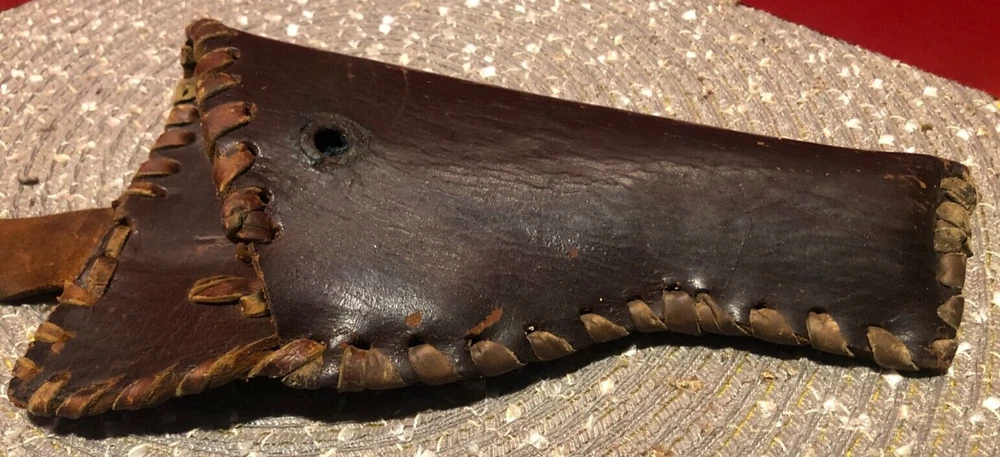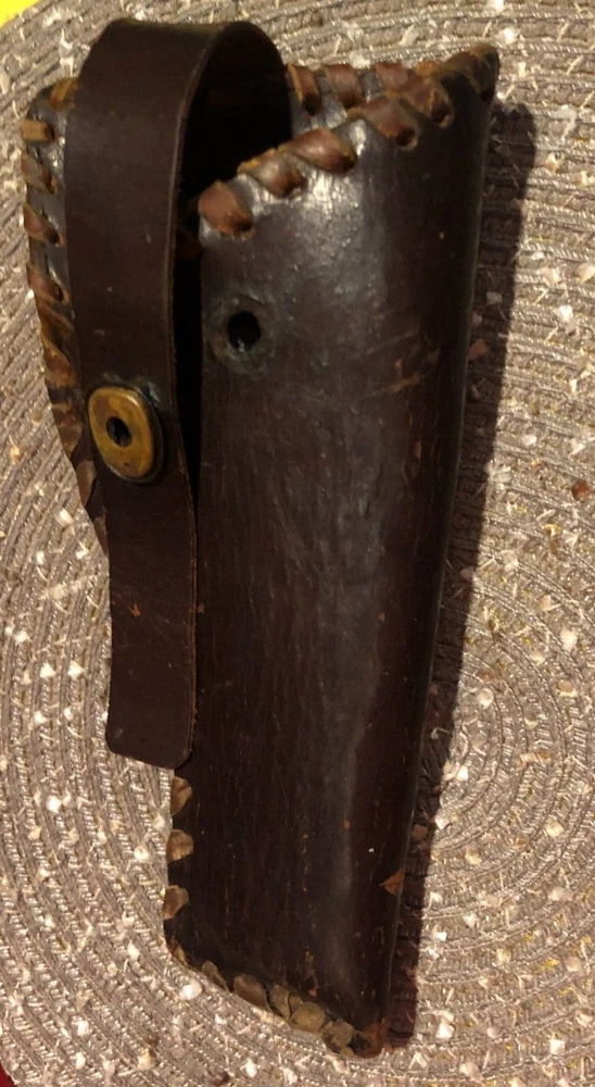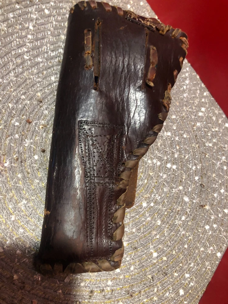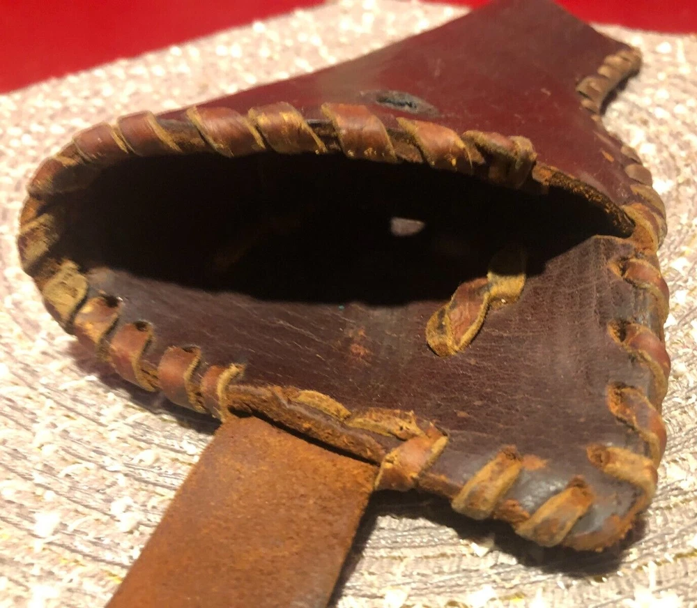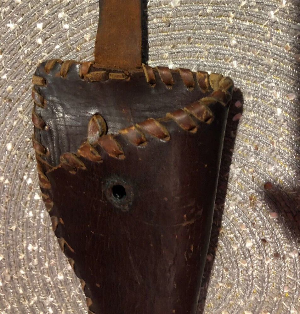 Vintage, Hand Made, Leather Holster with Leather Stitching. The holster will accommodate long barrel revolvers. The strap needs repair on the clasp as shown in the pictures. I cannot take enough pictures to show how good of condition this old holster is in for its age.