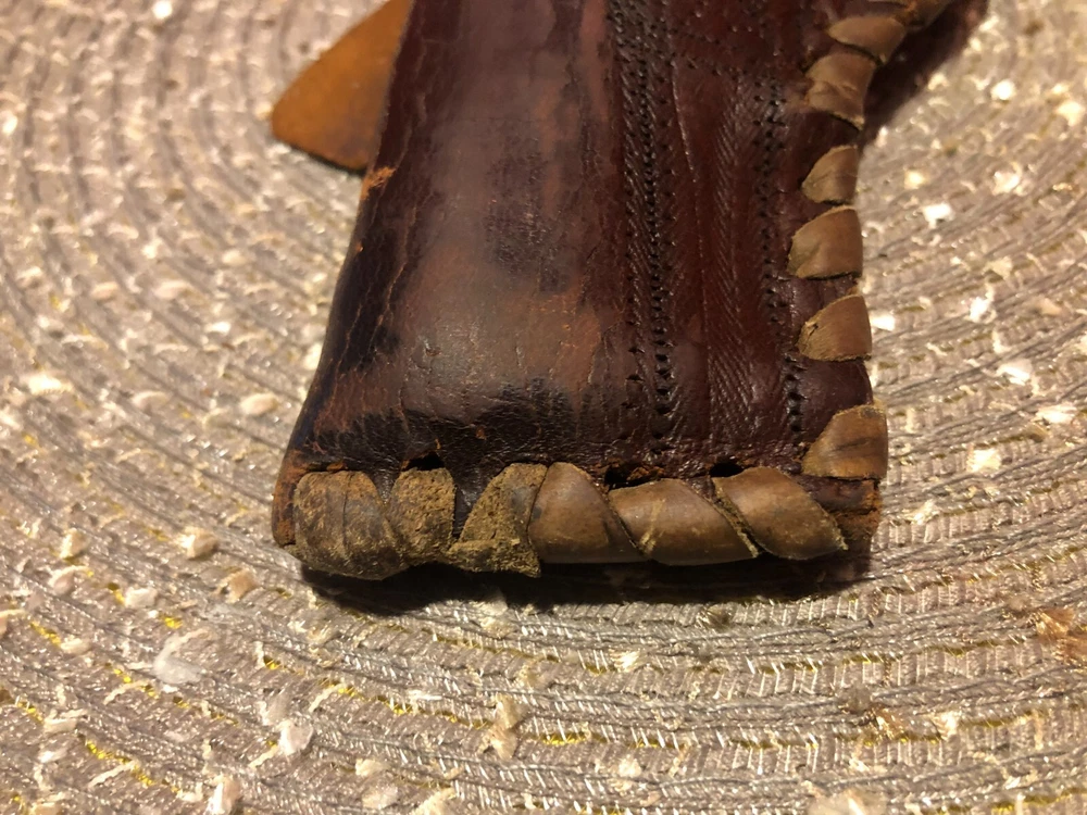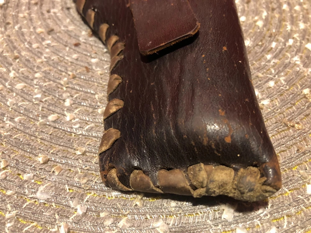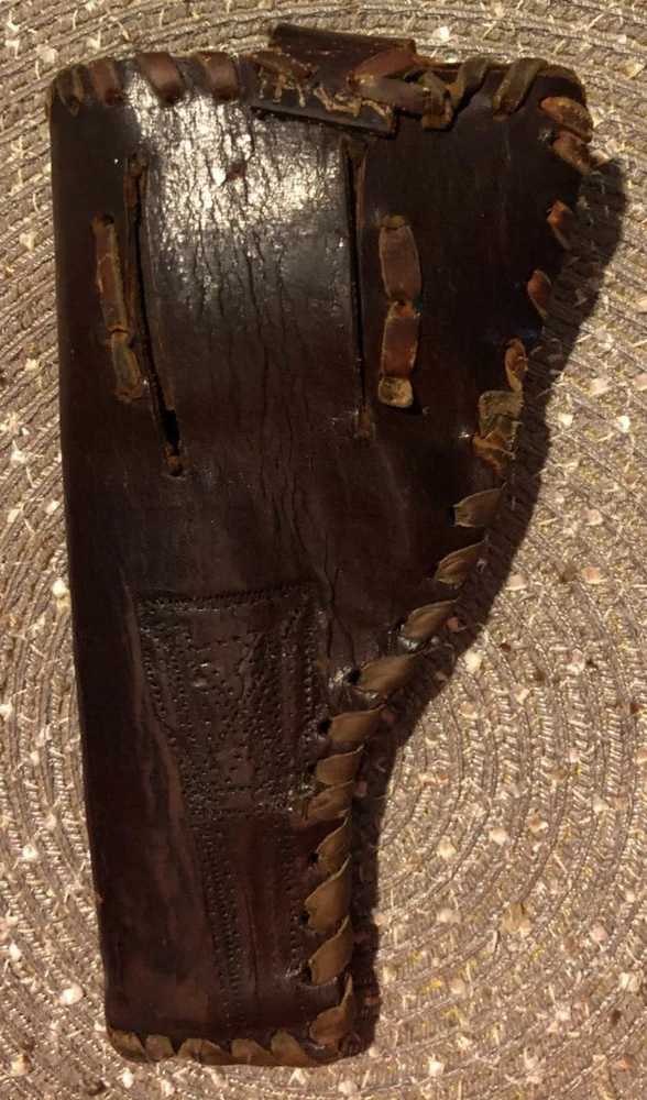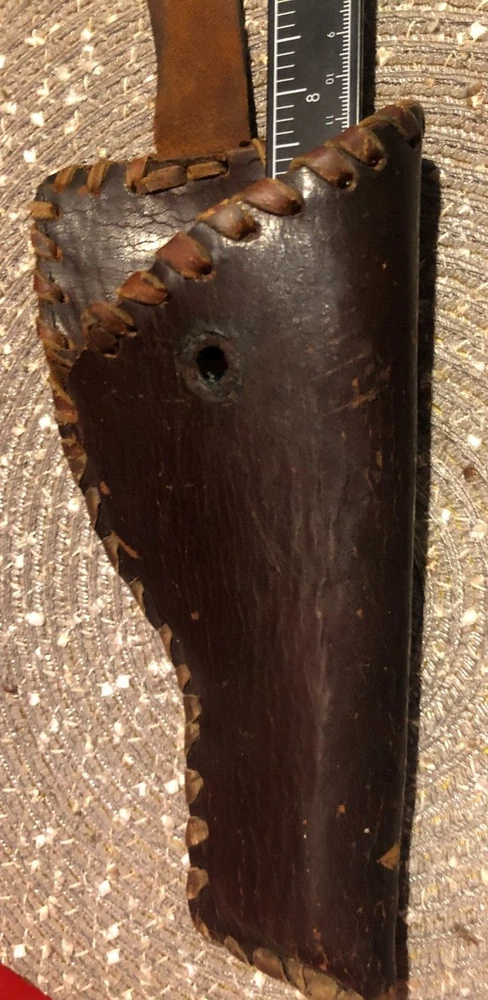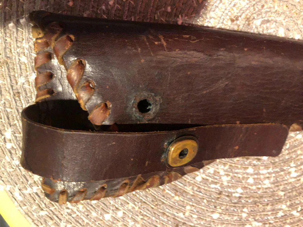 Vintage, Hand Made, Leather Holster with Leather Stitching. The holster will accommodate long barrel revolvers. The strap needs repair on the clasp as shown in the pictures. I cannot take enough pictures to show how good of condition this old holster is in for its age.