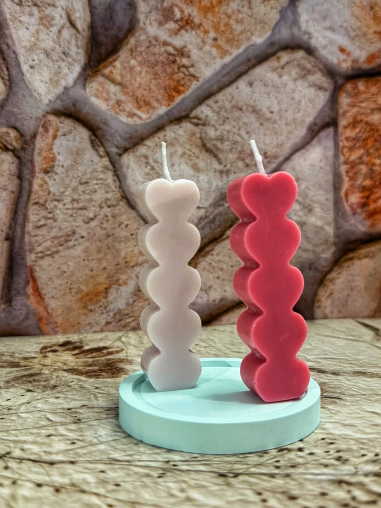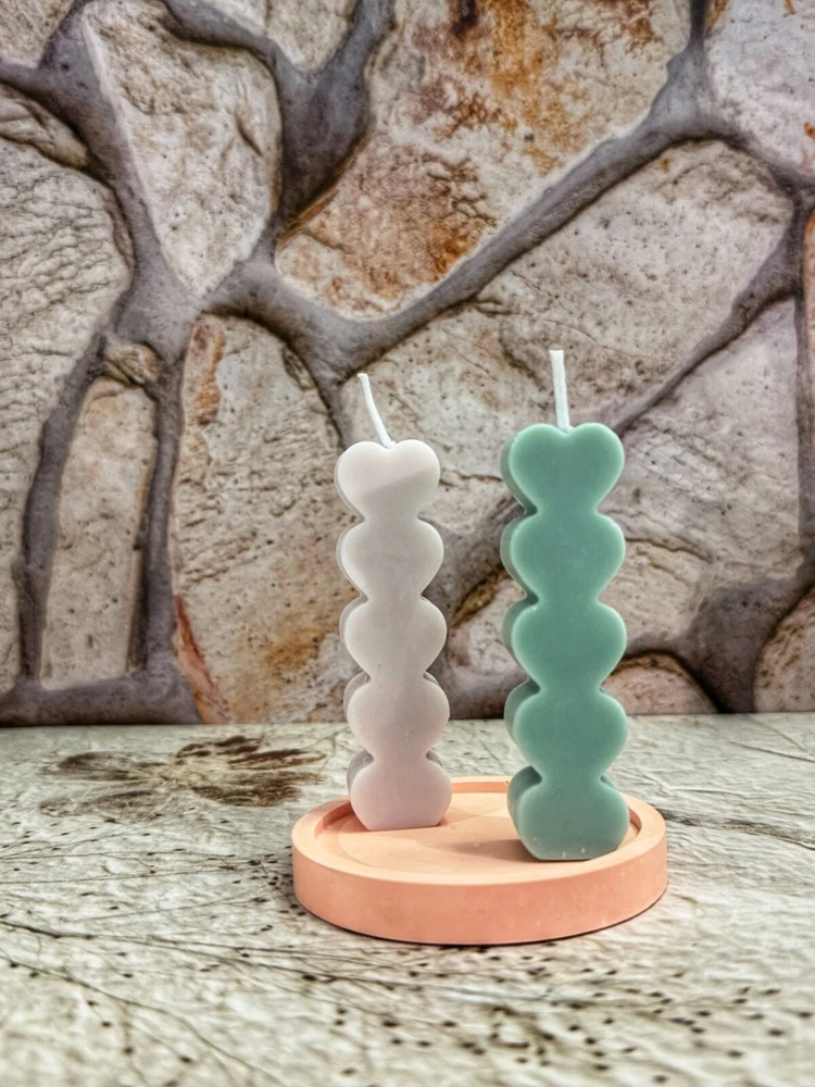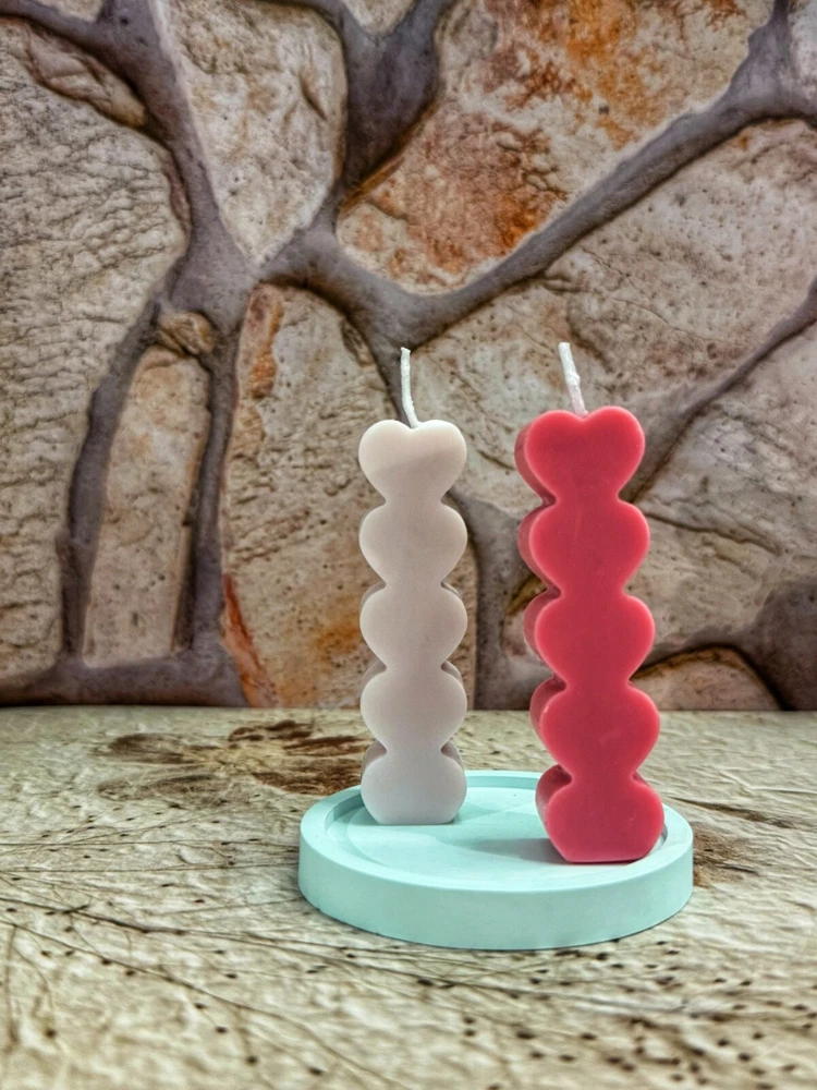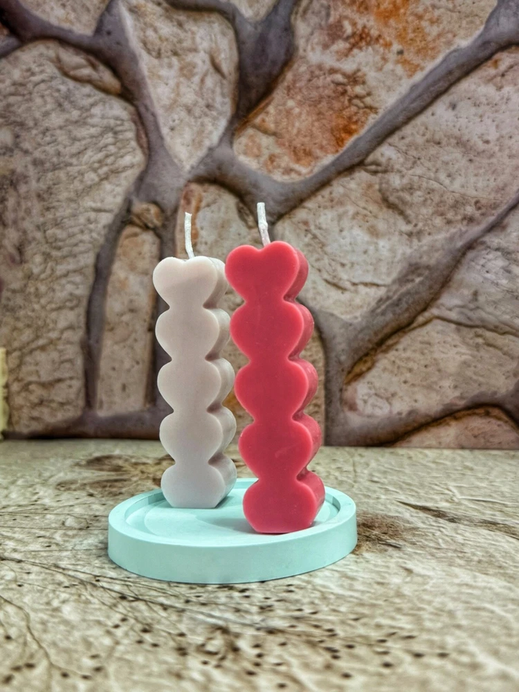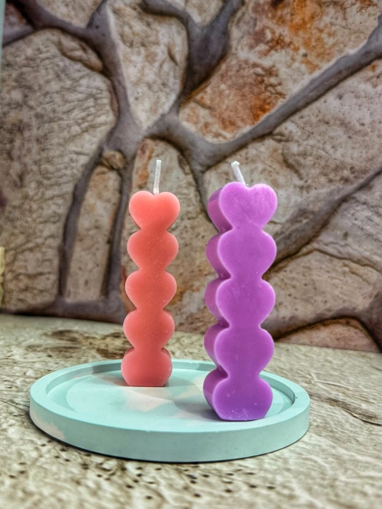 The candle is heart-shaped, small, multicolored, and made of soy wax. It is scented with vanilla and has a modern style. It is 4 inches in length, 4 inches in height, and 1 inch in width. It weighs 5 ounces and has a burning time of 1-2 hours. This handmade decorative candle comes in a set of 2 and is suitable for various rooms like the entryway, bedroom, living room, and dining room.