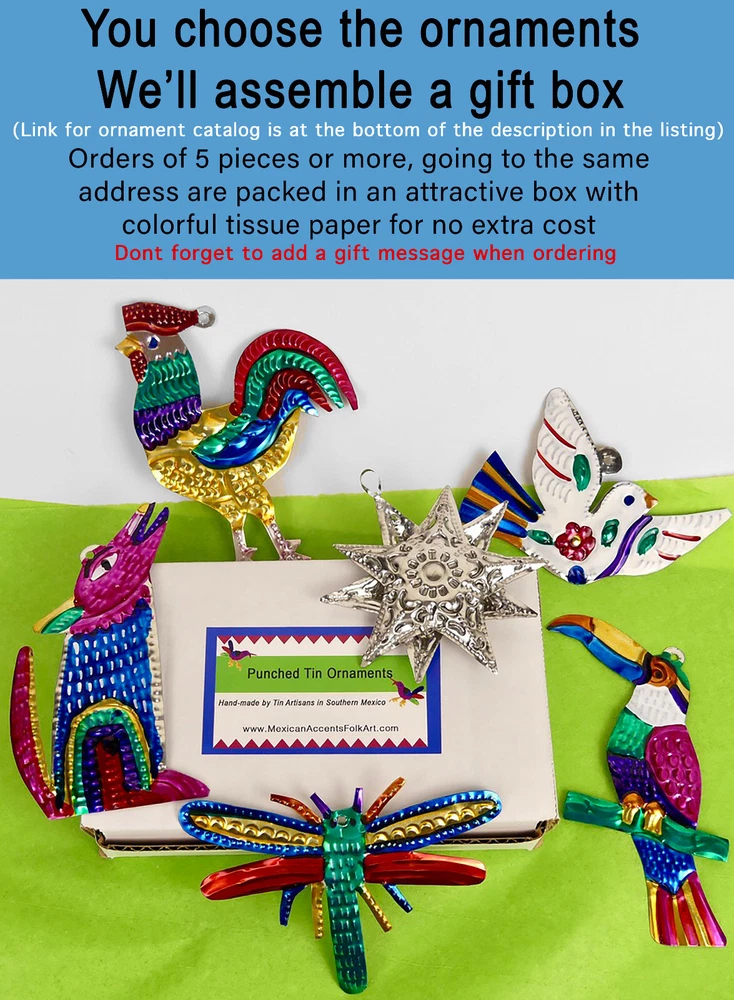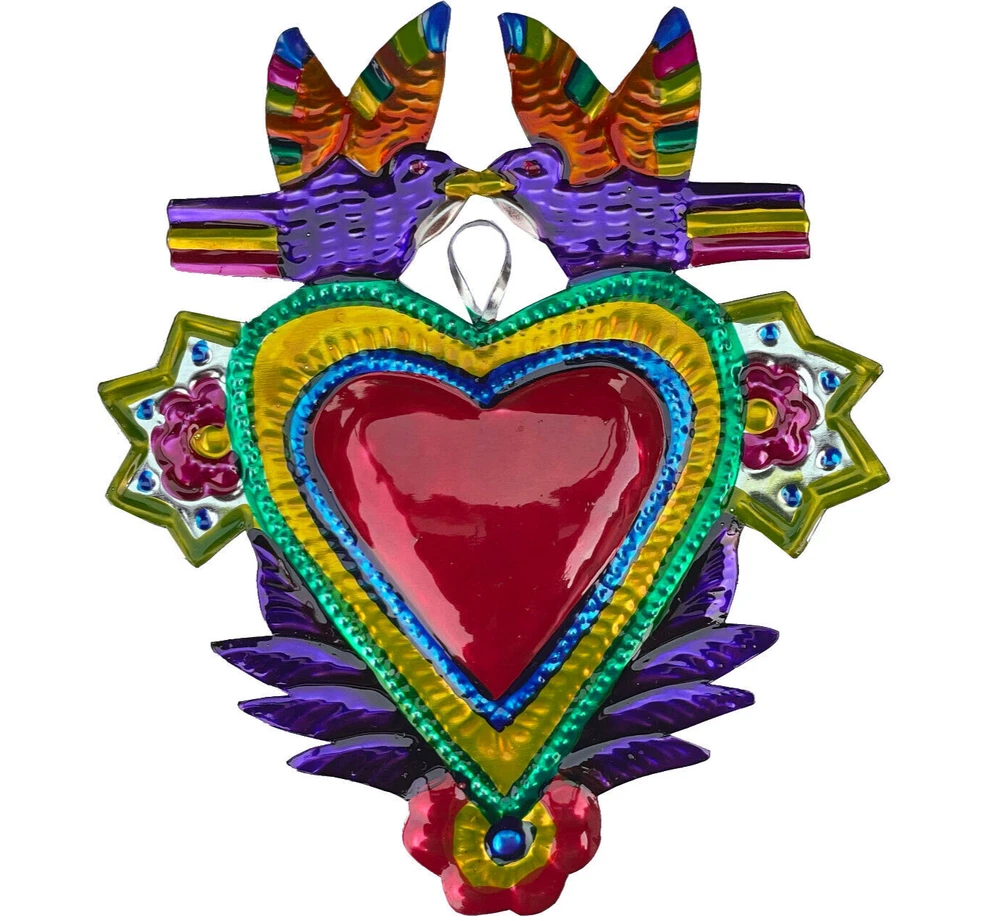 • Heart Milagro or Ex-Voto Ornament, carried by doves, hand-made from punched tin in Southern Mexico by skilled Tin Artisans • Bright, vivid colors, painted on one side only • 5.00” high x 4.25” wide (12.70 cm high x 10.8 cm wide) • Can be hung as Christmas ornaments, used in wreaths or garlands, or used as embellishments for greeting cards. • Nice gift, momento, or favor for weddings, wedding showers, anniversaries (or specifically, the 10th (tin) anniversary). Mexican Punched Tin Ornaments make nice gift boxes! If you order 5 or more ornaments (mix or match from the link below) and have them sent to the same address, I will package them in a nice box with colorful tissue paper. The box can be used to store the ornaments when not in use. Combined Shipping for mulitiple purchases: Ornaments shipped w/in the United States ship at a flat rate of $4.25 no matter what quantity you buy, but… To get the lower shipping charges, please request an invoice. If you request an invoice I will combine shipping costs. Please use the Cart feature (under the Buy-It-Now button) to add items until you are done shopping.Then hit the Request total from seller button. If you don’t do this, you will be charged excess postage by eBay. (note, if you are only buying multiples of the same ornament (i.e. only buying 4 cats) eBay will charge you the correct amount for shipping. International Combined Shipping for multiple purchases: Ornaments going internationally ship at a flat rate of $15.00 US dollars, no matter what quantity you buy. If shipping outside of the United States, please expect 1-3 weeks for arrival I sell a nice variety of tin ornaments which can be found here