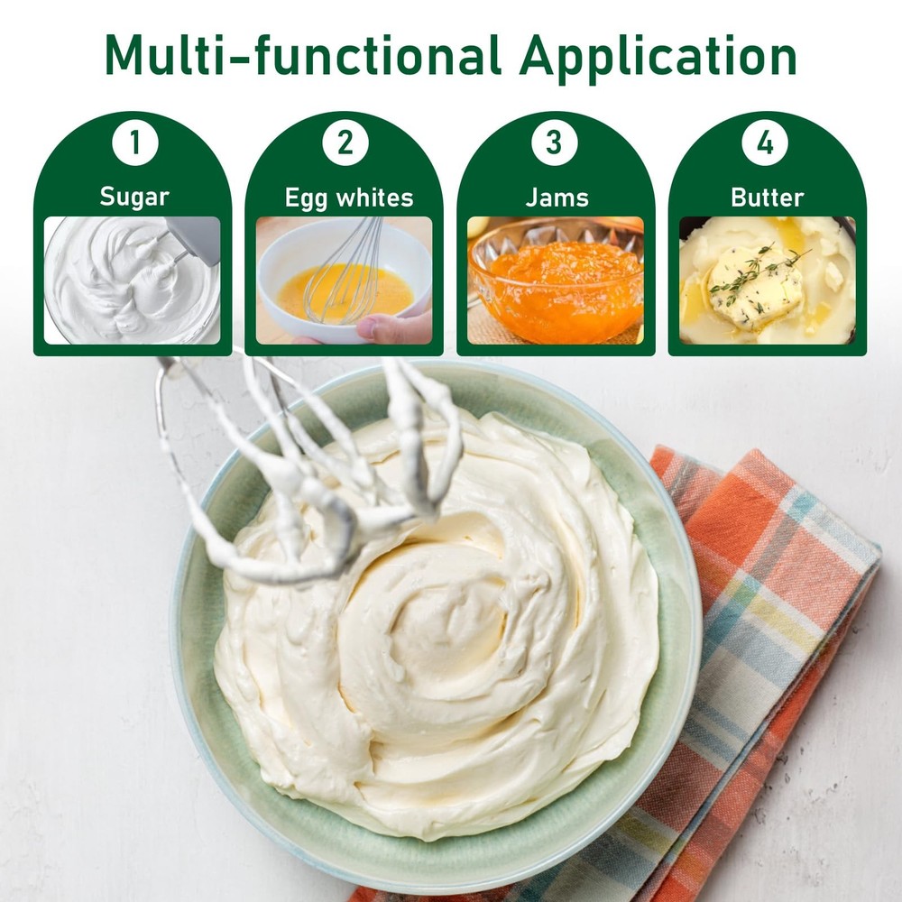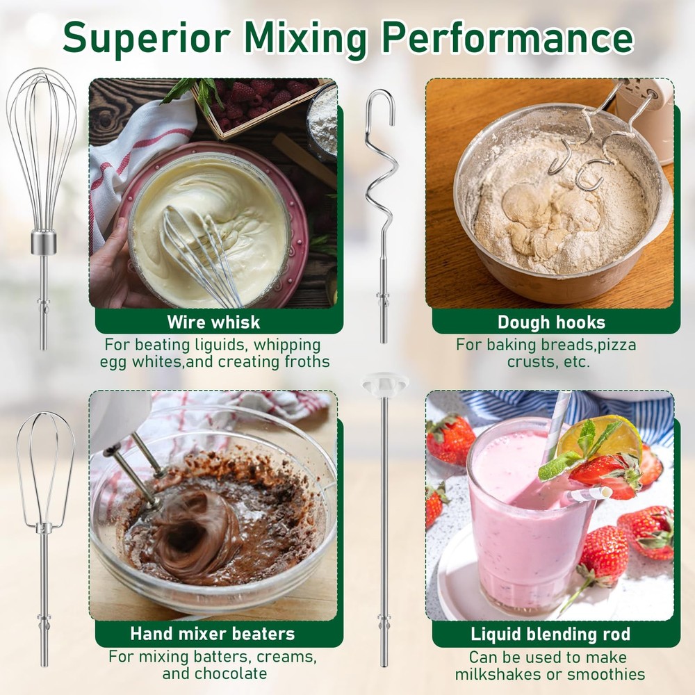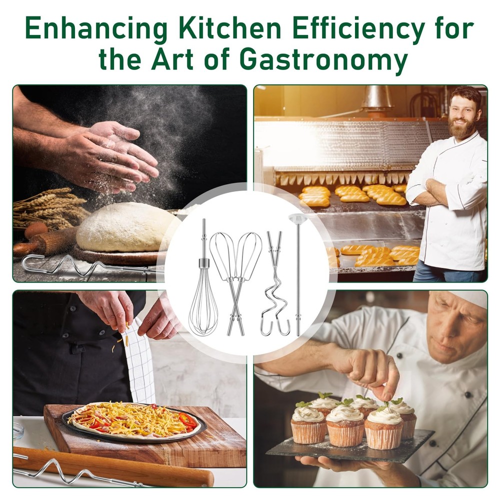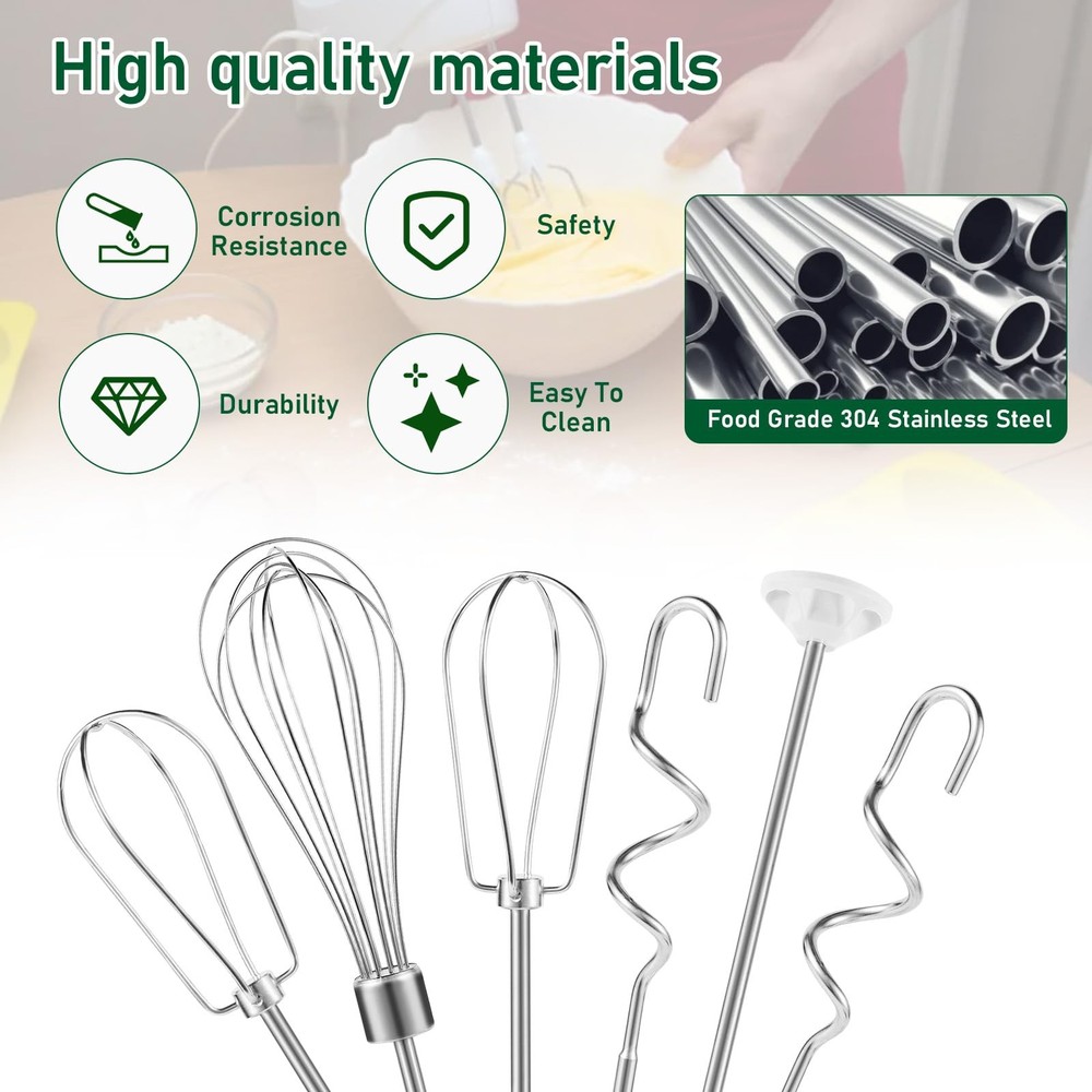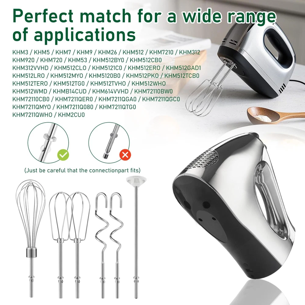 Hand Mixer Attachments for Kitchenaid: Including stainless steel hand mixer Accessories 1 whisk, 1 blending rod, left and right turbo style stainless steel beaters, 1 dough hook compatible with kitchenaid hand mixers Function of Beater and Whisk: The hand mixer accessory whisk mixes air into the mixture for a light and fluffy texture, can be used for whipping cream, making meringue, mixing cake batters, creams, egg whites, etc., and provides optimal mixing performance Function of Blending Rod and Dough Hooks: Stainless Steel Dough hooks are used to promote the development of gluten in the dough and to strengthen the dough structure, especially important for baking breads, pizza crusts, etc. And blending rod is used to make milkshakes or smoothies Compatible with Kitchenaid Hand Mixer: Hand Mixer Attachment Replacement Parts Stirring Stick, Whisk, Beater and Dough Hook, Compatible with Kitchen Aid Hand Mixer KHM3 KHM5 KHM7 KHM9 Stainless Steel Attachment: Food grade 304 stainless steel hand mixer attachment for easy hand or machine cleaning, easy to install, pop up and use Hand Mixer Attachments for Kitchenaid: Including stainless steel hand mixer Accessories 1 whisk, 1 blending rod, left and right turbo style stainless steel beaters, 1 dough hook compatible with kitchenaid hand mixers Function of Beater and Whisk: The hand mixer accessory whisk mixes air into the mixture for a light and fluffy texture, can be used for whipping cream, making meringue, mixing cake batters, creams, egg whites, etc., and provides optimal mixing performance Function of Blending Rod and Dough Hooks: Stainless Steel Dough hooks are used to promote the development of gluten in the dough and to strengthen the dough structure, especially important for baking breads, pizza crusts, etc. And blending rod is used to make milkshakes or smoothies Compatible with Kitchenaid Hand Mixer: Hand Mixer Attachment Replacement Parts Stirring Stick, Whisk, Beater and Dough Hook, Compatible with Kitchen Aid Hand Mixer KHM3 KHM5 KHM7 KHM9 Stainless Steel Attachment: Food grade 304 stainless steel hand mixer attachment for easy hand or machine cleaning, easy to install, pop up and use