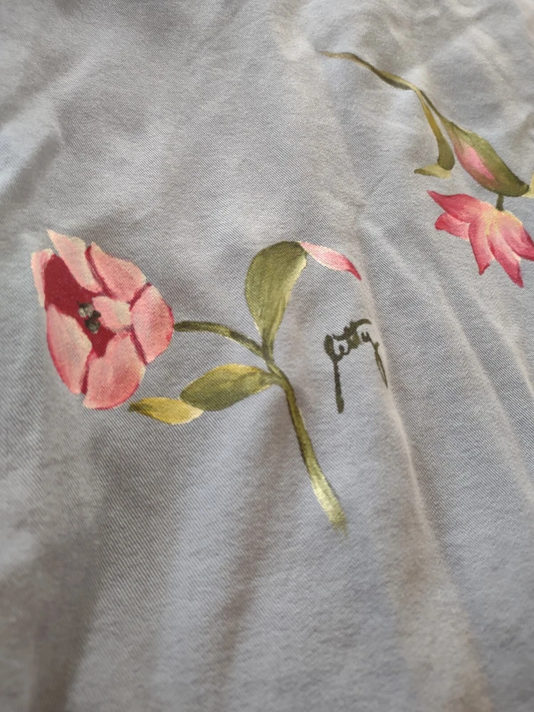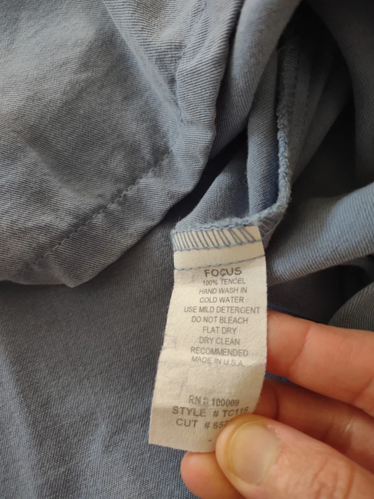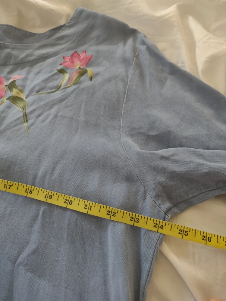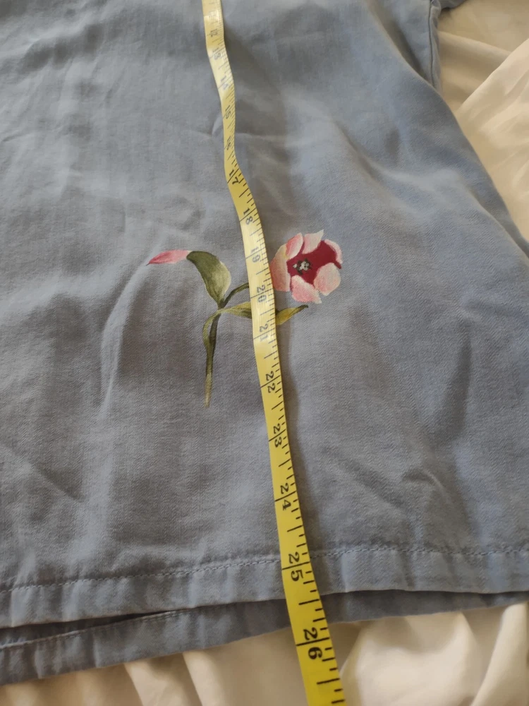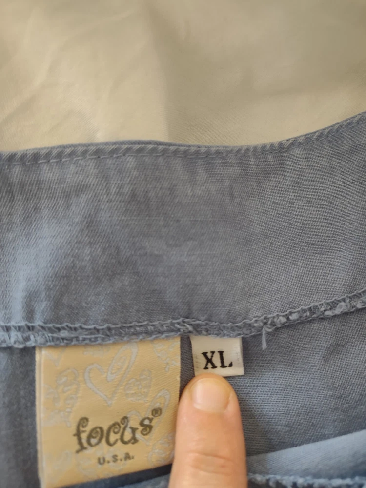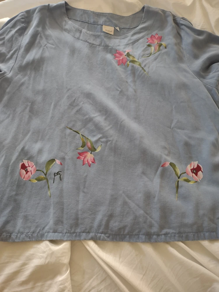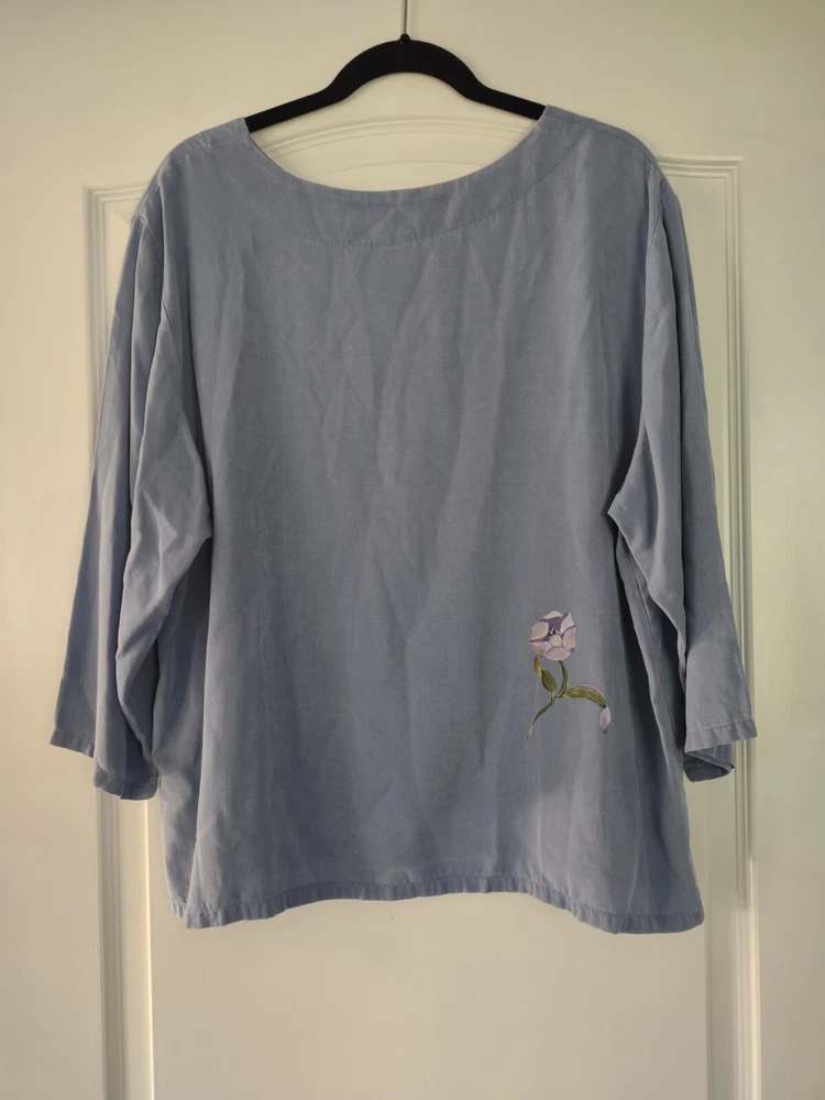 Chambray Top Women's Size XL Blue Hand Printed Floral Blouse Tencel Lyocell Brand- Focus Measurements in pics are pit to pit and full length Excellent pre-owned condition Beautiful pink flowers Art to wear
