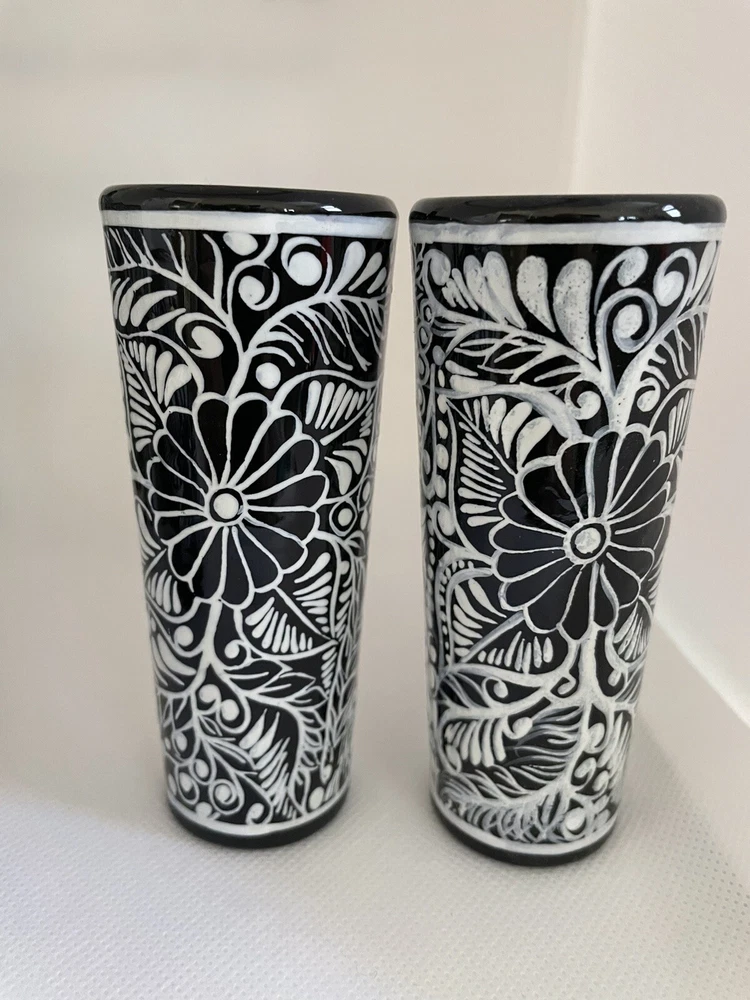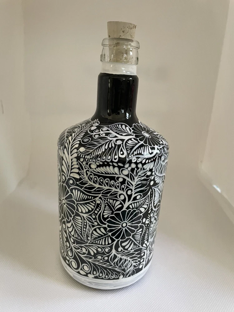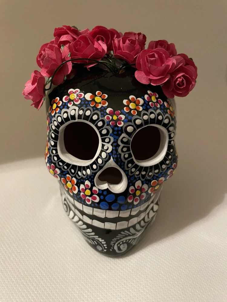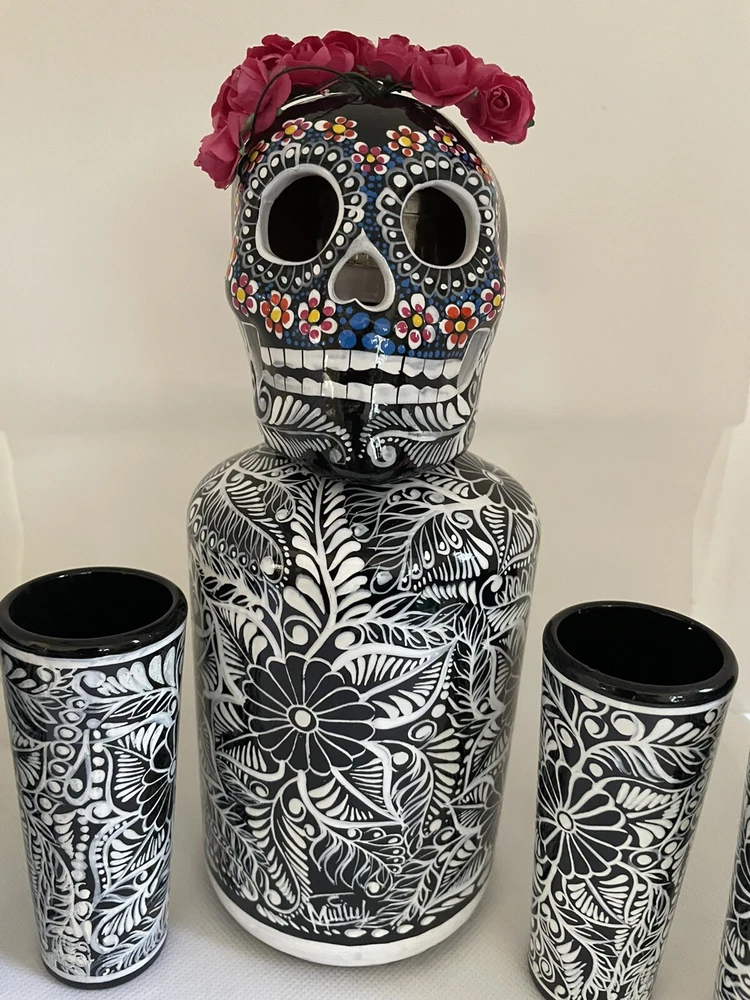 Hand Painted Decanter Set (Frida) with 2 Shot Glasses Unique Hand-Painted Bottles and Shot Glasses. -Handmade artistic creations of Mexican tradition that represents Mexican culture to the world. The Bottle. -One of a kind Hand-Painted Decanter Set, skillfully crafted by an Artisan in Mexico. Artisans never repeat the same painting pattern. The delicate process for the elaborate design of the bottle takes the artisan several hours to complete. The head is a handmade clay skull and painted fully to compliment the covering design of the bottle. The bottle is not only a decoration but it also has the functionality to be filled with any desired liquor, transforming this PIECE OF ART into a beautiful utility. The bottle holds 750 ml. (25oz) and comes With a cork, so you can refill it with any spirit or liquid. The shot glasses hold 2 oz. (60ml.) each. Simbolism. The Skulls in the Mexican culture represent a tribute to passed beloved ones. It is a fundamental piece of the altar for the Day of the Death as a form of commemoration for those who once brought happiness. The Day of the Death is a festival to honor the memory of lost loved ones who are believed to come back to visit their family from the afterlife