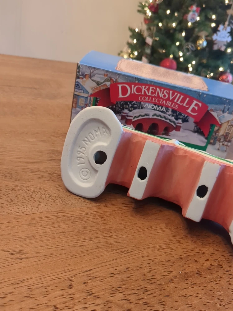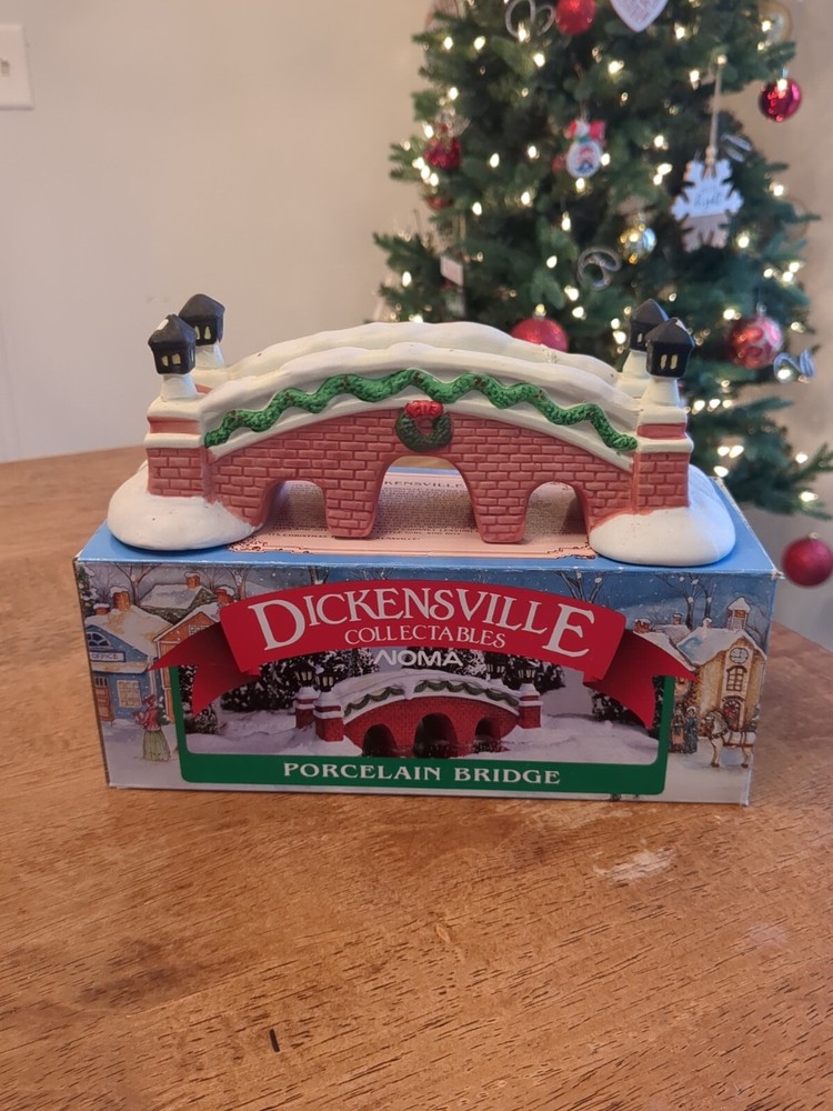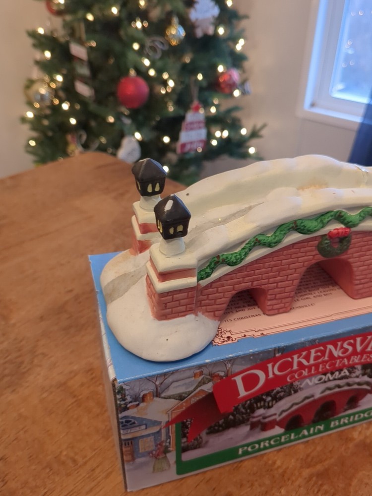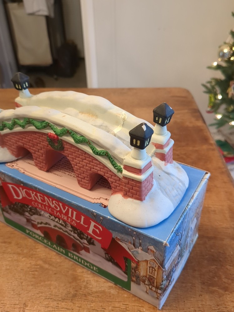 This is a Lemax Dickensvale Collectables Christmas Village accessory featuring a hand-painted porcelain lamp bridge. The product is made in China and is designed as part of a holiday-themed collection. In original box