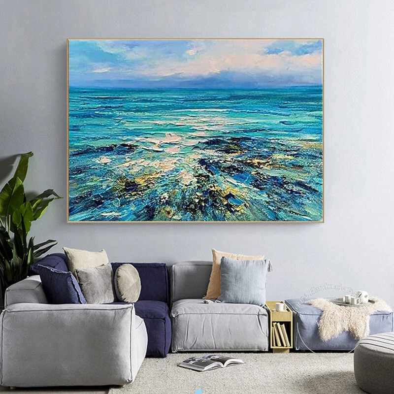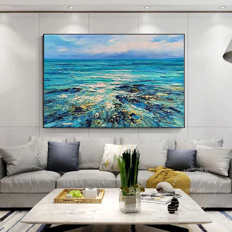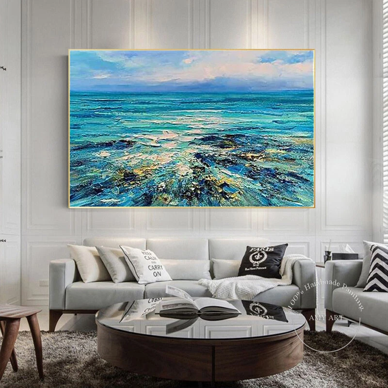 Hand Painted Oil Painting Wall Art Abstract Blue Sea Boat Paintings Home Decor