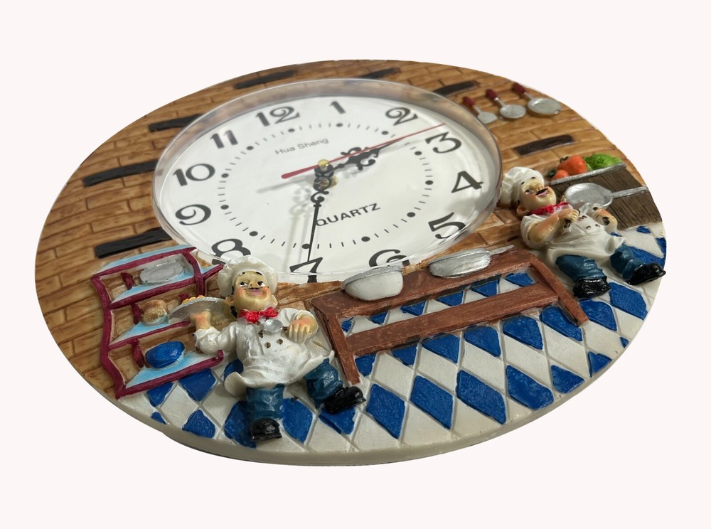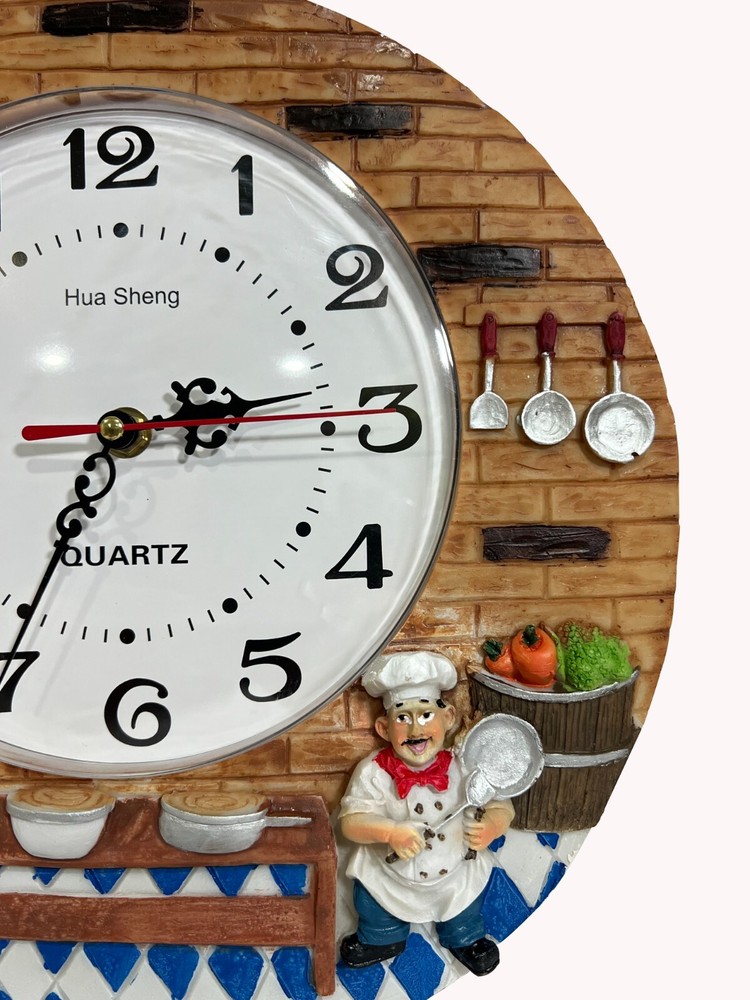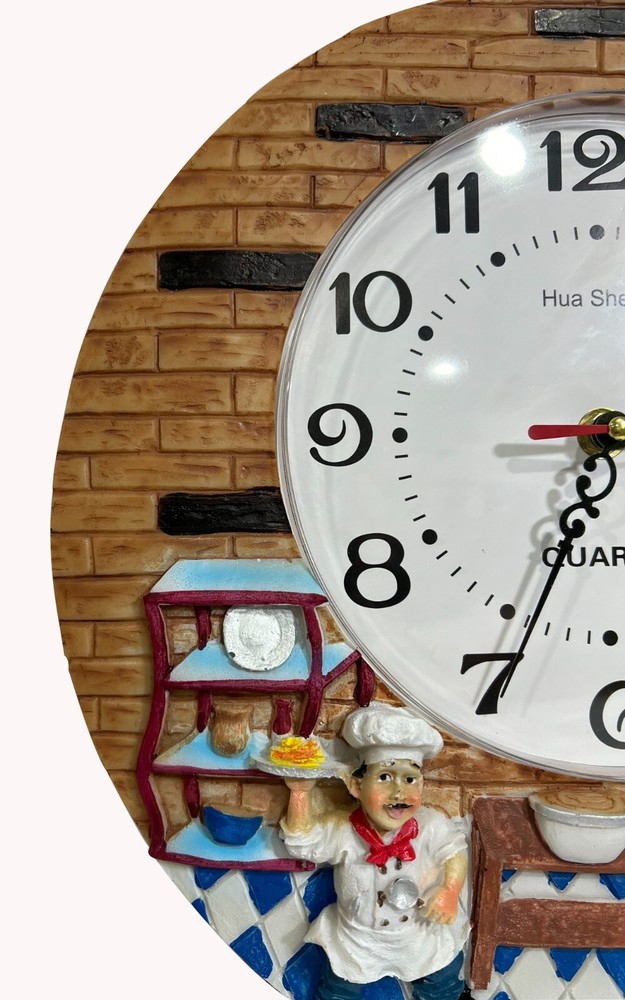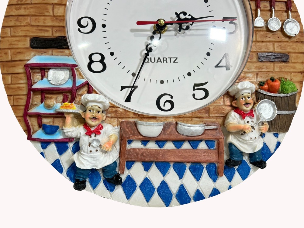 Color Multicolor Display Type Analog Style Kitchen Chef Theme Special Feature Quiet Operation, Easy To Read, Non-ticking, Sweep Movement Product Dimensions 12"W x 12"H Power Source Battery Powered Age Range (Description) Adult Room Type Office, Kitchen, Living Room, Classroom Shape Round About this item Decorative Design: This charming wall clock features a whimsical kitchen scene with chef figurines, adding a delightful touch to your home decor. Easy Readability: The large 12-inch diameter clock face with bold black numerals ensures clear visibility from across the room. Quartz Movement: Powered by a quartz battery (included), this clock offers precise timekeeping with a smooth, silent sweep second hand. Durable Construction: Crafted from high-quality resin, this wall clock is built to withstand daily use and maintain its vibrant colors. Versatile Placement: Suitable for kitchens, living rooms, offices, or classrooms, this clock complements various interior styles.