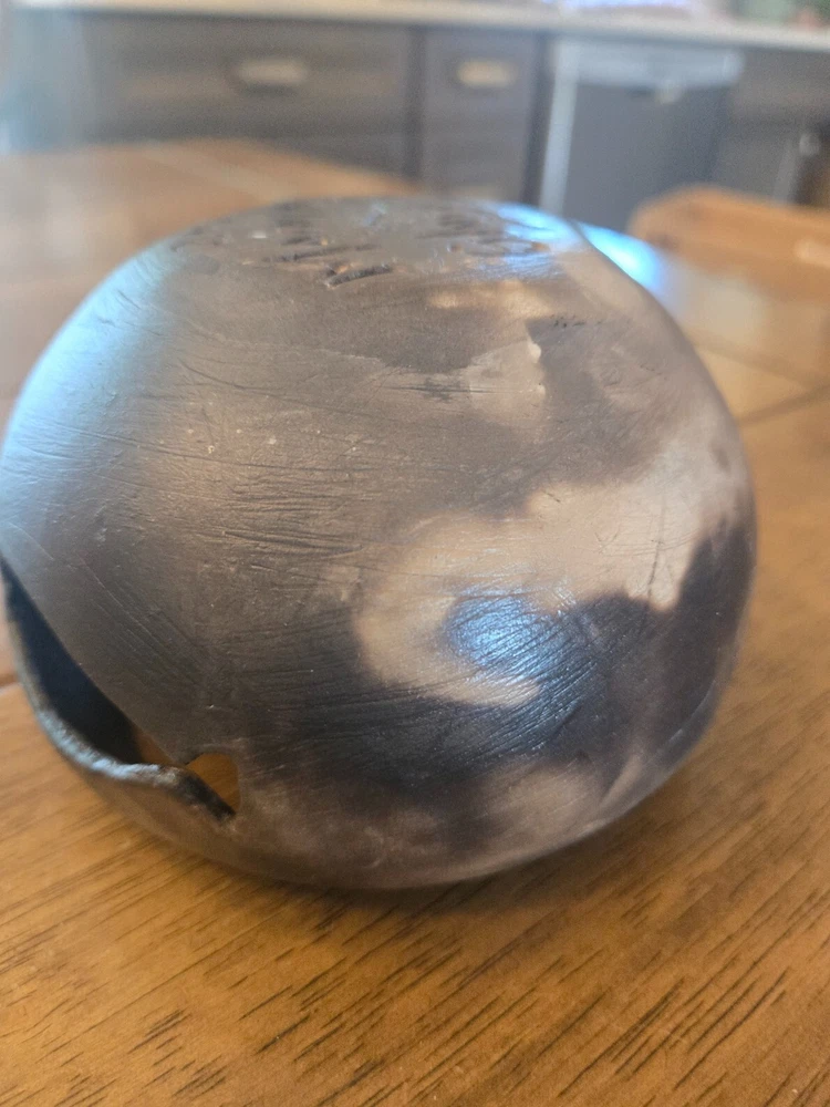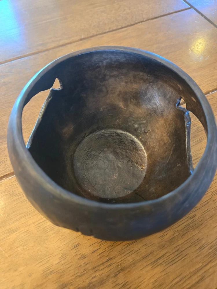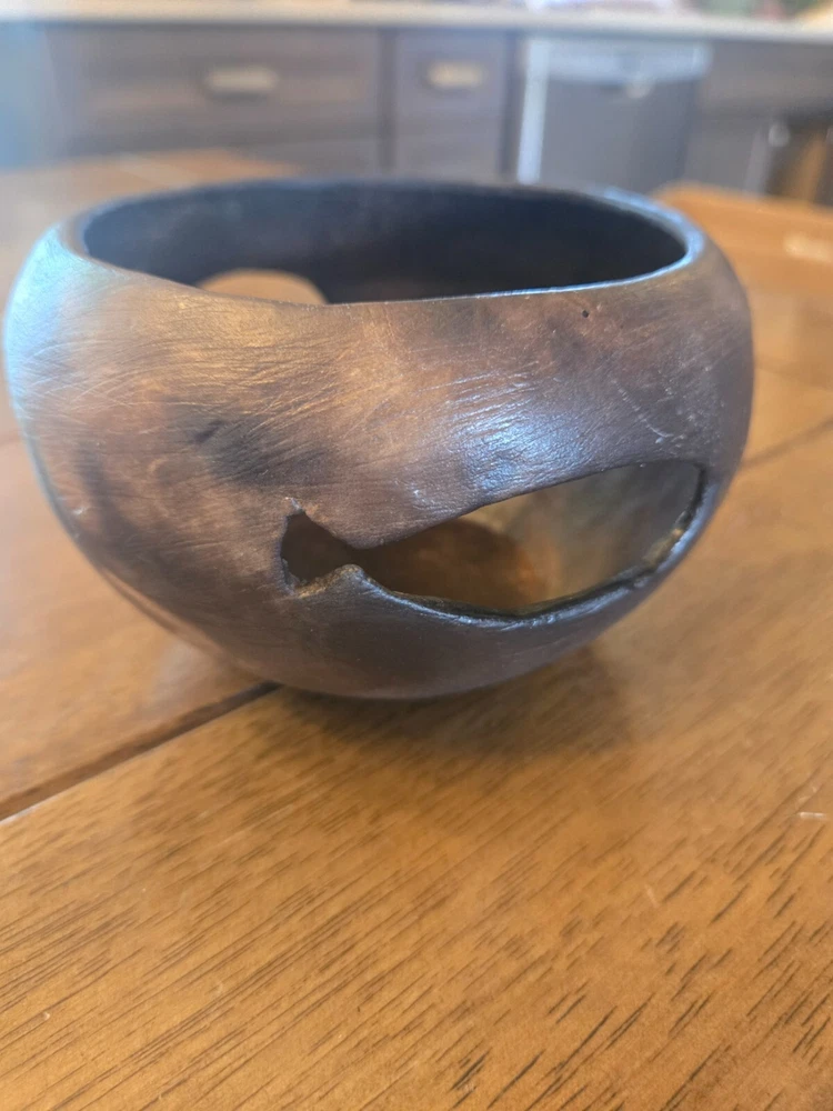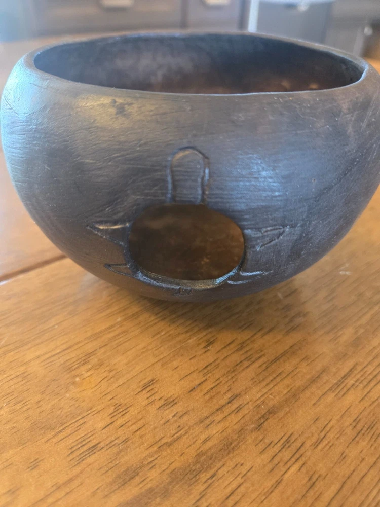 Small, decorative handcarved wooden bowl with 2 fish and a turtle carved out on the sides. The bowl is 4 1/2" across and 3 1/2" high. It is signed "Morning Glory 2011" on the bottom. It is in beautiful shape and would be a perfect addition to any earthy or boho style home.