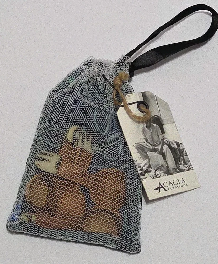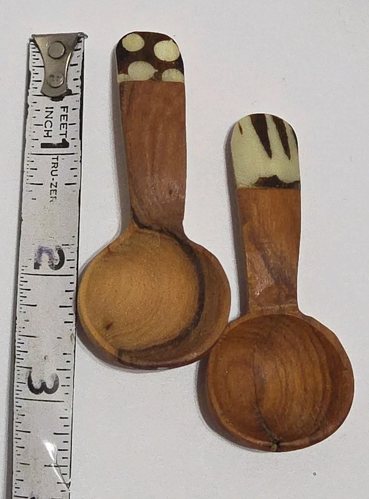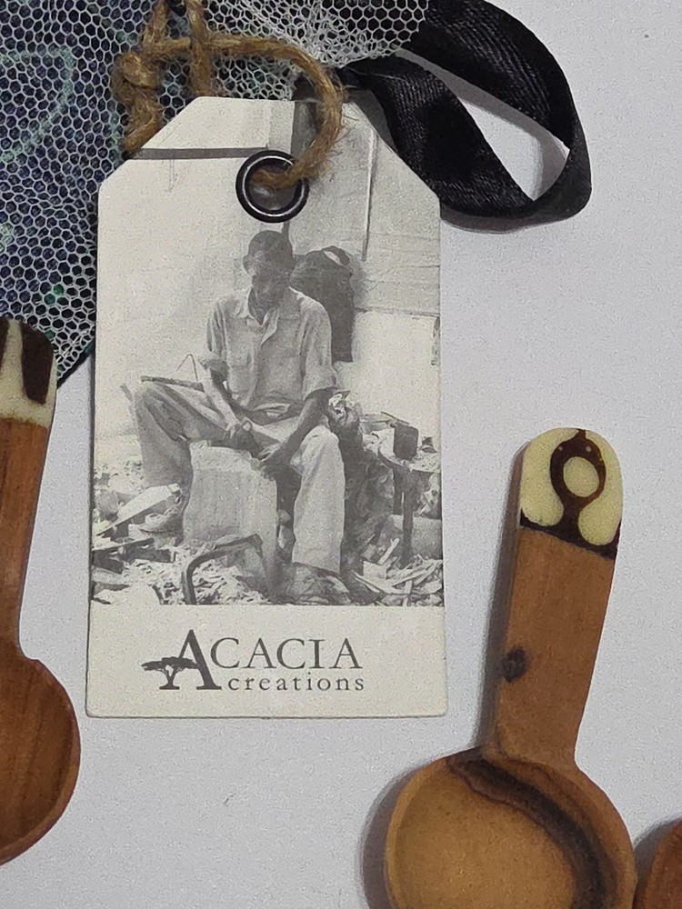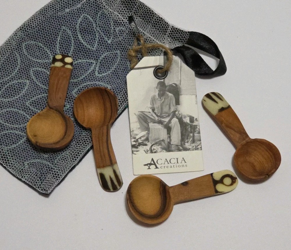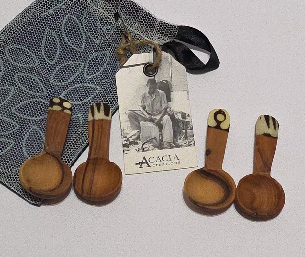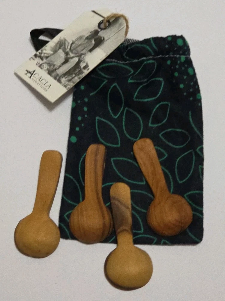 Acacia Creations, Miniature Spice or tastion Spoons. Made of Olive Wood, 4 Piece set with decorative bag for storage. Kitchen Utensil Wooden Hand Carved in Kenya. Please see attached photos for a better description and measurements π