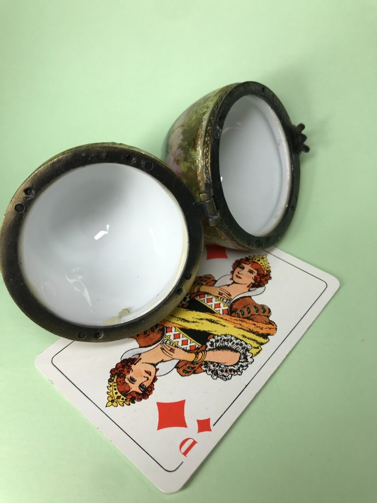 FROM MADEIRA WITH LOVE.... Found in an estate liquidation on the island of Madeira in Portugal, that of a family with ties to France. Purchased a decade ago at the Flea Market in Paris, a hand painted trinket box in the form of an egg. It stands 3 inches tall and was signed by the artist and dated 2006. Additionally marked "Peinte a`la Main" for hand painted. The artist name is i mpossible to decipher. It has survived in good condition, free of chips or cracks, no abrasions. I did notice a small drop of hardened glue on the inside of the lower half that I have left as found. I have inserted a standard size playing card in one photo as a reference for size. MUCH OBLIGED
