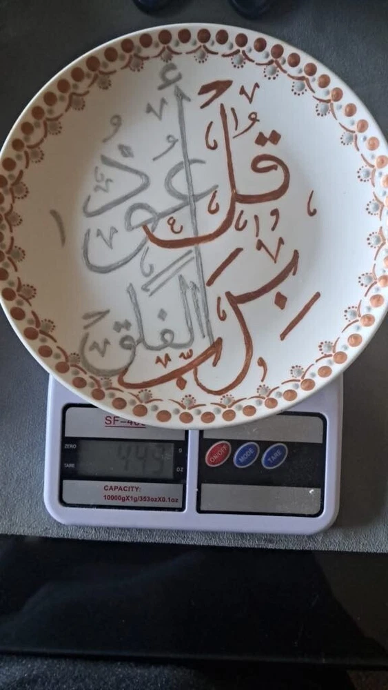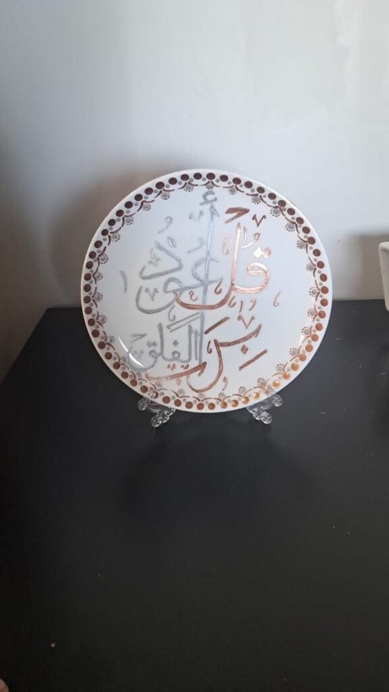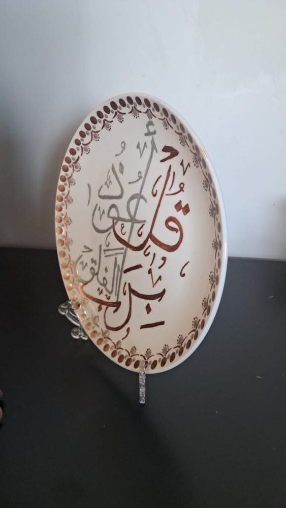 WELCOME Porcelain Decorative Collectible Plate Hand-Painted Art Saucer Arabic Words Quran اول كلمات من سوره الفلق With Stand Description: Item: Plate Material: Psoralen + Psoralen Colors Circle diameter size: 20 cm = 7.8 in Weight: 443g Very Beautiful Handmade Artist Work Please review all photos closely, since they are a large part of my item description (all made with daylight, to show the color as authentic as possible). Shipping I do worldwide shipping by Registered mail with a tracking number. Shipping takes up to 21 business days All additional payments such as tax, are the buyer’s responsibility. Return policy I checked each product and I sell only the best quality ones. In any case, if you are not satisfied with the product please get in touch with me and I will do everything for your satisfaction. You have a 100% guarantee and refund; it is only accepted within 14 days in its original packaging and the condition of the item you bought must remain the same. Buyers pay for shipping and all additional payments such as tax. Feedback: I give immediate positive feedback to buyers as soon as the payment is received for the purchase. In any case, if there is a problem contact me right away before leaving feedback. I will do my very best to resolve any problem that occurs and satisfy you . Thank you for shopping 😊