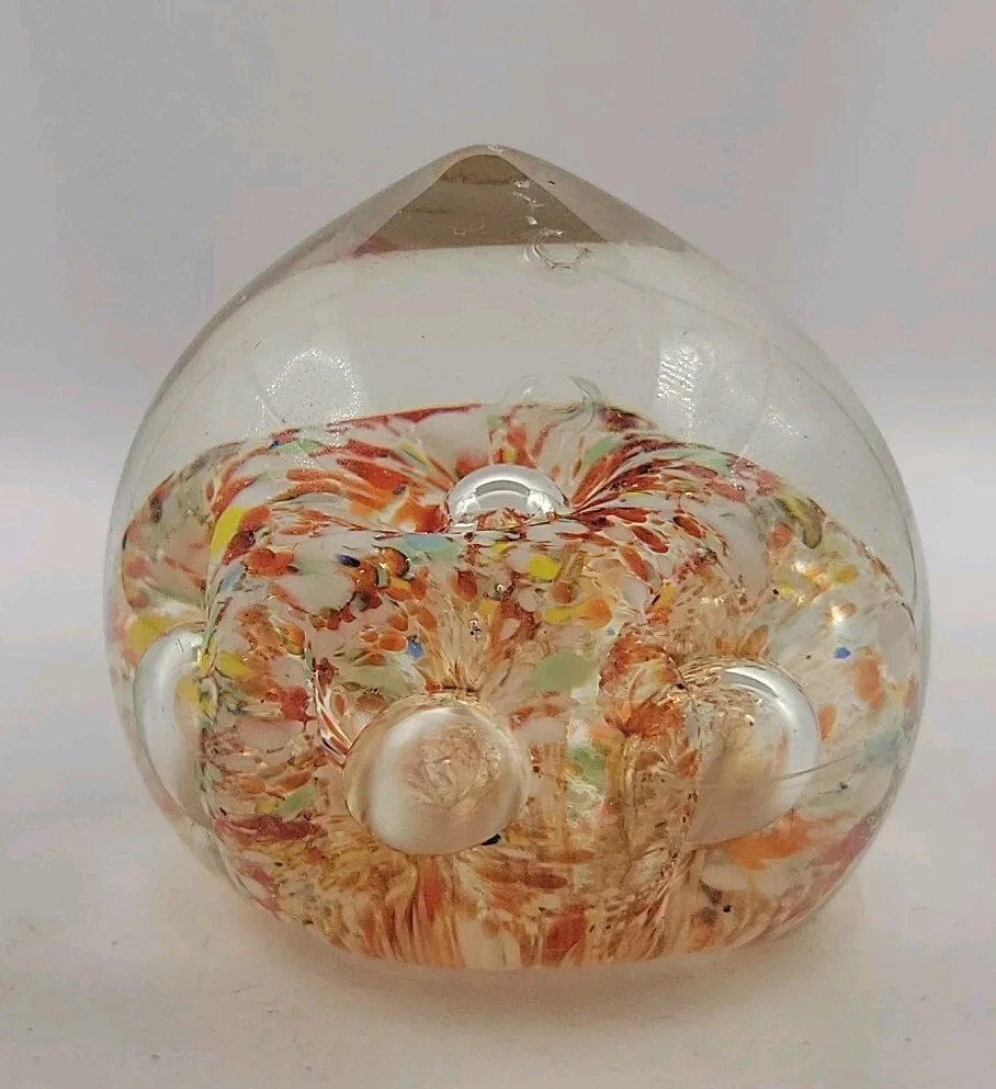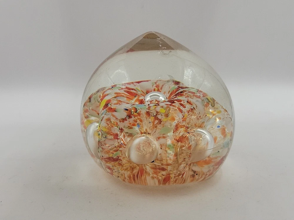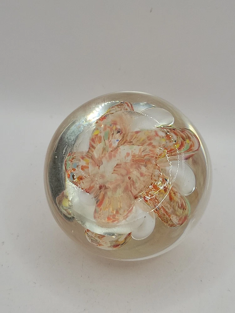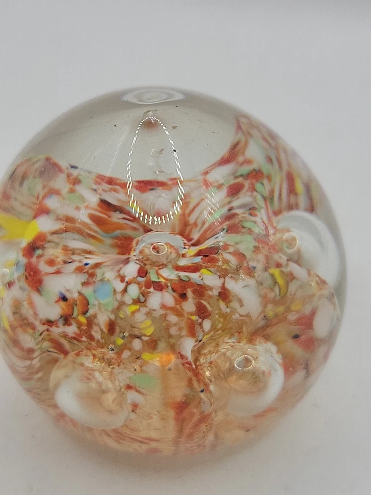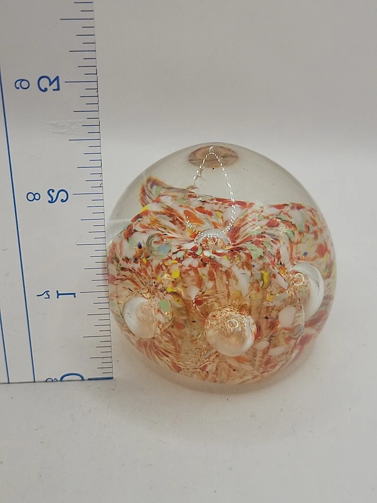 This handblown art glass paperweight features an abstract design with blue waves and a tube floral design. The red color of the glass adds a pop of color to any room. This paperweight is made of high-quality blown glass and is a great addition to any collection. The production style of this paperweight is art glass, making it a unique and valuable piece. Perfect for anyone who loves paperweights or art glass, this piece is sure to impress.