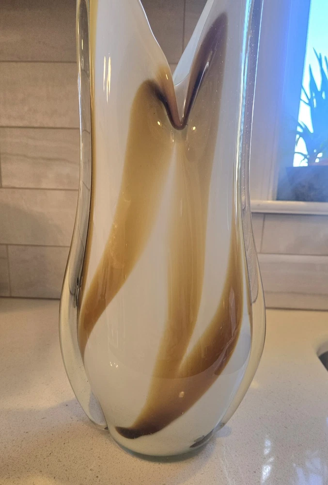 Unique swung-style glass vase with amber and white streaks. This vase is tall at a little over 15" and sleek with its curves and rounded bottom. It's heavy - around 4 lbs and the glass is thick. There is clear glass that juts out on the sides to add extra interest. Multiple bubbles can be found as well, which I believe adds character. The amber gradually lightens and darkens throughout the wide streaks. This vase begs to be put in just the right place in just the right home.